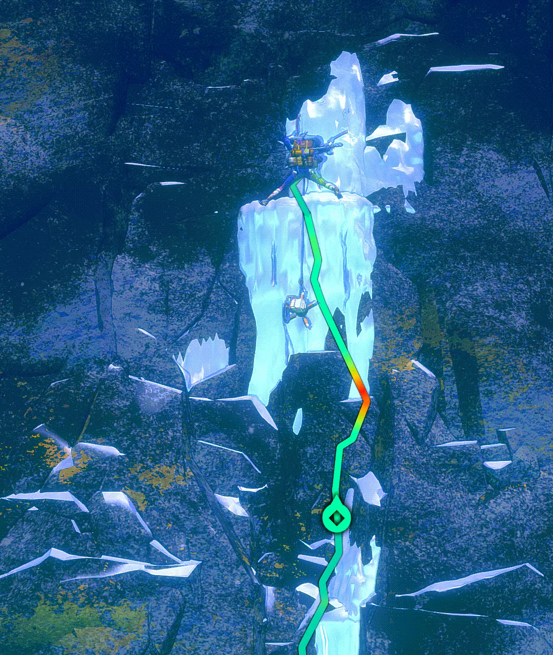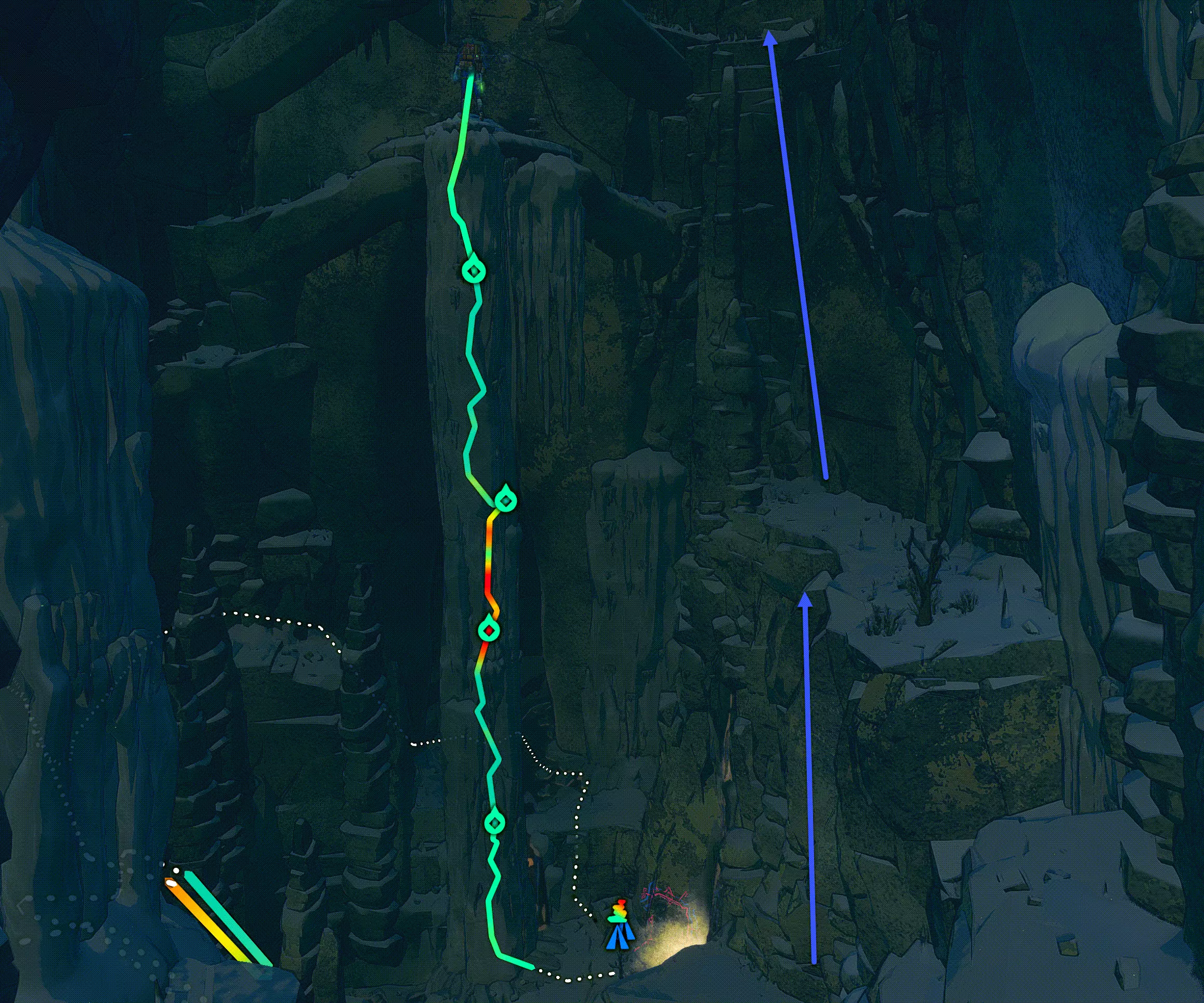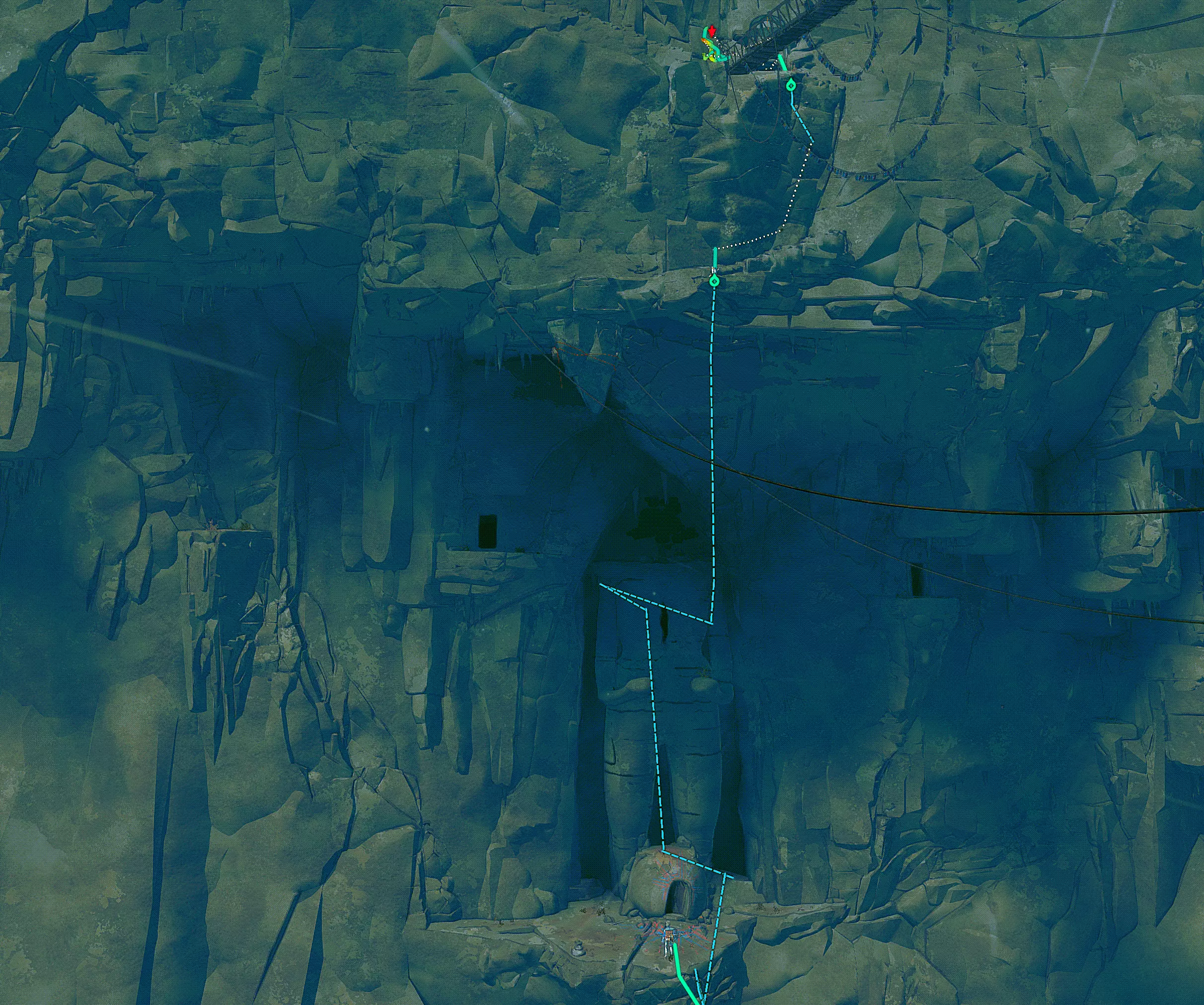 现在我们来攻克儿童雕像。到达顶部后,我们发现这里又是一片布满密集岩石的区域。如果想稳妥行事,可以在入口处设置一个固定点,然后带着绳索进入。