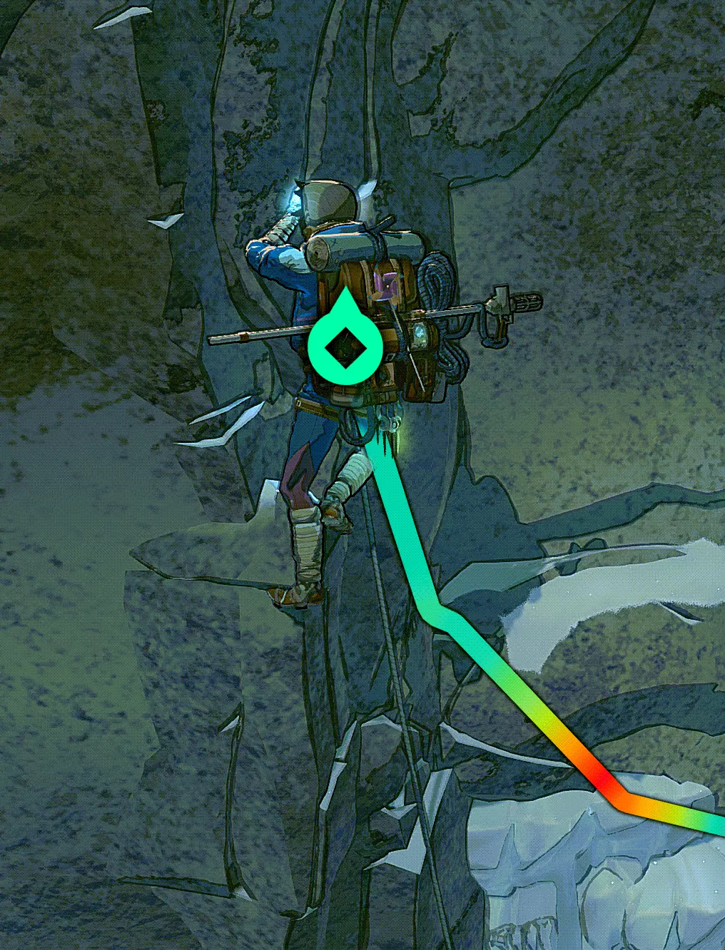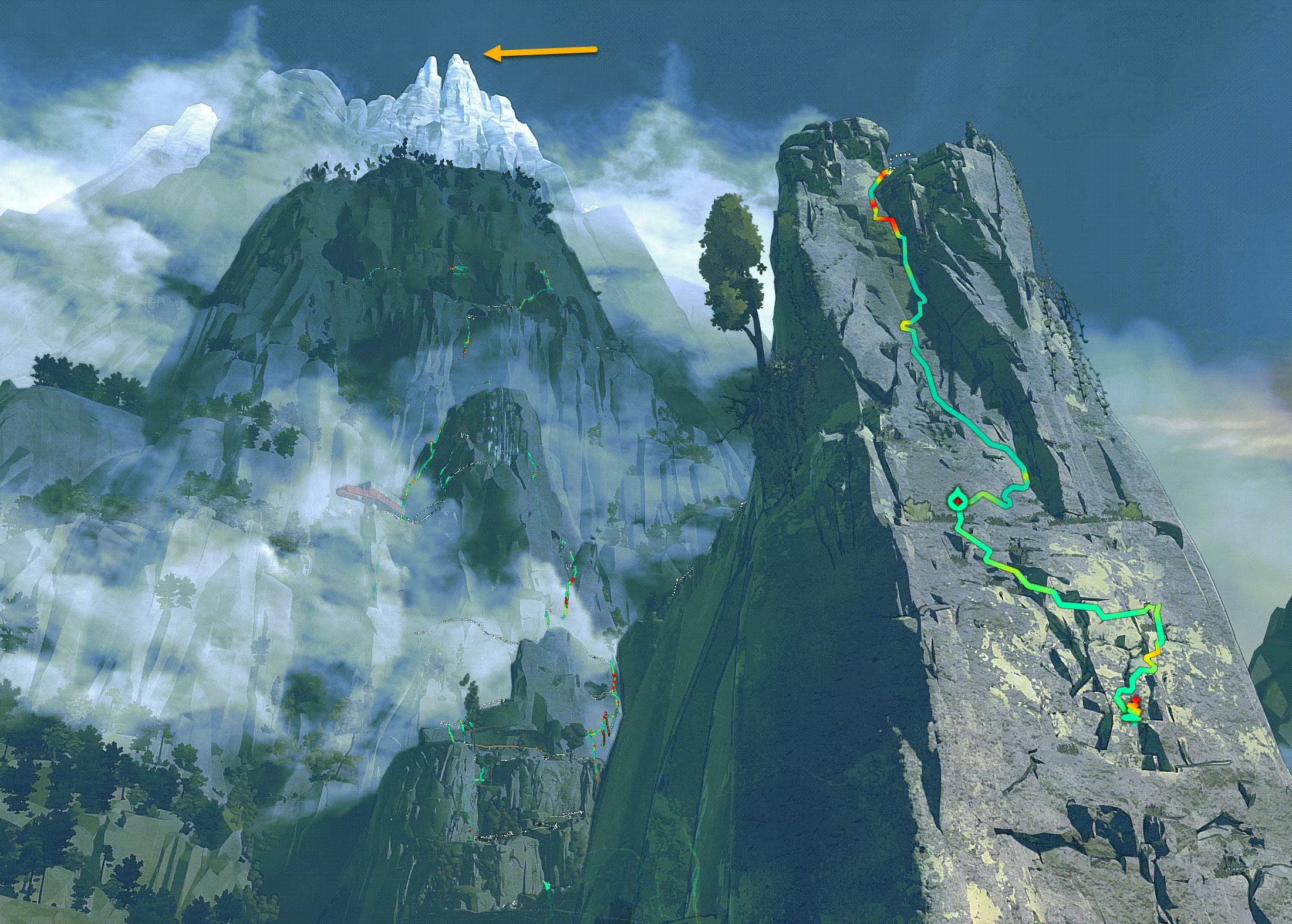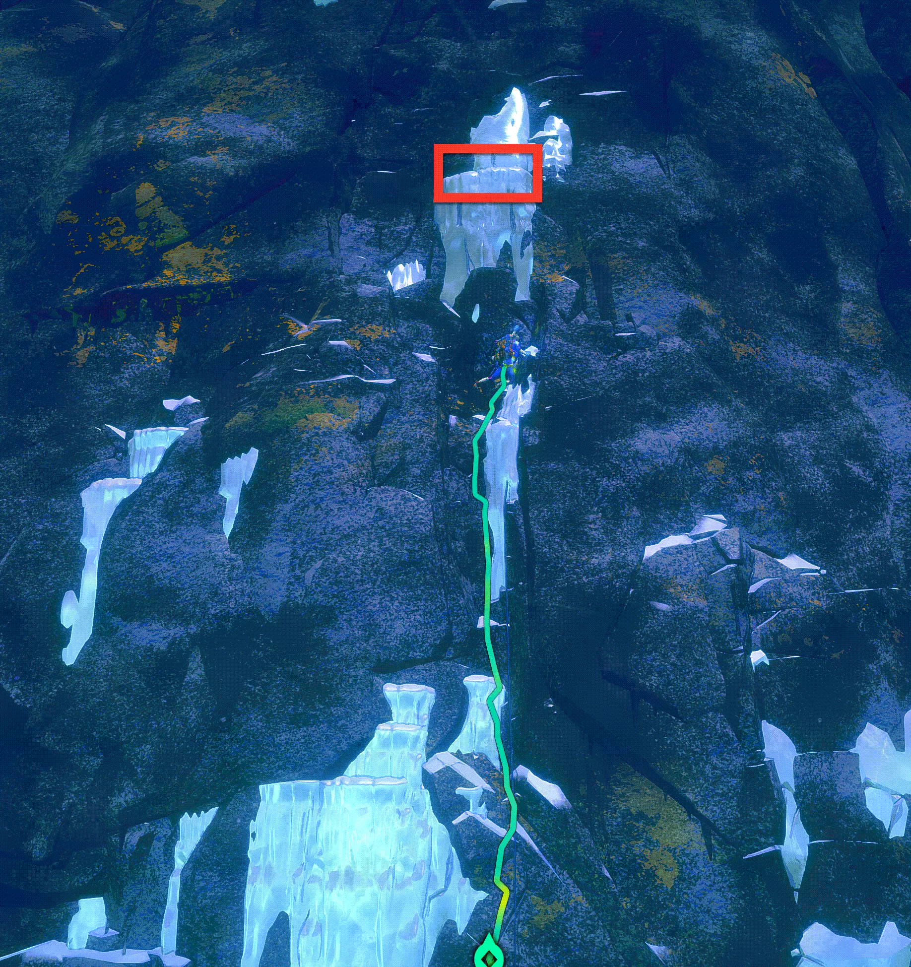 现在我们来攻克儿童雕像。到达顶部后,我们发现这里又是一片布满密集岩石的区域。如果想稳妥行事,可以在入口处设置一个固定点,然后带着绳索进入。