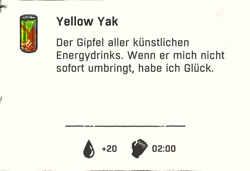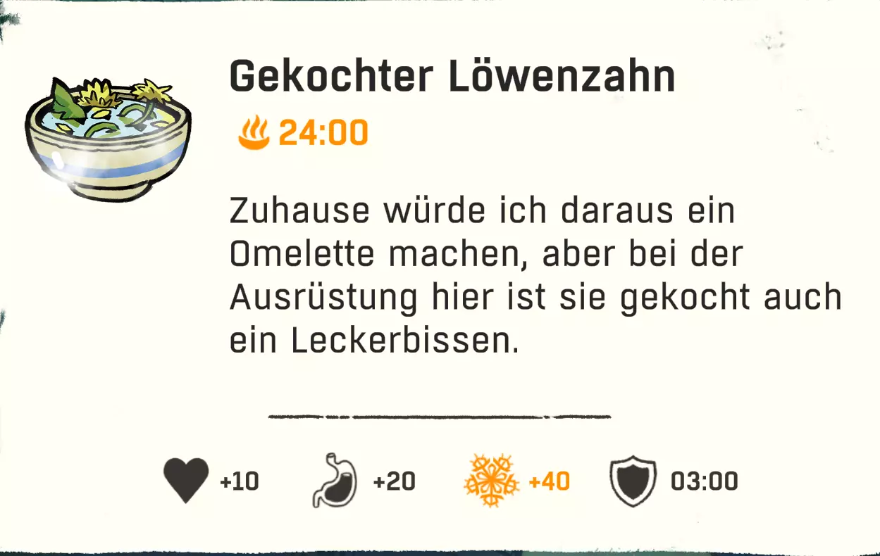 配方:1份清水/茶 + 1份蒲公英 配方(额外甜味/+10饥饿值,2分钟能量):1份蒲公英 + 1份高山可乐/巧克力饮料/树莓汁/黄牦牛饮料