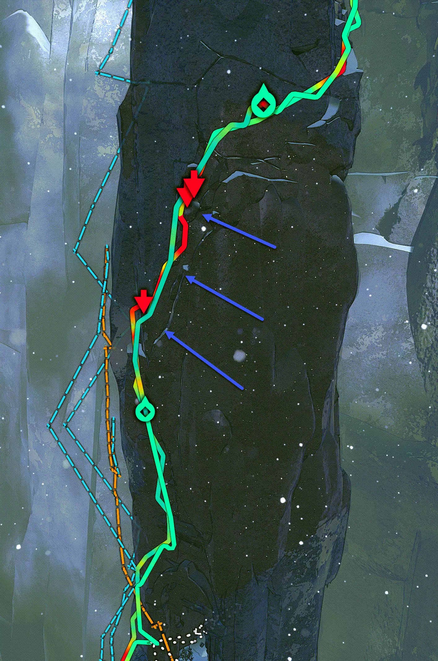 又前进了一个拐角。这次我专门标记了第二个瀑布处需要抓牢的关键位置。在下一个拐角,你们可以再次安装常规的安全装置。第一道坚固的岩壁(没有洞穴居民挂钩的那种)已经完成了。恭喜! :)