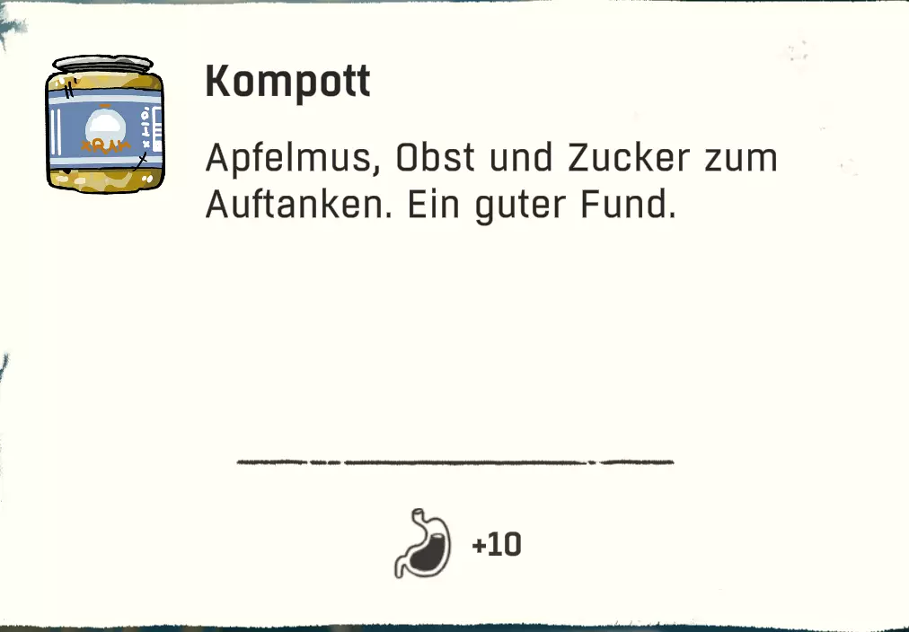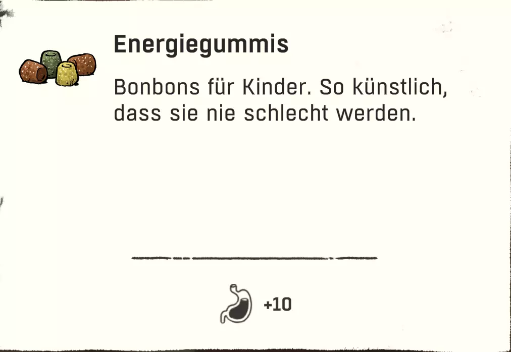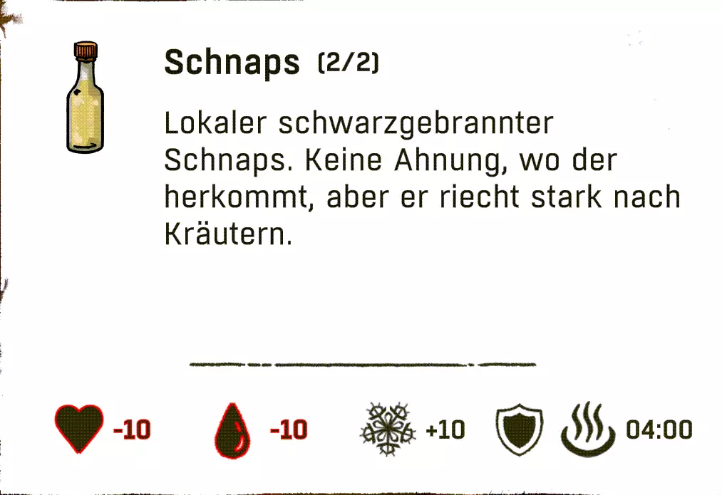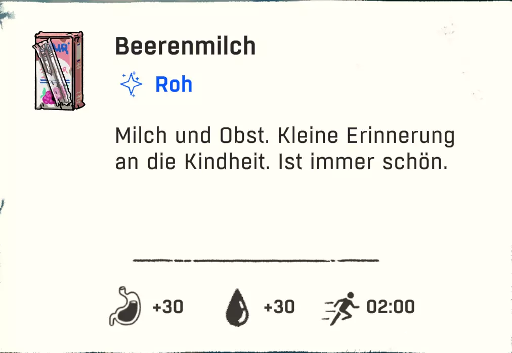 可以直接跳过扎营。通过快捷键“X”,然后按“1”就能直接在户外过夜。注意防寒。 物品:直接使用 以下列出的物品可以直接使用,因为它们要么完全不需要进一步加工或烹饪,要么并非必须进行这些操作。 药品