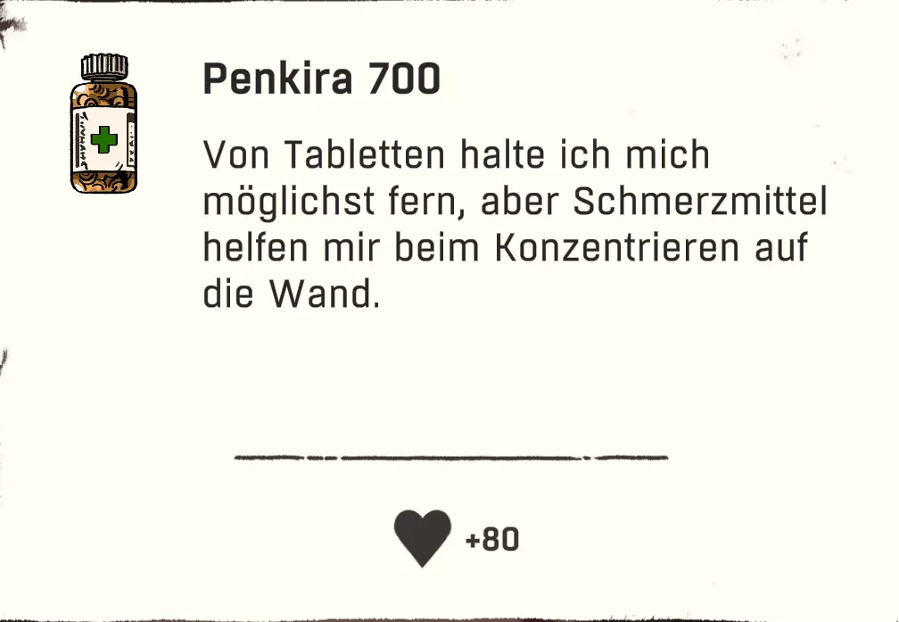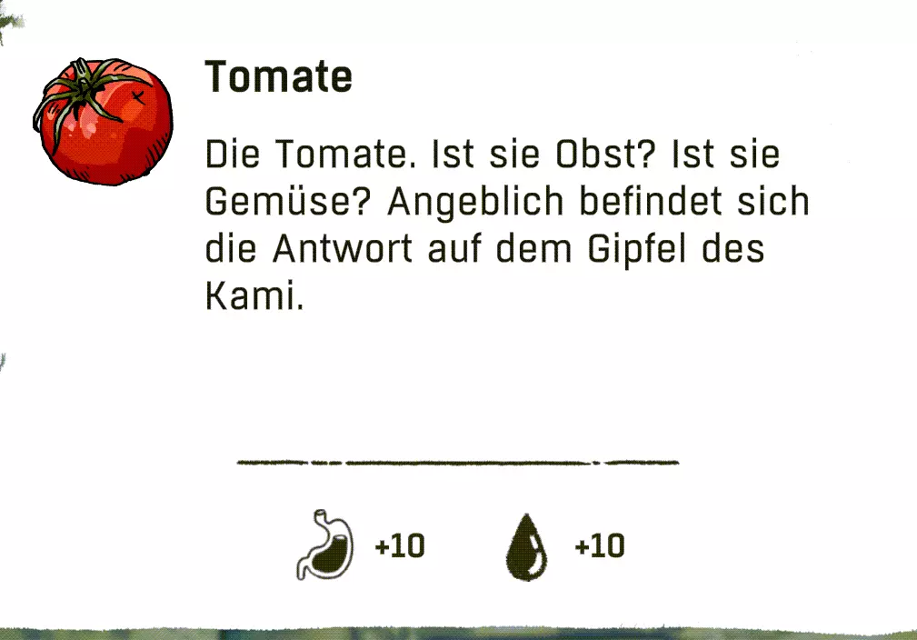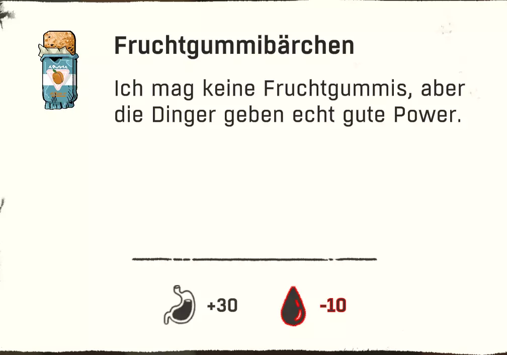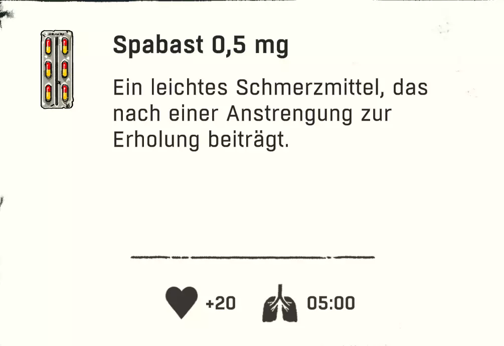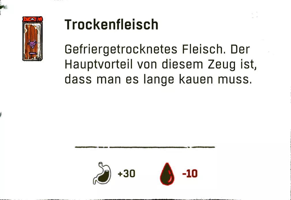 可以直接跳过扎营。通过快捷键“X”,然后按“1”就能直接在户外过夜。注意防寒。 物品:直接使用 以下列出的物品可以直接使用,因为它们要么完全不需要进一步加工或烹饪,要么并非必须进行这些操作。 药品