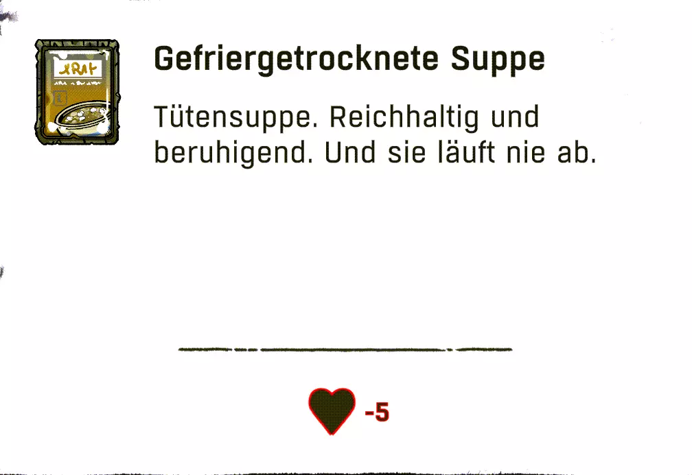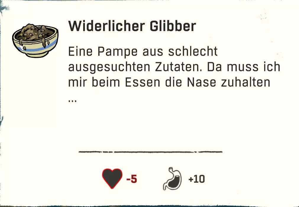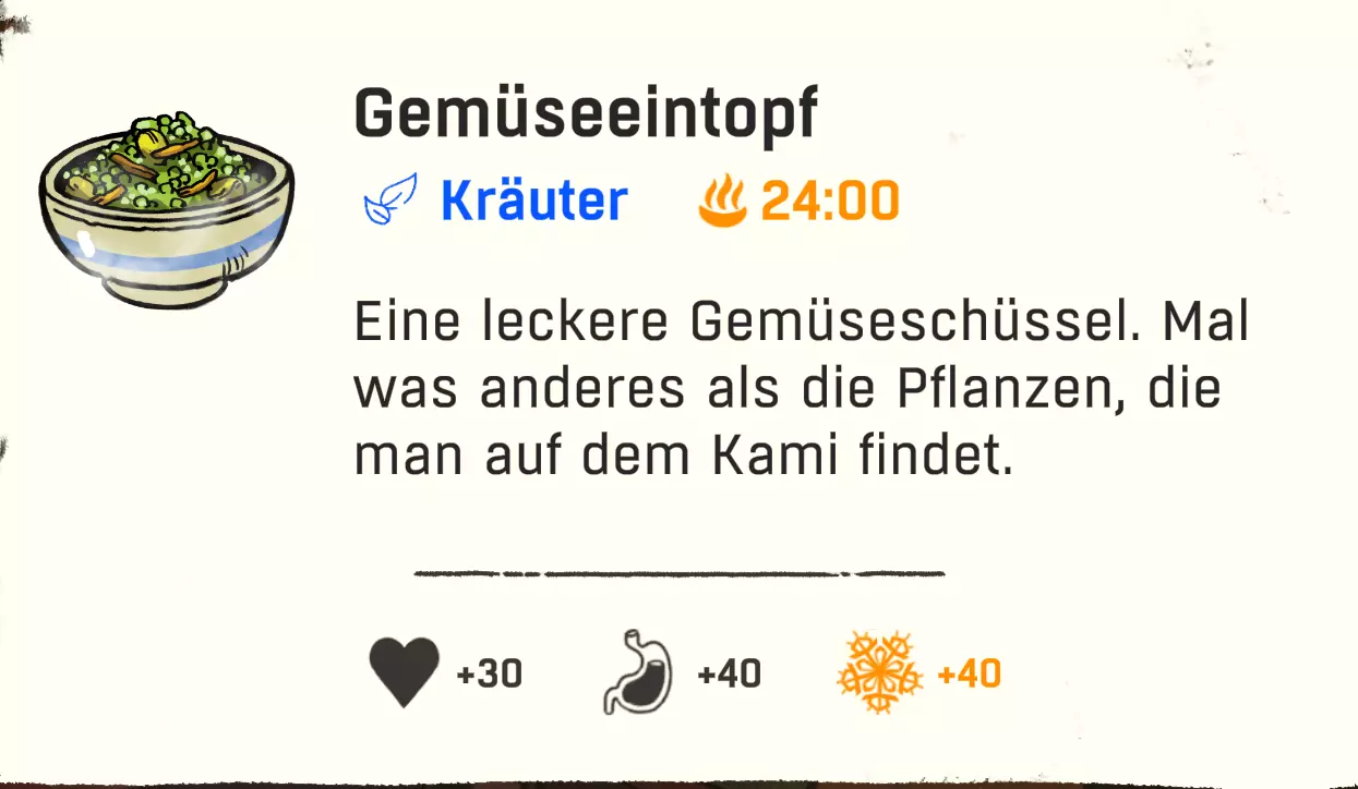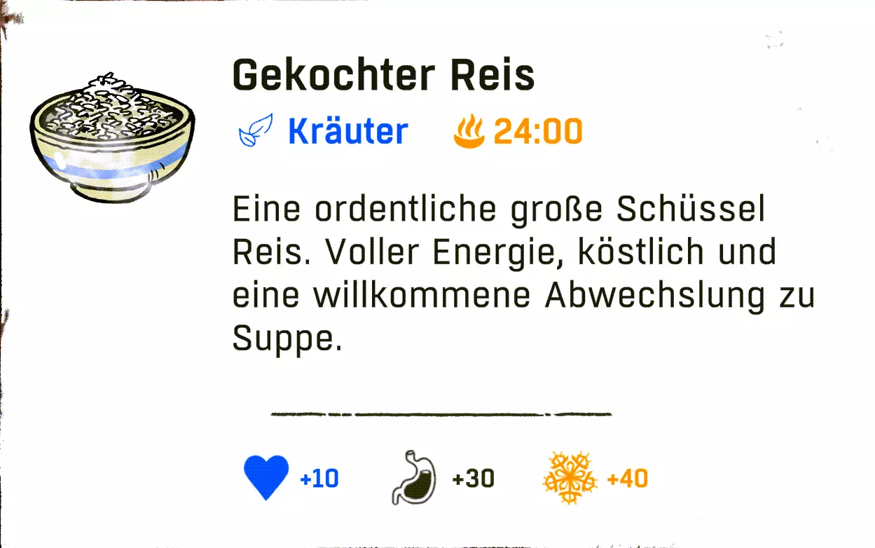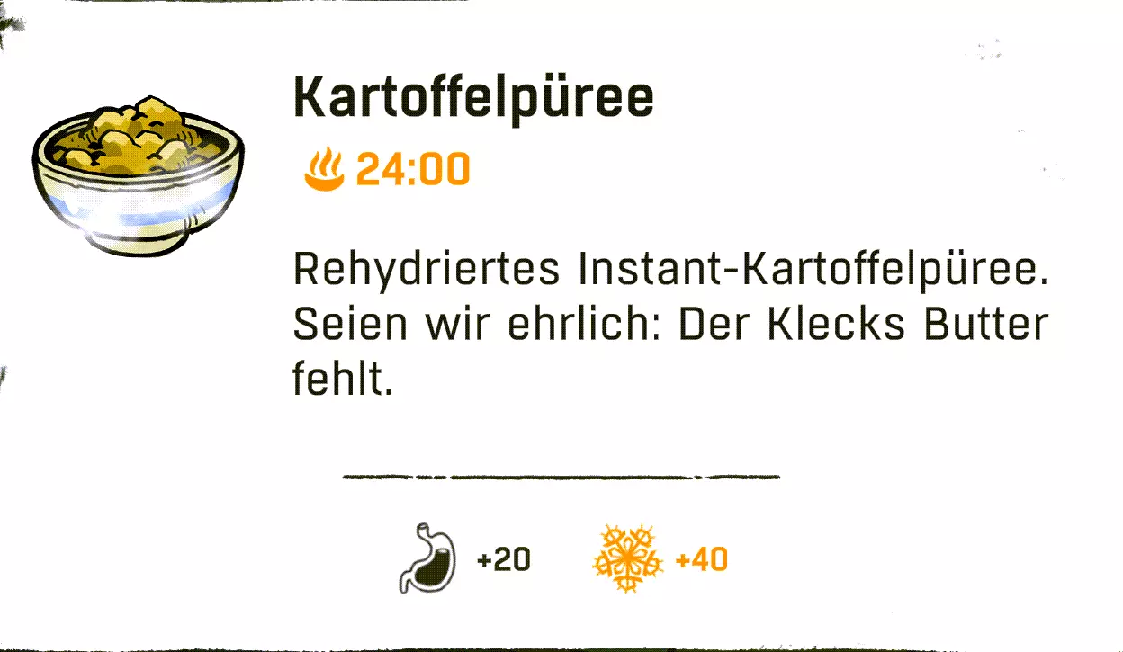 配方:1份清水/山羊奶 + 1份速食面 配方(超甜款 / +10饥饿值,1分钟能量):1份速食面 + 1份高山可乐/巧克力饮料/草莓汁/黄牦牛饮料 配方(火焰款 / +1分钟抵抗力):1份速食面 + 1份烈酒