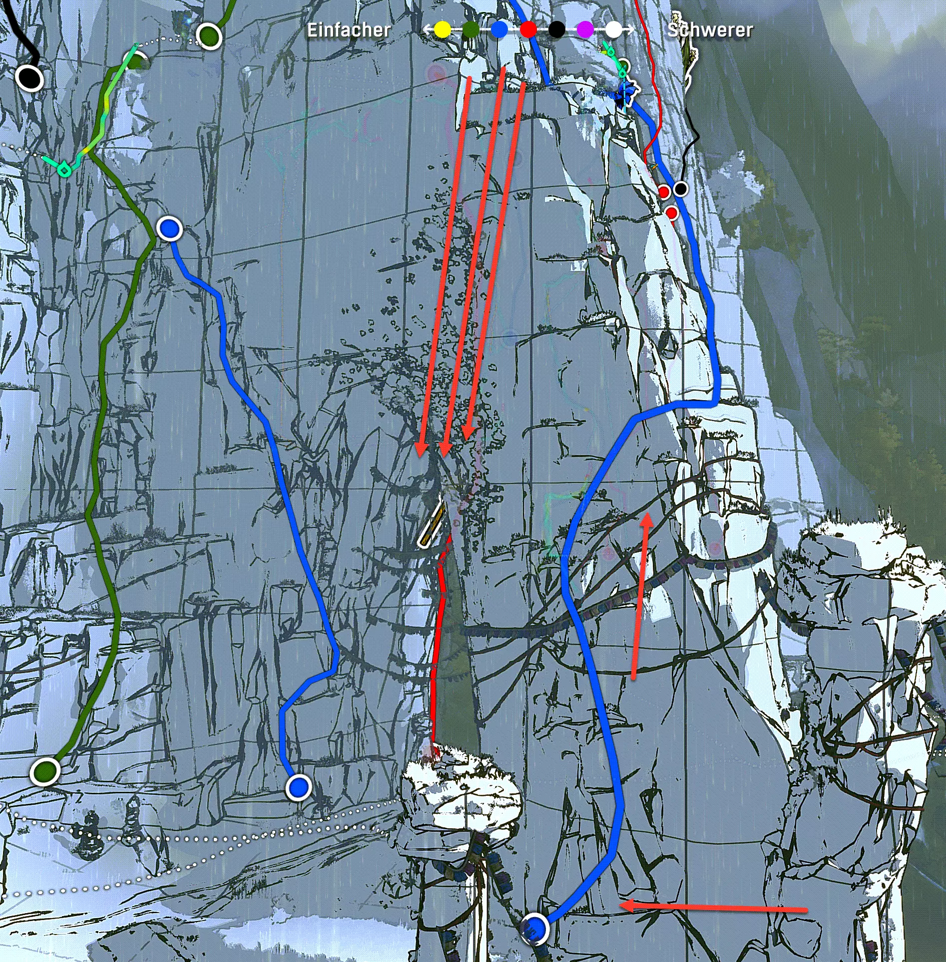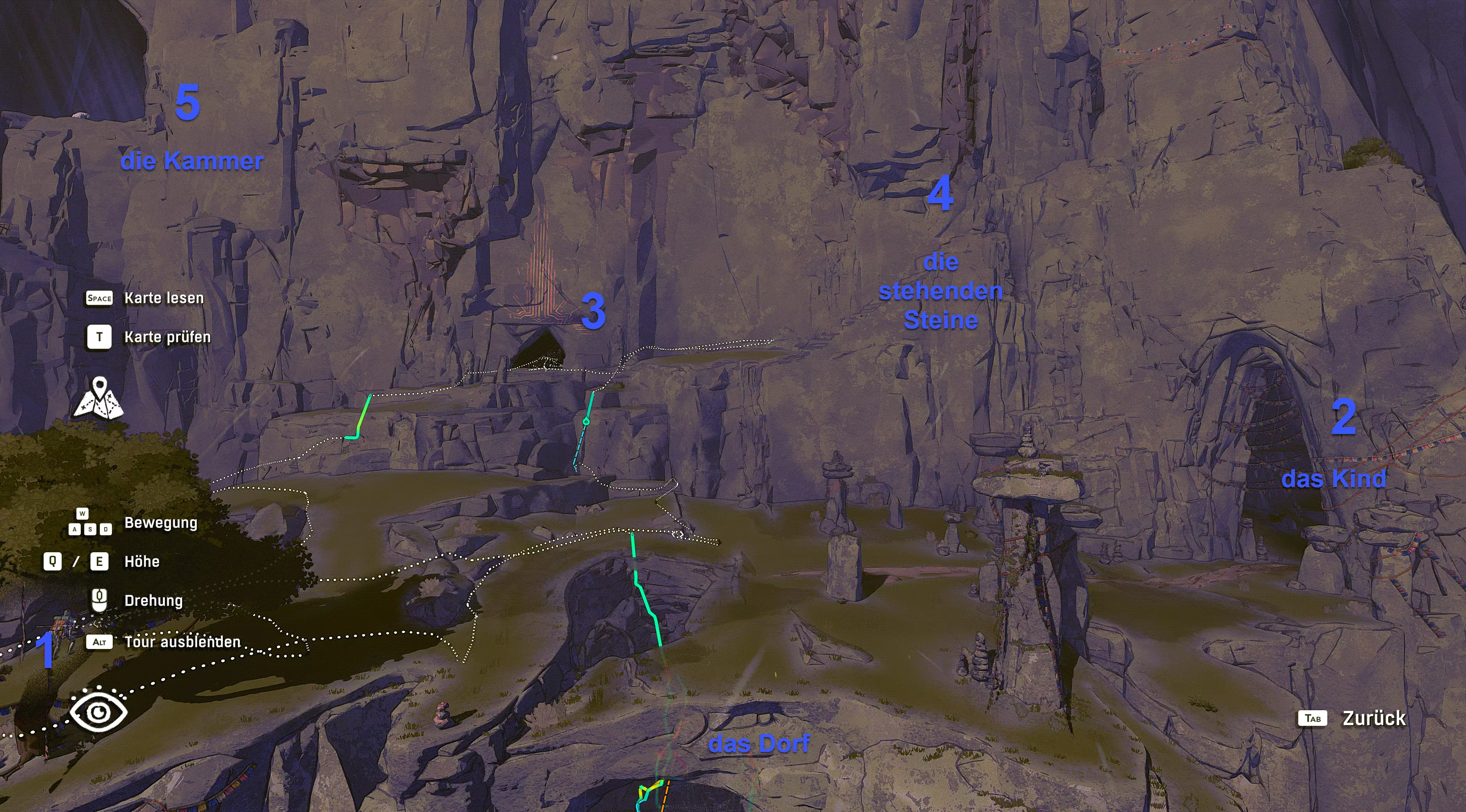 你可以在“Die Klingen”中的Damas Al Fatri(导游任务第5部分)处找到Bergreis食谱。 所有区域的顺序 在指南中我会反复提到一些地点,比如“Das Kind”。 这里列出顺序,以便你更好地判断它们各自的位置,或者以下是如何达成某些目标的说明: 攀岩馆 - 攀登大厅(教程区域) 天膳(训练地图) 扭曲山脊 - 扭曲山脊(游戏序章) 悬崖峭壁 - 悬崖 石拱门 - 石拱门(具有两个下一区域分支的存档点) 分裂岩石 - 分裂岩石(右侧 - 祭奠逝者) 捷径 - 捷径(左侧 - 索道站) 瀑布 - 瀑布 村庄 - 村庄(水晶洞穴 -> 困难路段) 孩子 - 孩子(导游指南第一部分) 立石 - 立石(导游指南第一部分) 地穴 - 地穴(导游指南第二部分) 梯田 - 梯田 马可在这里搭起了他的帐篷 两百级台阶 - 两百级台阶 这里问候老熊——远古者(攻略指南第三部分) 风之宫殿(攻略指南第四部分) 危险区域——险境(困难路段) 穹顶 必须喝完所有水的区域 尖针峰(困难路段) 秘密(攻略指南第五部分) 利刃(攻略指南第五部分和第六部分第一节) 冰塔之海(攻略指南第六部分第一节) 无瑕者(攻略指南第六部分第二节) 神(山顶)(攻略指南第六部分第二节) 剧透:攻略指南第一部分(孩子与立石) 这里为大家展示容易遗漏地点的攻略流程: