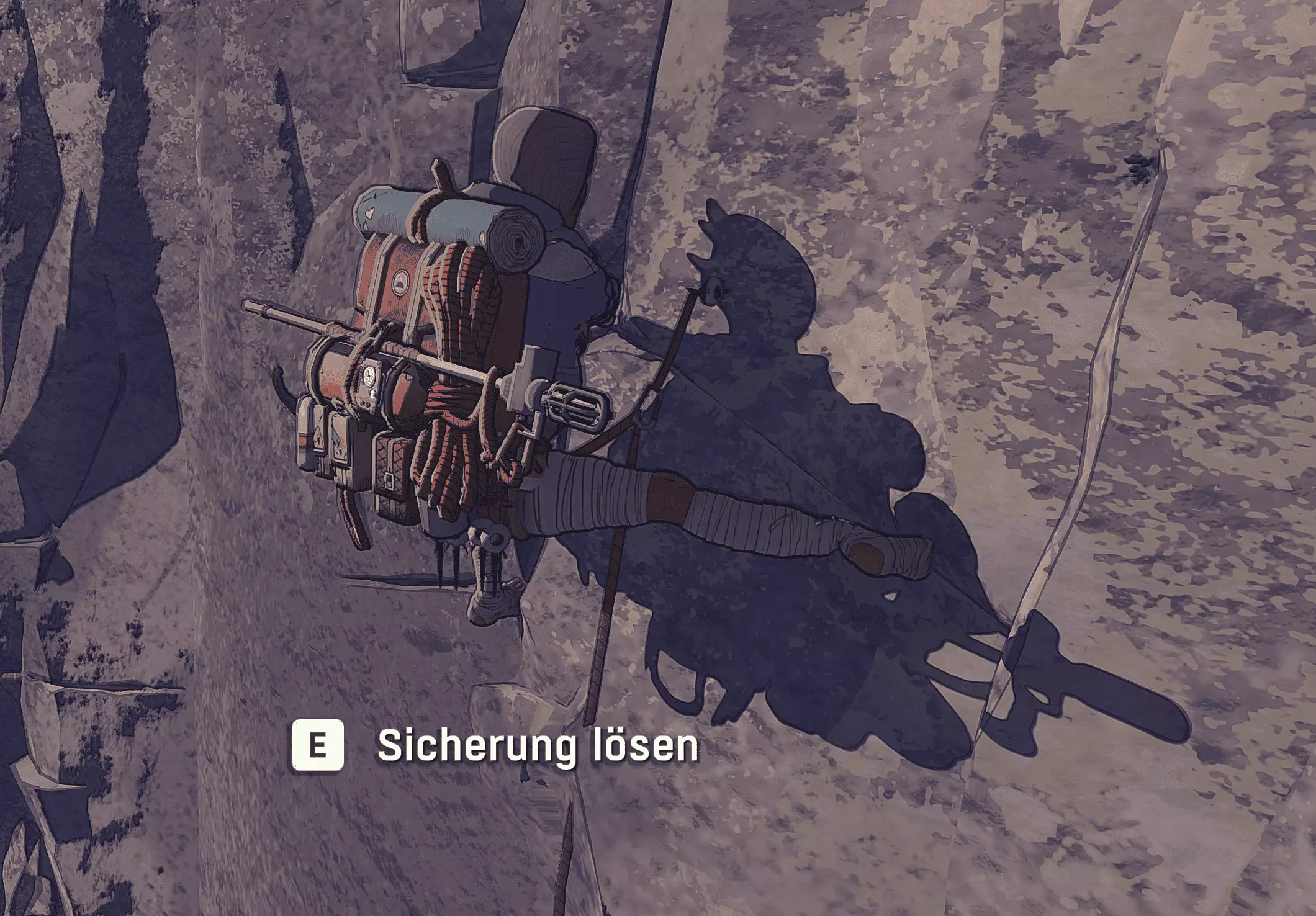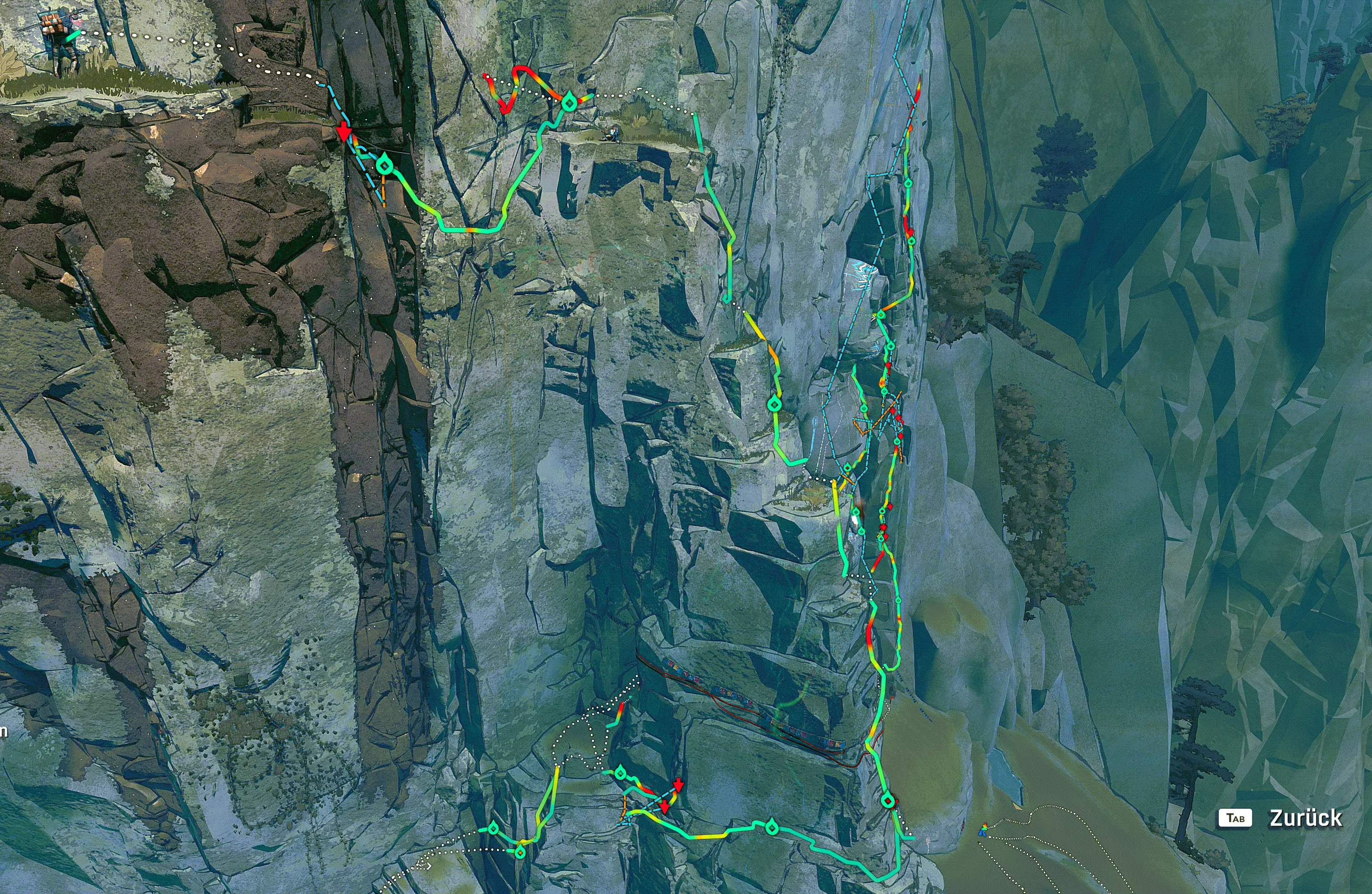 使用你的装备:除了水壶外,攀爬时你可以随时设置安全绳。如果坠落,安全绳能让你重新爬上去。解开安全绳时,你会被拉向挂钩,同时耐力会恢复。只有在这种状态下,攀爬时才能完全使用背包。到达顶部后,站在坚实地面上按Q,然后走向攀爬机器人,即可回收安全绳。此外,粉笔也不容忽视,它能让你接下来的12次抓握更稳固,同时对耐力的消耗也较小。绳索下降 当你站在悬崖顶端想要下去时,按【E】键选择“下降”选项,艾娃会在岩石上打入一个固定点,让你能安全到达地面。 正确使用安全绳 相信我,你肯定会掉下去的。掉下去后,你可以按【Shift】+【W/S】键重新向上攀爬,或者在需要时下降。按【空格】键可以适当向下跳跃。如果绳子在一个开阔的突出处,你还可以摆动绳子来抓取挂在墙上的物品。