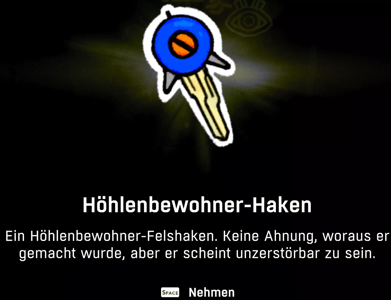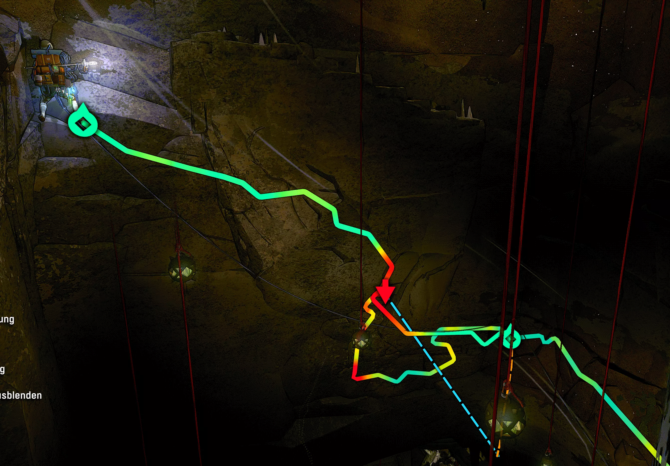 到达宽敞的空间后,你们会立即发现几样东西。地面中央有一个吊坠。不过最重要的是第一个洞穴居民挂钩。有了它,我们现在可以在坚硬的岩石上凿出一个单独的固定点。