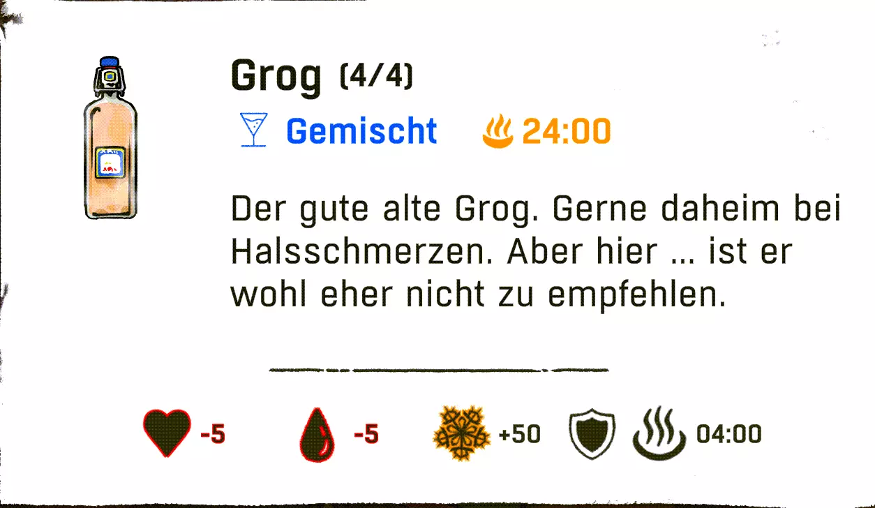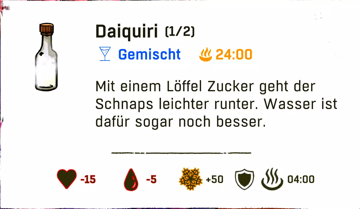 配方:1份烈酒 + 1份蒲公英 酒精类 所有酒精配方效果如下:+5生命值,-5水分,+10温度,+4分钟抗性/温度