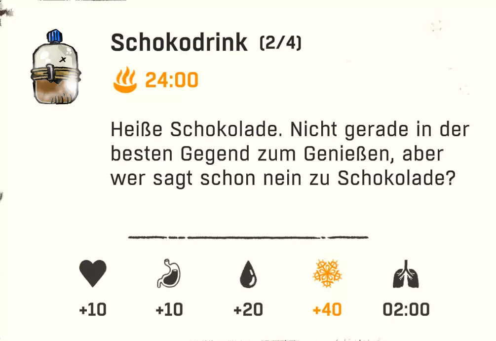 配方:1份纯净水 + 1份巧克力 配方(超甜款 / +10饥饿值,1分钟能量效果,1分钟专注效果):1份巧克力饮料 + 1份焦糖/蜂蜜勺/树莓 配方(浓郁款 / +10生命值,+20饥饿值,+2分钟专注效果):1份巧克力饮料 + 1份巧克力