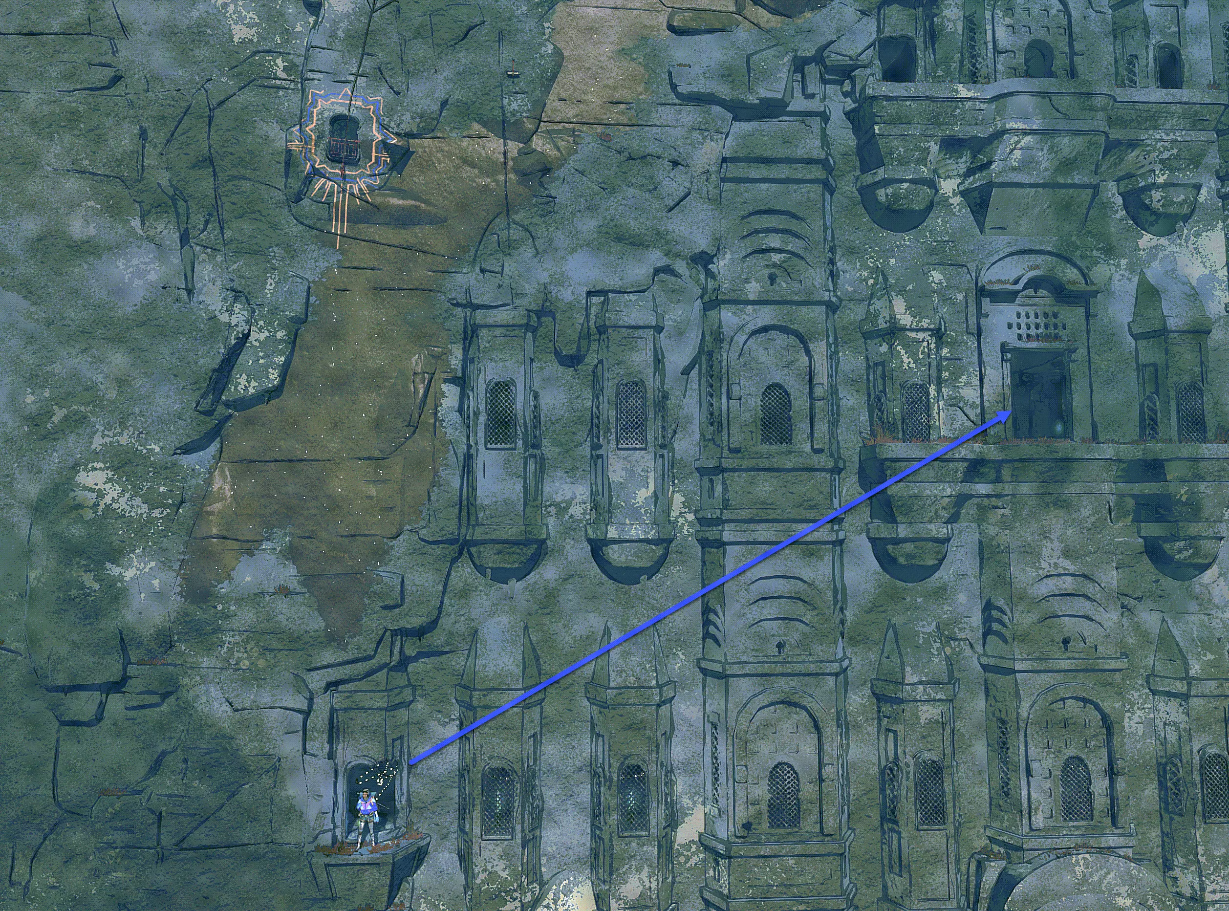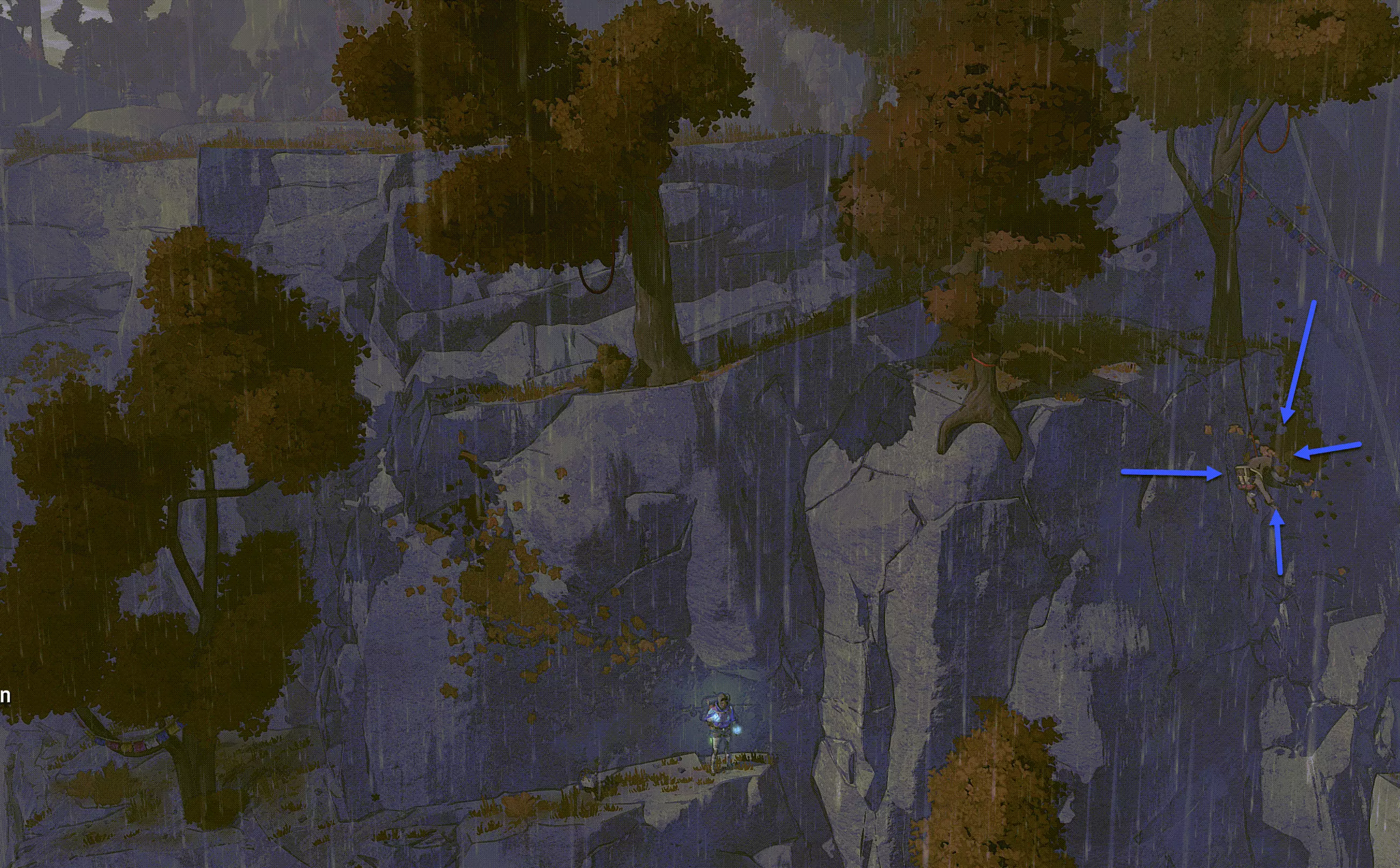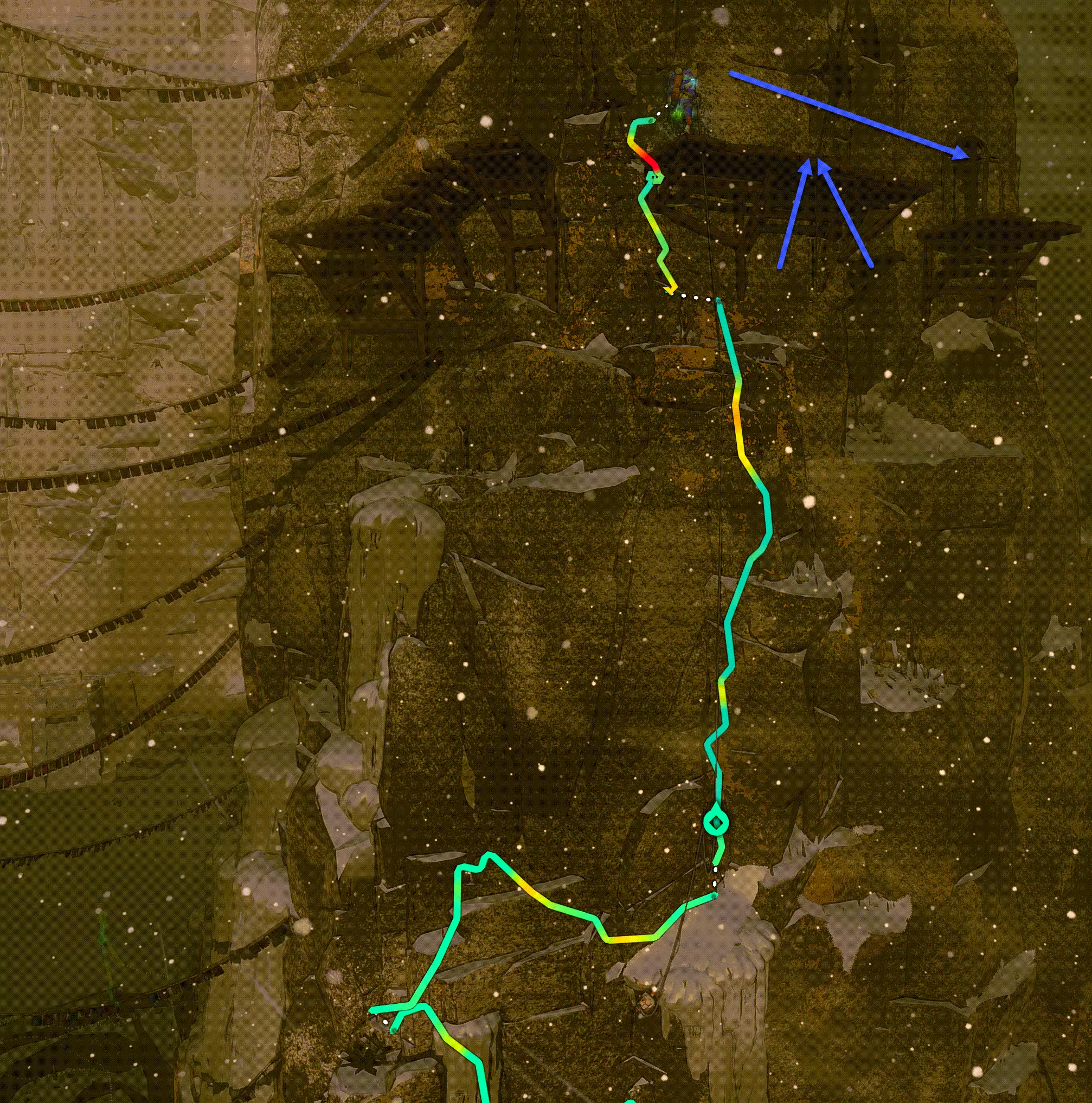 在我看来,游戏中最难的成就最好在【拱门】区域完成。关键是必须一次性攀爬30米,期间不允许设置安全点、通过食物获得增益效果,也不能在中间平台站立。按照蓝色箭头指示,沿着右侧边缘向上攀爬。 在探索者难度下几乎无法完成该成就,因为还不能使用“Q”键的技能。但从登山者难度及更高难度开始则可以。最后不需要再次站立,当你爬到我上方的死亡点时,成就就会解锁。 其他成就