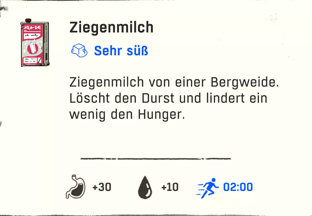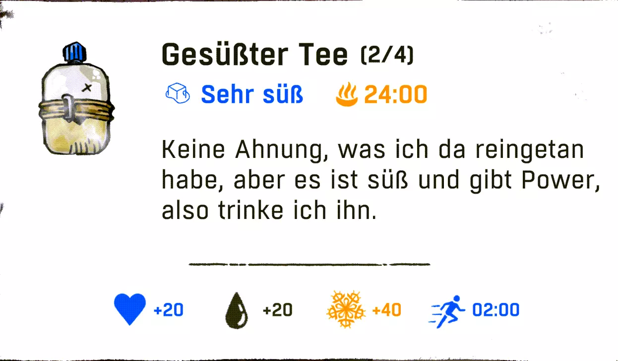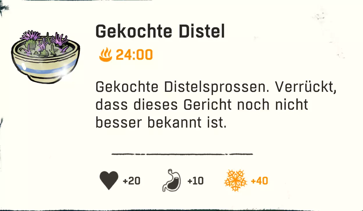 配方:1份清水 + 1份蓟 配方(额外甜味 / +10饥饿值 +1分钟能量):1份煮蓟 + 1份高山可乐/黄牦牛饮料/巧克力饮料/树莓汁