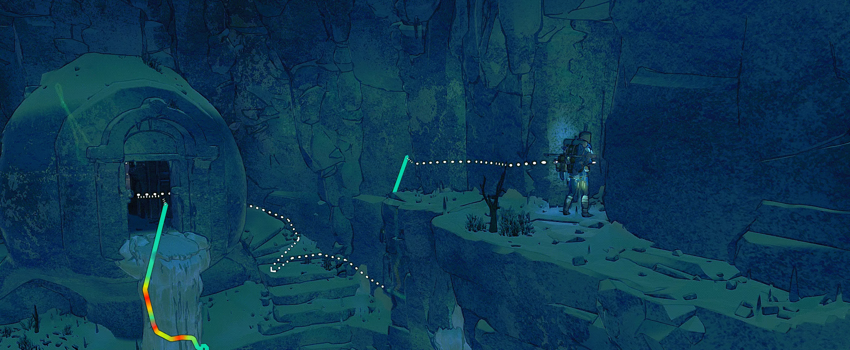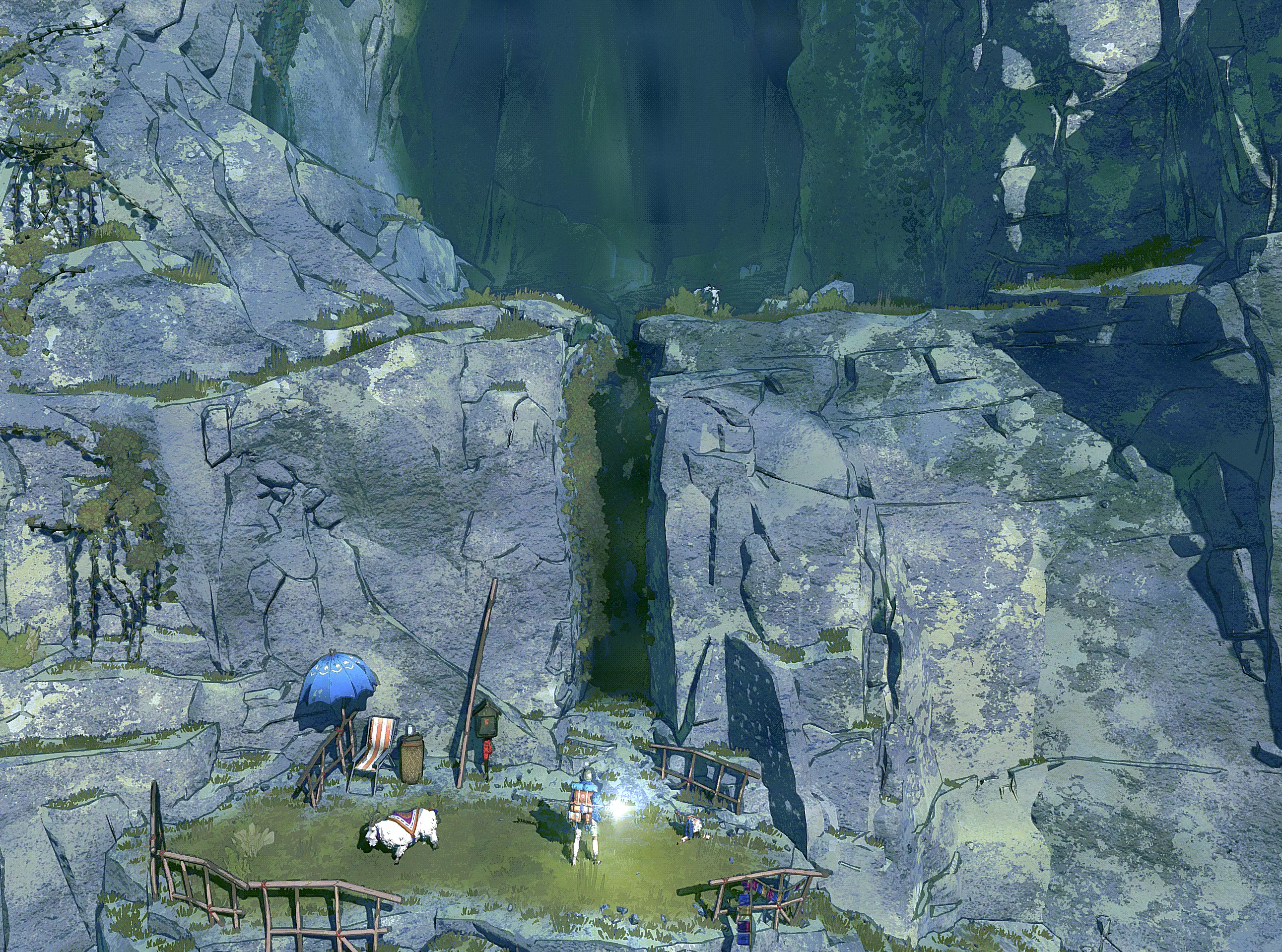 如果你之前在村子里收集过洞穴居民的地图,就能看到攀岩路线。 穿过下方的拱门,带上路上的植物。尽头有另一个存档点(藏在地图边缘,一个有补给的帐篷)。 孩子