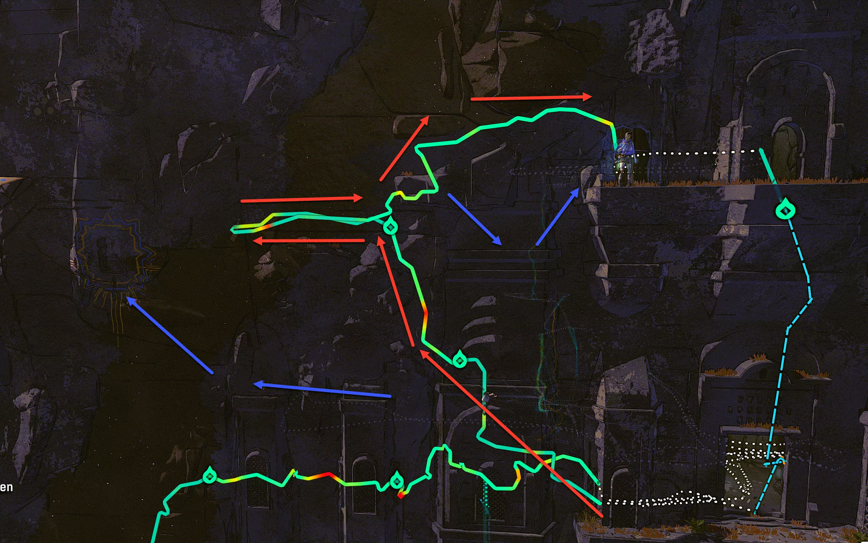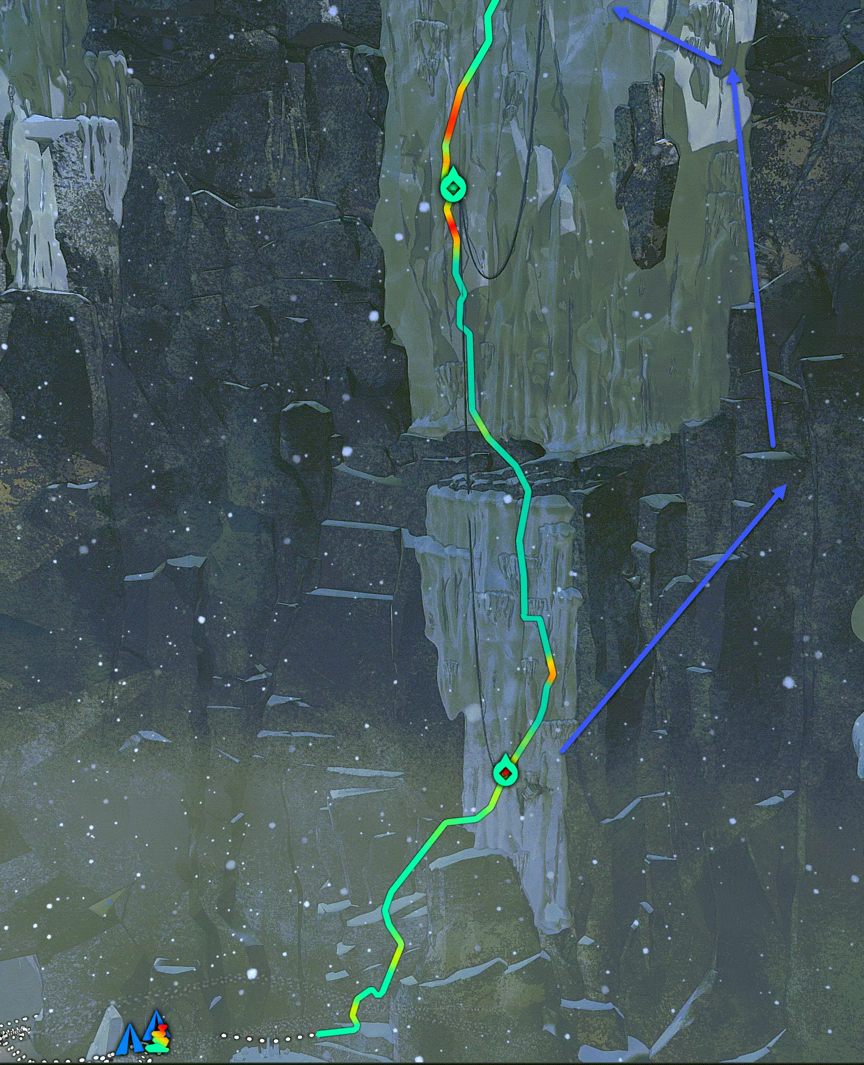 上一段路除了瀑布那段都还算顺利。红色路线只是返回的路,因为我忘了给你们截图。:) 至于怎么过瀑布,我是把手伸进“上帝之手”里(也就是真的把它放在瀑布里的空无一物之处),然后用腿快速朝着对面蓝色标记的箭头猛地一跳过去的。
