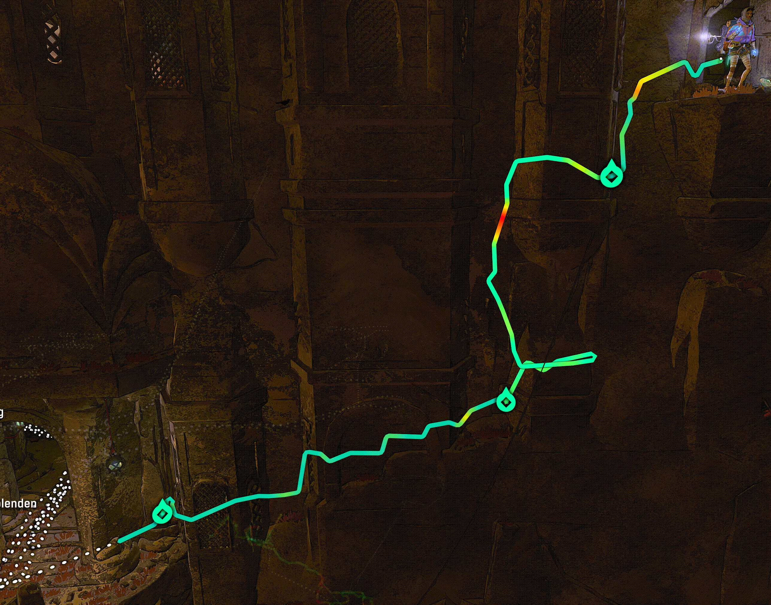 在这里我们已经发现了下一个目标,但从这里无法到达。绳索的最大长度大约到儿童雕像头部的高度。如果还没完成的话,你们可以在这里获取成就。