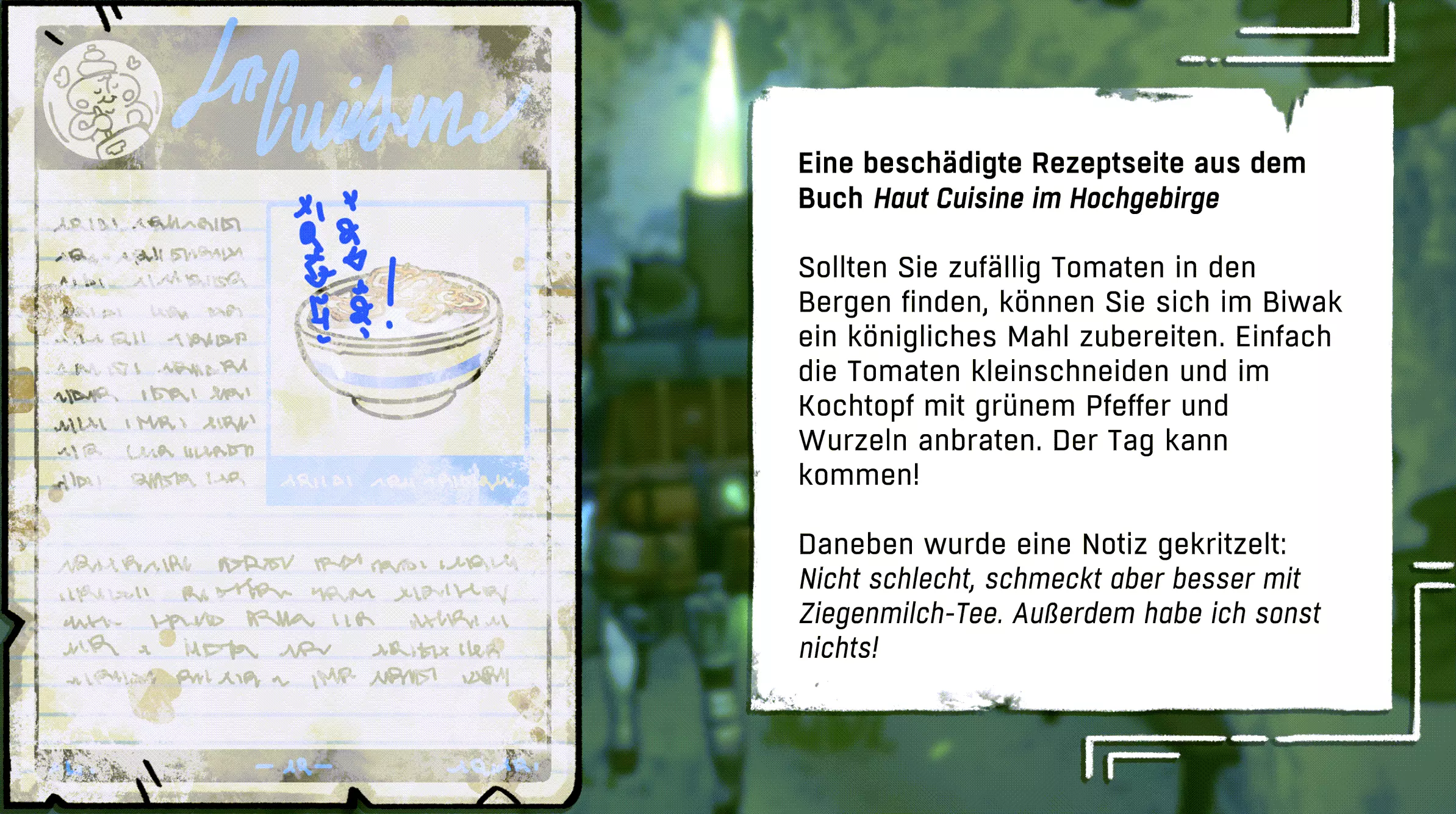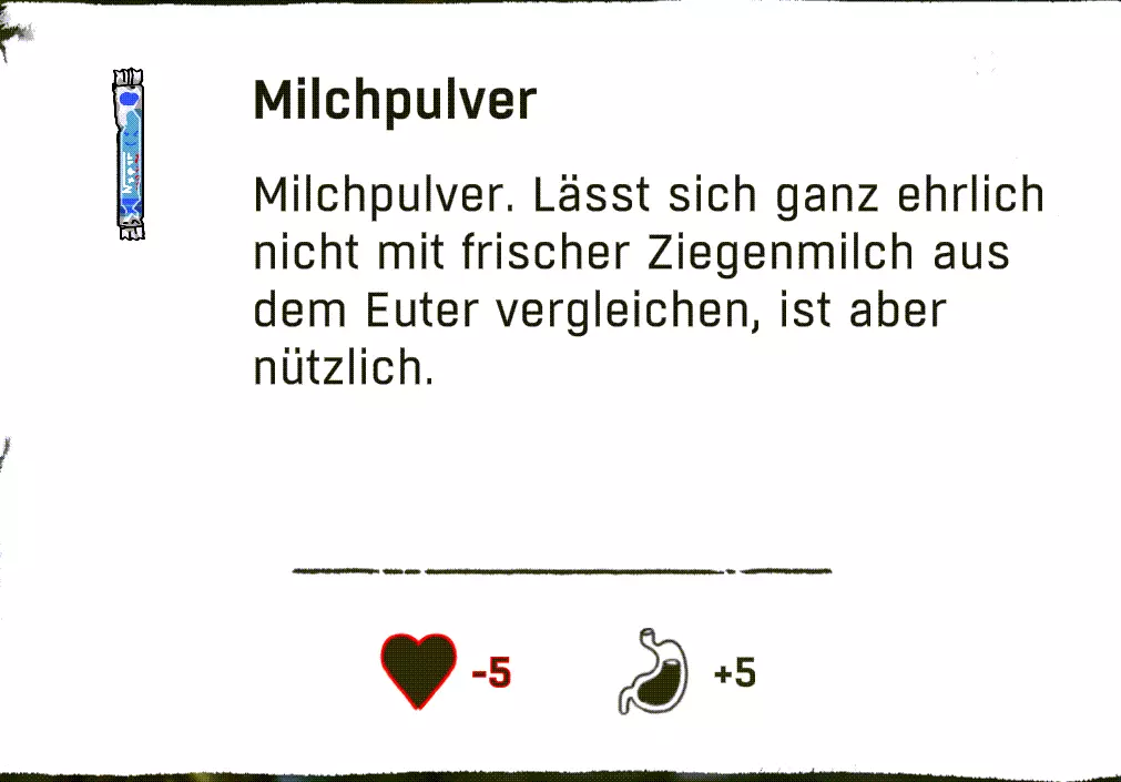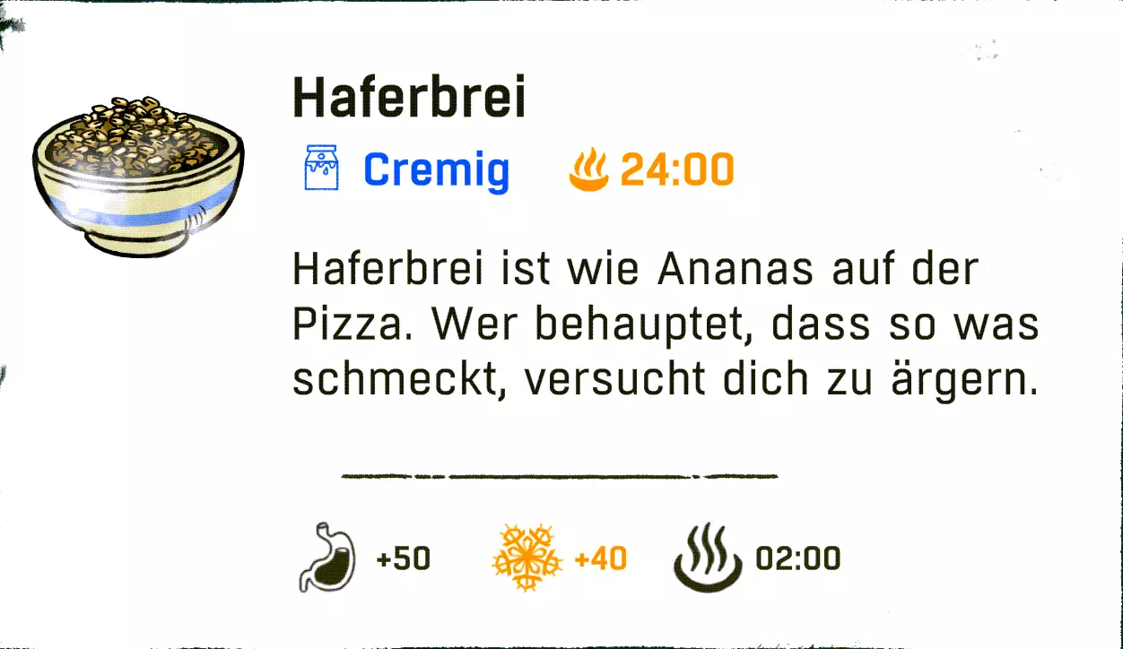(顺便说一下,在这里读到山姆·波特·布里奇斯#死亡搁浅的人,都很棒)。 在住所下方,我们可以找到一份食谱和其他有用的零食。保温壶能让我们无限期地保持饮品温暖,在游戏后期非常珍贵。最好马上在存档点前的山羊那里试试,从它那里我们能得到优质的山羊奶。 你们不妨休息一下,尤其是当你们还有燕麦片的时候。只需和山羊奶混合,就能做出美味的燕麦粥。好吃 :)