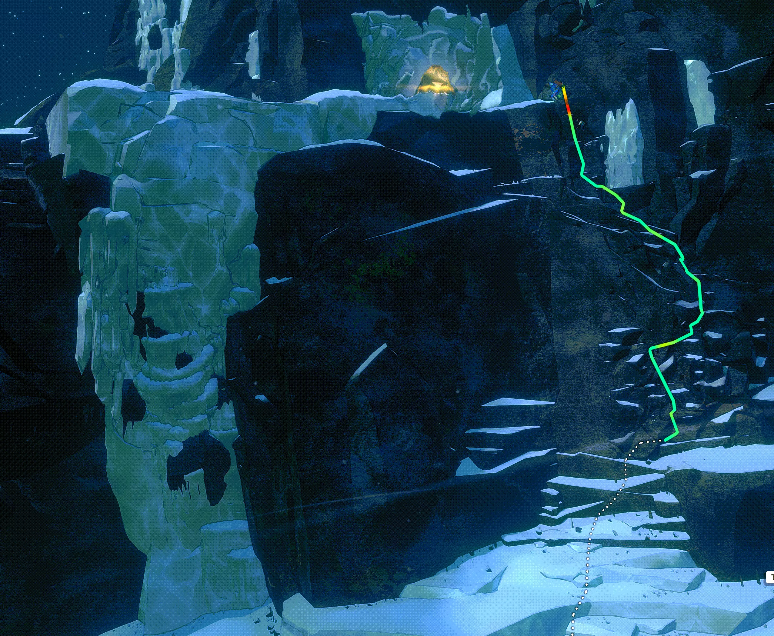 很遗憾没有拍照。不过当你在【村庄】中战胜水晶洞穴后,会获得发光手套。尤其是在夜晚,效果非常惊艳。如果遇到困难,可以在【困难路段】中找到我的路线。