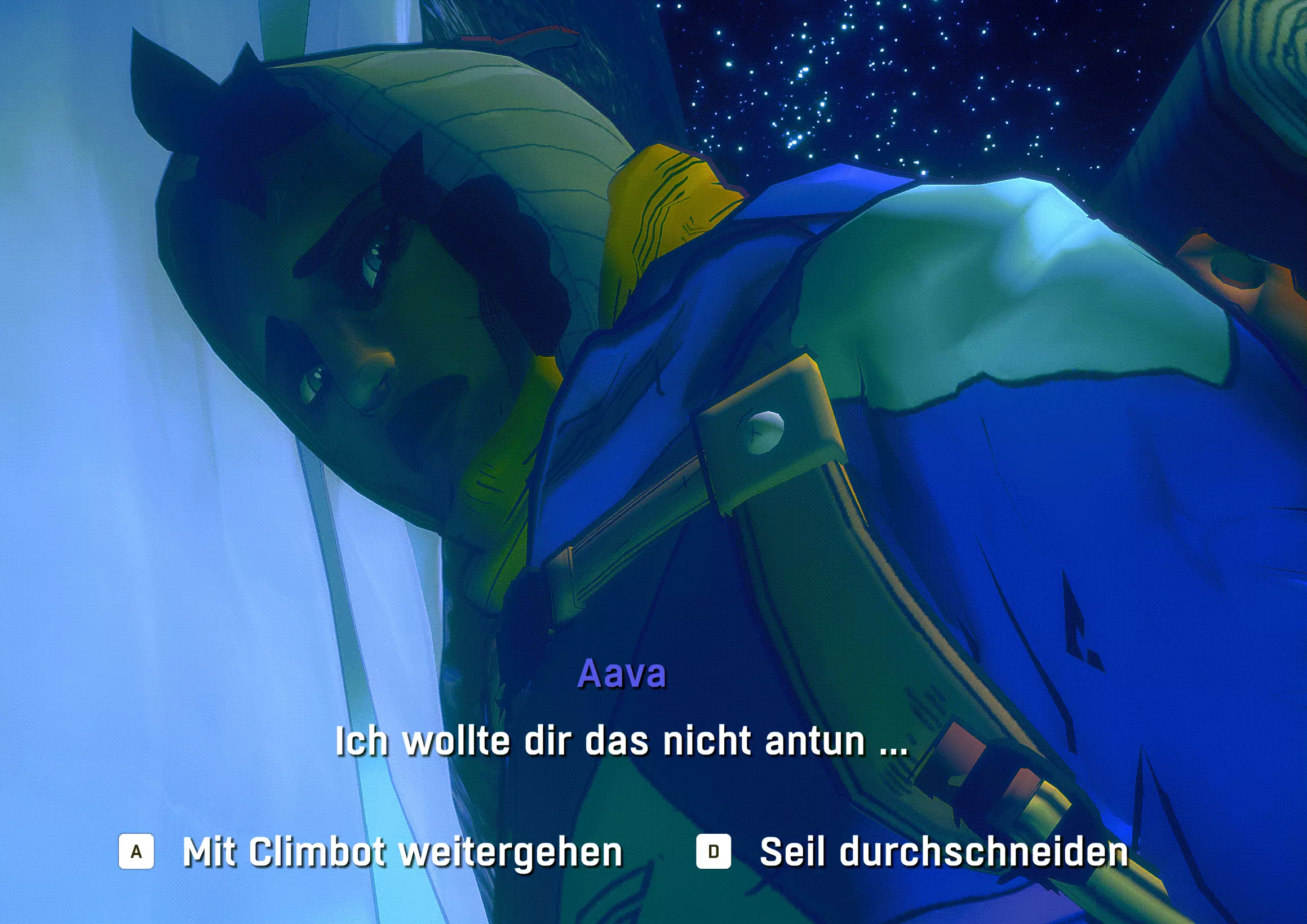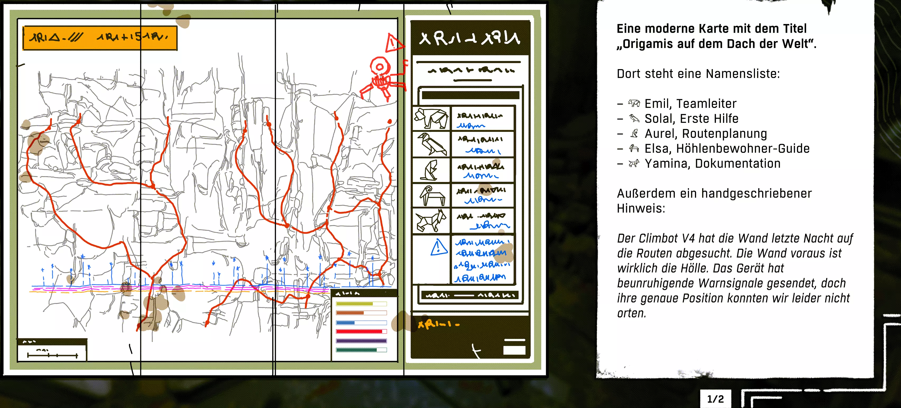 5. 信息站会为你提供剧情提示和教程提示。红色绳索标记了游戏中的重要区域。 6. 当你意识到自己快要抓不住时,任何安全措施都为时已晚。阿瓦(Aava)往往无法及时安装好安全装置。这时你有两种选择:要么立即继续攀爬,尝试通过短暂停留来找到安全的立足点;要么使用粉笔,通常能在最后一刻自救。
