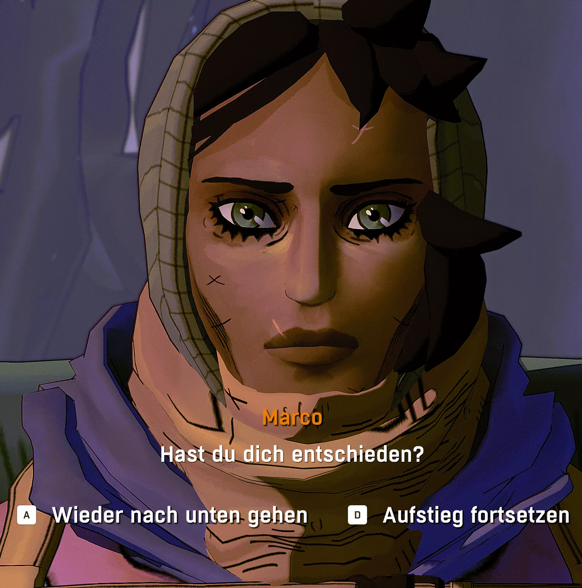 到达下方后,你们可以先重新装备一下。接着我们穿过裂缝。遇到那位友善的女士后,重要的是我们要再次上去找她。