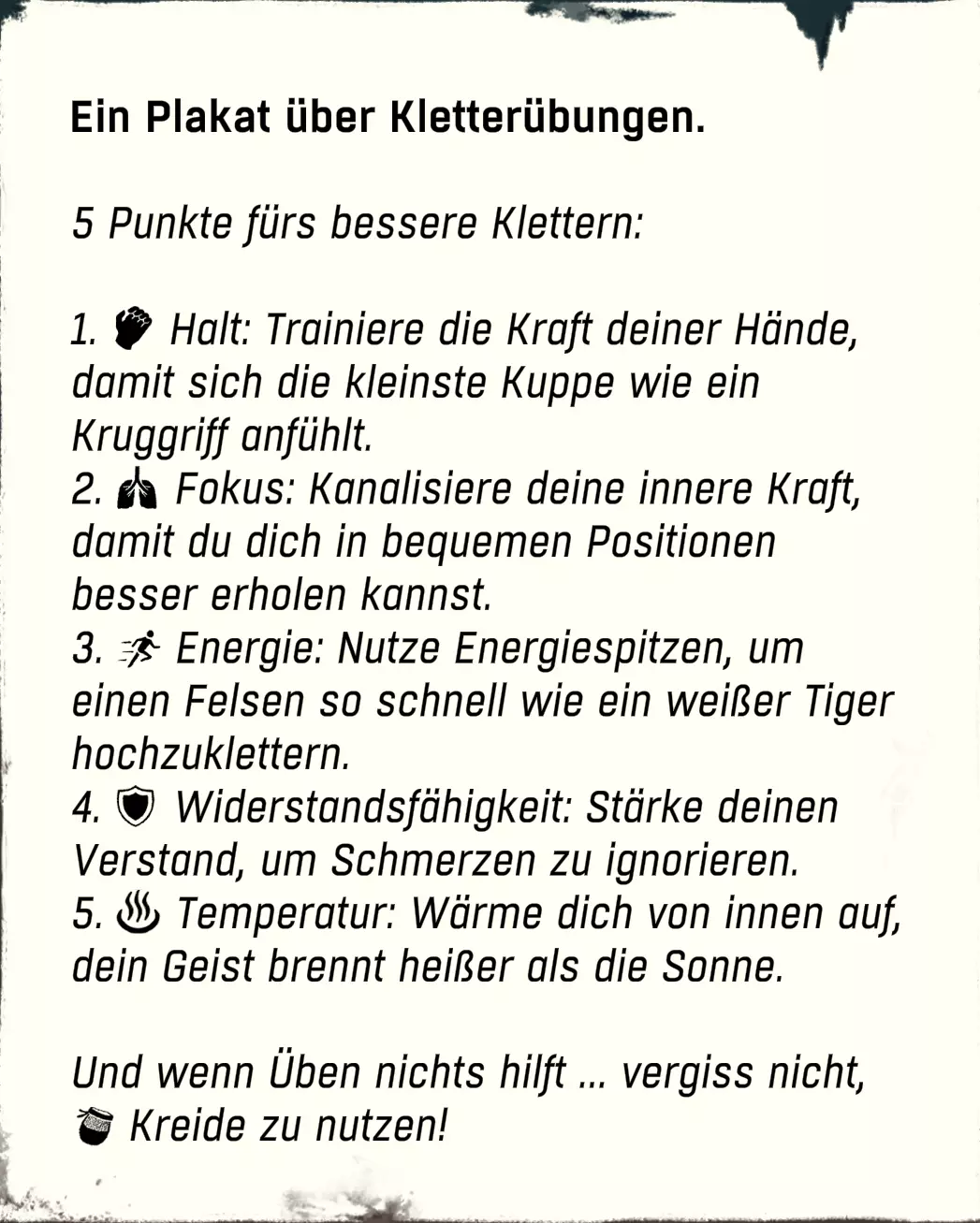 1.完成教程。 游戏会提供一个教程,你需要在三面墙上展示自己的技能,然后才能面对石墙。不过还有5面可选的进阶墙壁。准确来说共有7面墙,你需要完成第5、7、8面墙,然后可以在4a或4b、6a或6b之间选择。作为奖励,你将获得成就【Serious Training】以及一根蛋白棒、一些药品和一个自攻螺丝钩。另外,无论如何都要在教程房间里四处看看,那里已经有一个可重复使用的水瓶、另一个自攻螺丝钩和4枚硬币,你可以用这些硬币在自动售货机购买旅途中的零食。