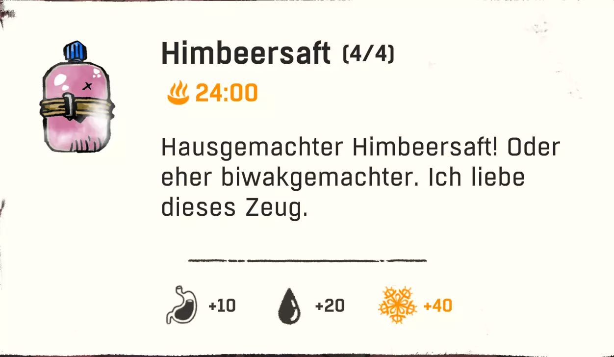 配方:1份清水 + 1份覆盆子 配方(额外甜味 / +10饥饿值 + 1分钟能量):1份覆盆子汁 + 1份覆盆子