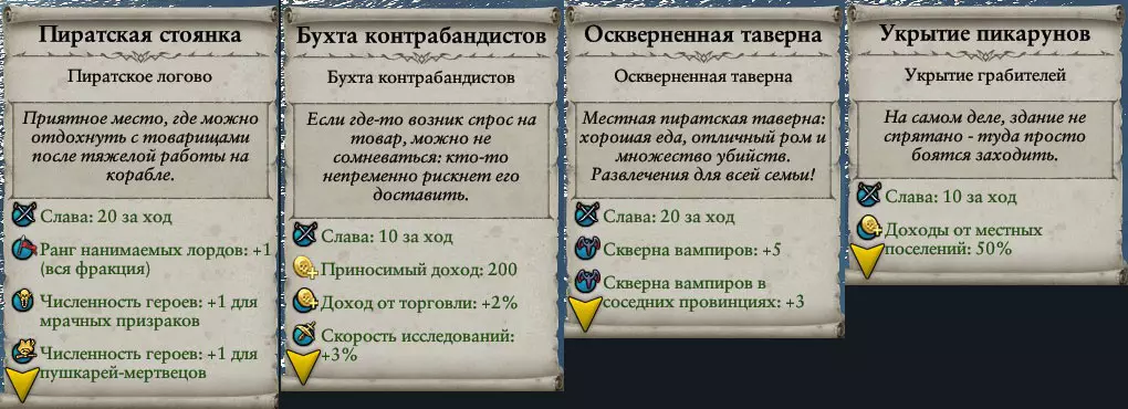 经典的 necromancy(死灵法术)也毫无进展。战斗机制完全没有改变,仍然需要1500-2000+的击杀数。只是这里的 necromancers(死灵法师)更喜欢射击,而不是读书,所以他们无法召唤最强的生物。【恐惧幽灵】和【死灵巨像】只能按老办法获取。 还需要提一下小型科技树,没有它,单位的效率会降低近一半。尤其有趣的是那些能够为领主提供相当不错旗帜的物品。这并不奇怪,毕竟哪个自重的海盗会没有旗帜呢。传奇领主