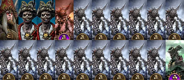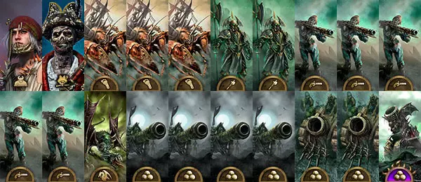 据说一群凶悍的诺斯人海盗曾登上帝国人的船只进行跳帮作战。按照惯例,他们在战利品中发现了一个巨大的黑色宝箱。问题来了——这个黑箱子里装的是什么?当然,里面又是一位冯·卡斯坦因家族的成员。更准确地说,是一位远房亲戚。这个可怜人厌倦了家族内部的种种纷争,决定逃往露丝契亚的金色海滩。醒来后,德古拉同志意识到,没有朋友的他感到非常孤独。 抒情插曲 据说,一群凶悍的北欧维京海盗曾登上帝国的船只进行突袭。按照惯例,在战利品中发现了一个巨大的黑色箱子。问题来了——黑色箱子里有什么?当然,里面又是一位冯·卡尔斯泰因。更准确地说,是一位远房亲戚。这家伙受够了那些家庭纠纷,决定逃到琉斯里亚的金色海滩。德古拉醒来后意识到,没有朋友的他感到非常孤独。更重要的是,连个能聊聊天的人都没有。于是他不得不咬了所有被他冰冷双手碰到的人。就这样,海滩上到处都是无主的亡灵。在社会调查过程中发现,黑鲍勃擅长甲板格斗,咸迪克精通火炮瞄准,而火辣玛丽则熟悉航海导航…… 能得出什么结论呢?我们的英雄身边,大体上聚集了一群普通水手。但吸血鬼的优势就在于,他们能把一切都派上用场。不管愿不愿意,都得戴上海军上将的帽子,肩上站只鹦鹉,然后把最近那艘半沉的船打捞起来。随着时间的推移,这支死亡海洋兄弟会已经扩张成了一整个吸血鬼海岸。如今,方圆千里之内的任何船只都无法保证其船员不会被吃掉。 总之,给我倒杯酒,坐近些,我来告诉你这里谁的炮最大! 阵营特点 尽管我们这里看似是海盗团伙,但没人会否认自己的亡灵根源。忘掉那些由坚不可摧的步兵发起的猛烈冲锋、凶猛的怪物撕咬,以及希尔瓦尼亚领的其他种种“乐趣”吧。海盗伯爵的核心玩法无疑是火药武器的交火。 作为不死族,当吸血鬼的纪律值下降时,他们不会撤退,反而会同样欢快地原地溃散。 与经典伯爵的主要区别如下。