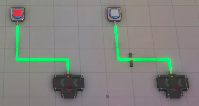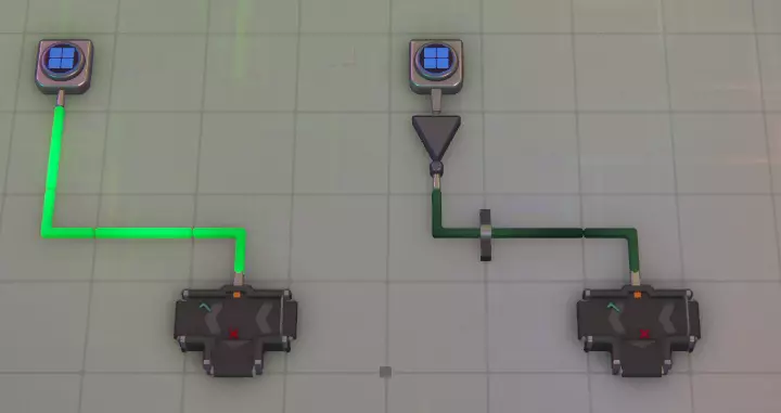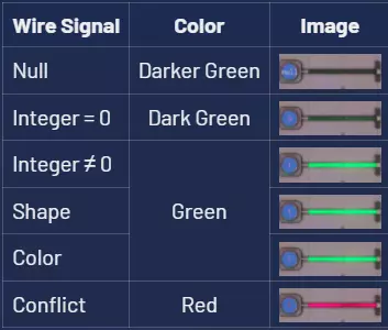 电线 - 插槽1 这是基础的信号传输工具,可将信号从发送源传输至连接的目标。 与传送带不同,电线的放置方向无关紧要。若遇到障碍物,可使用类似传送带发射器的装置将信号发送一小段距离,以便继续布线,或使用更多电线避开传送带、管道等其他物体。 大型全局发送器和接收器能够在地图任意位置之间发送逻辑信号(逻辑信号可以是数字、空值、颜色、冲突或形状)。许多玩家使用它们向材料分析模块(MaM)发送形状信号,以便在中央位置管理各个材料分析模块正在处理的形状。 电线的状态有时可通过其颜色显示: