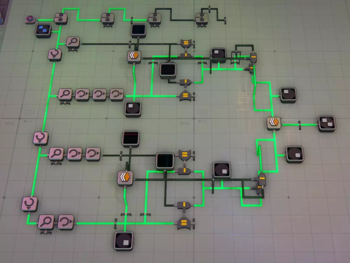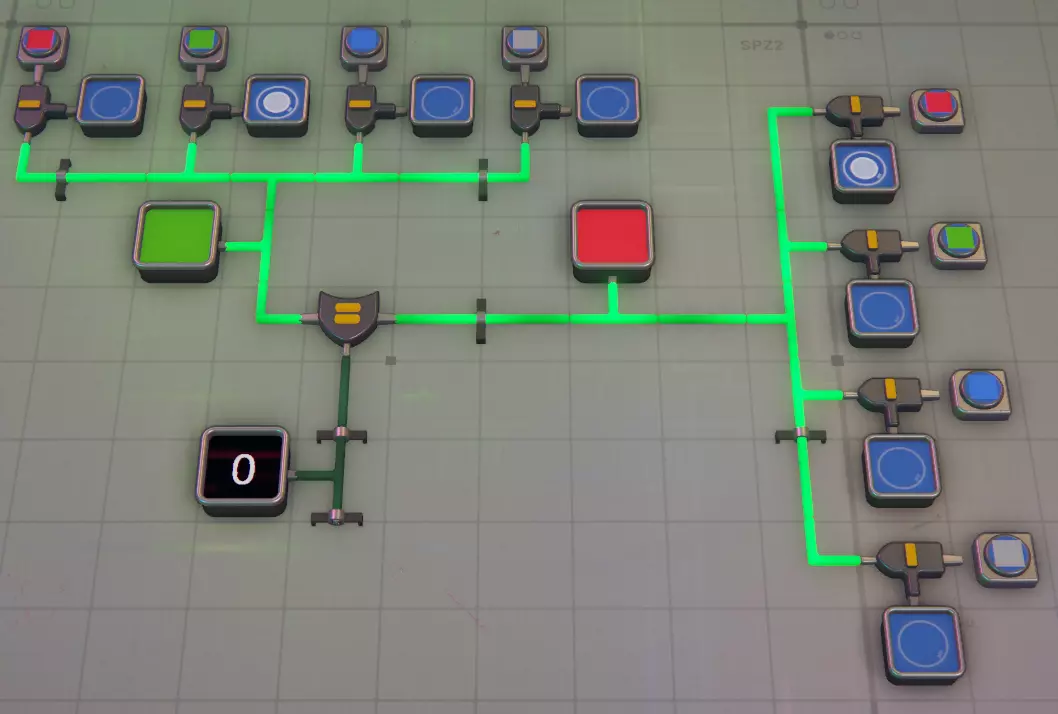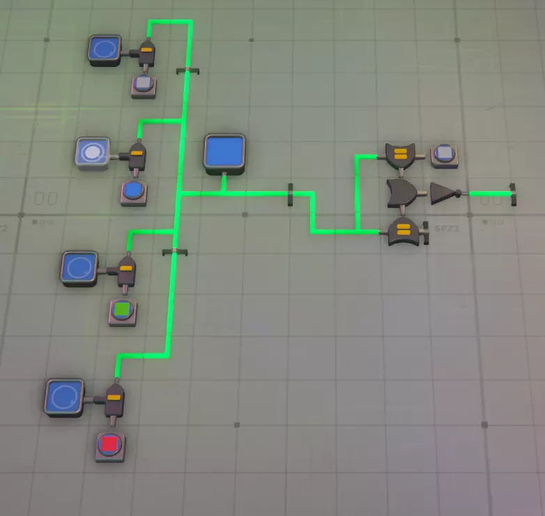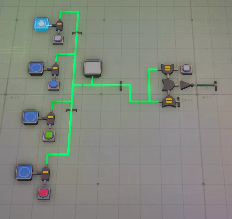 模拟建筑 - 槽位8 这里的情况会变得复杂,因为逻辑门及其信号输出方式可能会非常混乱! 旋转器 该装置可模拟输入形状的1次顺时针旋转。例如,若形状位于右上角,经过旋转器后会移动到右下角。因此,若需要在特定角落模拟特定形状,则需要更多旋转器。半毁器 - 此功能模拟摧毁形状的西半部分(左侧),很简单 :) 模拟堆叠器 此功能模拟将输入的两个形状进行堆叠,因此可用于将形状的西半部分与东半部分堆叠成完整的单层形状,或将一层与另一层堆叠,若有多层输出至线路,还可模拟将其与另一层堆叠,可无限堆叠直至达到堆叠上限,之后便会开始销毁图层...模拟解堆器 没有对应的实际功能,你无法拆分一个形状,但它可以帮助你将形状的各个层级输出到线路中进行处理和测试。你需要多个解堆器来检查一个完整形状的每一层。记住,它会移除一层并将其输出到一侧,然后将剩余的形状(减去已移除的层)输出到另一侧。使用前要小心并测试哪一侧是哪一侧(放置前可以按F键翻转),建议先通过显示器确认,避免在小区域辛苦布线10分钟后才发现方向弄反了……(我绝对没有多次犯这种错误……)模拟绘画器:是的,在一侧输入形状,另一侧输入颜色。再次提醒,请在继续操作前确认好哪个输入对应哪个功能,免得之后疑惑为什么输出不对……(我确实犯过很多次这种错)。一侧只能接受形状,另一侧只能接受颜色。 模拟晶体生成器:我还没使用过这个,因为尚未解锁。我花了很多时间搭建材料加工模块(MaM),还没来得及处理它。所以目前这部分还是【开发中】(WIP)。 模拟交换器:切割工具区的交换器非常好用,如果使用得当,它能起到类似堆叠器的作用。不过这里说的是线路……它可以模拟交换每个形状的西半部分。就像我之前提到的,在大多数情况下,你可以模拟一个形状的完整路径,而无需搭建任何传送带。模拟顶针器 我不太使用这个工具,因为我有一个提取器装置可以输出顶针并将其本身视为一种形状,但如果需要,你可以用它来模拟将顶针推入你的形状中。 形状分析器 这既是一个不可或缺的工具,同时也是使用起来最令人沮丧的东西……它只分析形状的右上角(东北方向),所以要分析整个形状,你需要4个这样的分析器,并在最后3个之间安装模拟旋转器。分析>旋转>分析>旋转>分析>旋转>分析——这样就能得到整个形状,但如果你想在过程中添加检查以确保零件旋转到正确位置,就需要在特定步骤后使用模拟旋转器来确保其正确旋转。除此之外,它还会输出所分析形状的颜色,并将两者分别输出到不同的输出端。这一功能非常实用,但在你习惯之前也同样令人沮丧。 以上涵盖了所有线路部分,如果你想了解其中任何线路的更多细节,请告诉我,但目前先介绍这些基础知识。 这是一项正在进行中的工作(WIP),请耐心等待我对其进行补充和完善。 基本过滤、分析与处理 基本过滤 在这里,我将介绍一些过滤的基础知识,例如如何进行过滤以及它的外观,并附带一些截图。 从简单的开始,信号生成器产生信号RbRbRbRb(蓝色正方形),其中每对字母代表形状和颜色,大写字母表示形状,小写字母表示颜色。以下是一个传送带过滤器,它会识别信号生成器发送的形状,任何匹配的物品都会通过绿色对勾通道,其他物品则进入红色叉号通道。 过滤器右侧是相反的情况,通过使用非门,我们会让蓝色方块进入红色叉号通道。 如果你需要反转通道的用途,这会很有用。
