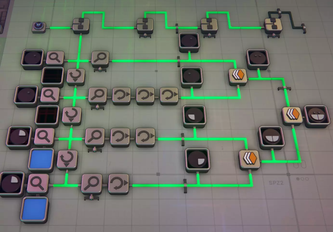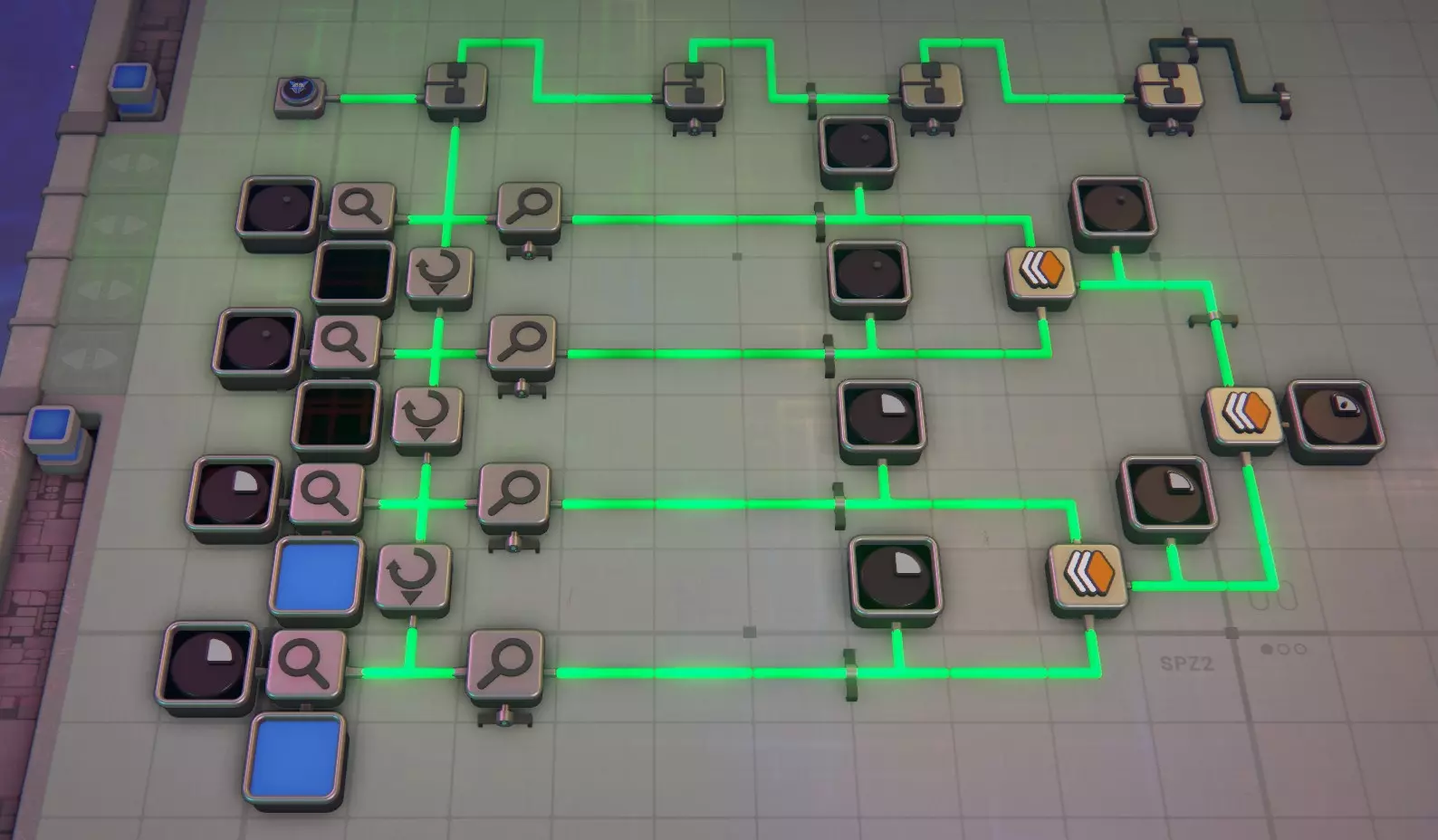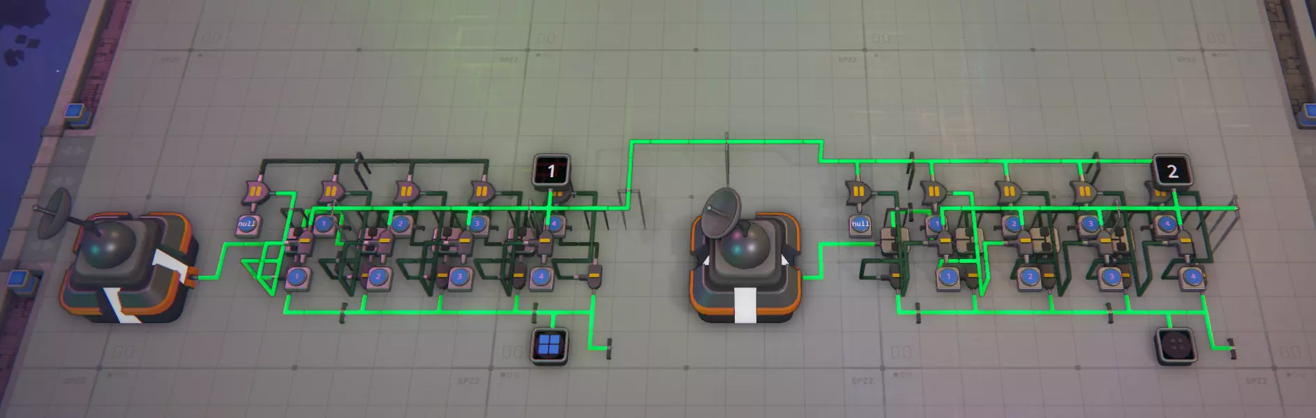 模拟建筑 - 槽位8 这里的情况会变得复杂,因为逻辑门及其信号输出方式可能会非常混乱! 旋转器 该装置可模拟输入形状的1次顺时针旋转。例如,若形状位于右上角,经过旋转器后会移动到右下角。因此,若需要在特定角落模拟特定形状,则需要更多旋转器。半毁器 - 此功能模拟摧毁形状的西半部分(左侧),很简单 :) 模拟堆叠器 此功能模拟将输入的两个形状进行堆叠,因此可用于将形状的西半部分与东半部分堆叠成完整的单层形状,或将一层与另一层堆叠,若有多层输出至线路,还可模拟将其与另一层堆叠,可无限堆叠直至达到堆叠上限,之后便会开始销毁图层...模拟解堆器 没有对应的实际功能,你无法拆分一个形状,但它可以帮助你将形状的各个层级输出到线路中进行处理和测试。你需要多个解堆器来检查一个完整形状的每一层。记住,它会移除一层并将其输出到一侧,然后将剩余的形状(减去已移除的层)输出到另一侧。使用前要小心并测试哪一侧是哪一侧(放置前可以按F键翻转),建议先通过显示器确认,避免在小区域辛苦布线10分钟后才发现方向弄反了……(我绝对没有多次犯这种错误……)模拟绘画器:是的,在一侧输入形状,另一侧输入颜色。再次提醒,请在继续操作前确认好哪个输入对应哪个功能,免得之后疑惑为什么输出不对……(我确实犯过很多次这种错)。一侧只能接受形状,另一侧只能接受颜色。 模拟晶体生成器:我还没使用过这个,因为尚未解锁。我花了很多时间搭建材料加工模块(MaM),还没来得及处理它。所以目前这部分还是【开发中】(WIP)。 模拟交换器:切割工具区的交换器非常好用,如果使用得当,它能起到类似堆叠器的作用。不过这里说的是线路……它可以模拟交换每个形状的西半部分。就像我之前提到的,在大多数情况下,你可以模拟一个形状的完整路径,而无需搭建任何传送带。模拟顶针器 我不太使用这个工具,因为我有一个提取器装置可以输出顶针并将其本身视为一种形状,但如果需要,你可以用它来模拟将顶针推入你的形状中。 形状分析器 这既是一个不可或缺的工具,同时也是使用起来最令人沮丧的东西……它只分析形状的右上角(东北方向),所以要分析整个形状,你需要4个这样的分析器,并在最后3个之间安装模拟旋转器。分析>旋转>分析>旋转>分析>旋转>分析——这样就能得到整个形状,但如果你想在过程中添加检查以确保零件旋转到正确位置,就需要在特定步骤后使用模拟旋转器来确保其正确旋转。除此之外,它还会输出所分析形状的颜色,并将两者分别输出到不同的输出端。这一功能非常实用,但在你习惯之前也同样令人沮丧。 以上涵盖了所有线路部分,如果你想了解其中任何线路的更多细节,请告诉我,但目前先介绍这些基础知识。 这是一项正在进行中的工作(WIP),请耐心等待我对其进行补充和完善。 基本过滤、分析与处理 基本过滤 在这里,我将介绍一些过滤的基础知识,例如如何进行过滤以及它的外观,并附带一些截图。 从简单的开始,信号生成器产生信号RbRbRbRb(蓝色正方形),其中每对字母代表形状和颜色,大写字母表示形状,小写字母表示颜色。以下是一个传送带过滤器,它会识别信号生成器发送的形状,任何匹配的物品都会通过绿色对勾通道,其他物品则进入红色叉号通道。 过滤器右侧是相反的情况,通过使用非门,我们会让蓝色方块进入红色叉号通道。 如果你需要反转通道的用途,这会很有用。
