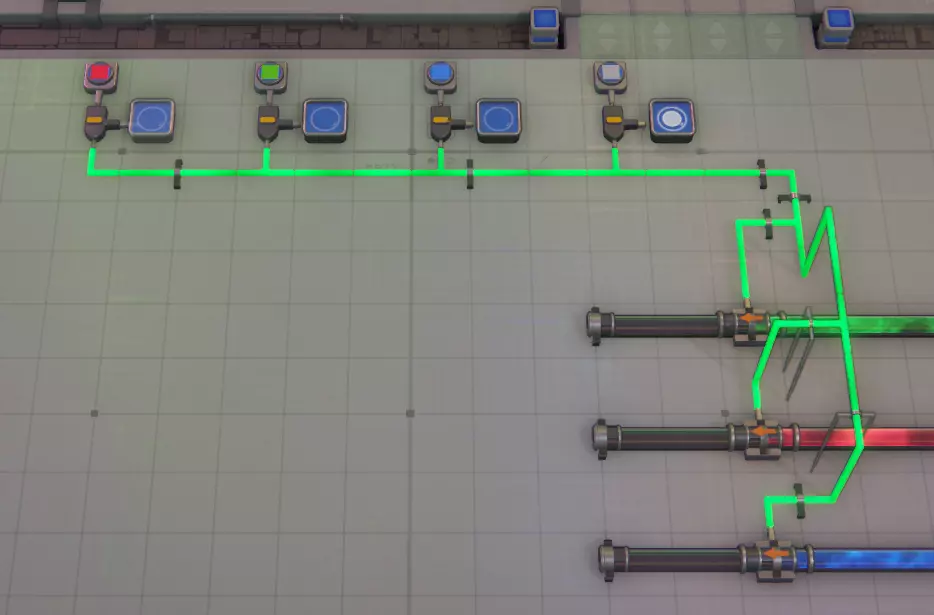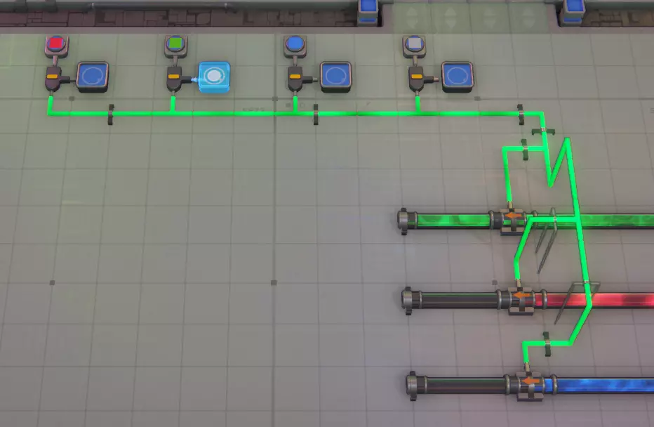 以上是当形状不需要绘制时进行绕过的示例,右侧为绕道路径。比较门用于检测空值(未连接信号处理器的比较门将测试空值)。当输入为引脚时会显示空值,因此需要绕过绘制以及未着色的形状。比较门的简要说明:两者都连接到颜色输出端,然后连接到一个或门,因为只要其中一个或两个激活,我们就希望它绕过到传送带过滤器的X通道。接着,或门的输出连接到一个非门,因为我们希望将检测到空值或未着色输出的正输出转换为负结果(当然,可以通过添加另一个非门或移除所有非门来反转此逻辑)。 涂料供应过滤器:幸运的是,一旦解锁了所有线路选项,最初过滤注入涂装机的涂料类型就变得非常简单,这使得在主装配模块中整合涂装部分更加容易,因为涂料门可以识别流过它的涂料颜色。