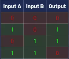 异或门 - 只有当一个输入为1时才会输出1,如果两个输入都为1则输出0。