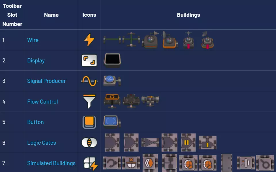 按钮 - 槽位5:按钮功能简单,是一种轻松开关信号的方式。我目前暂未使用,但曾见过一些蓝图,其中每个操作器形状都处于一个线路循环中,通过按钮和逻辑门(逻辑门将在下一部分介绍)连接,用于向全局信号发送器发送形状信号,以便MaM进行构建。它们适用于一些手动任务以及线路循环的测试。