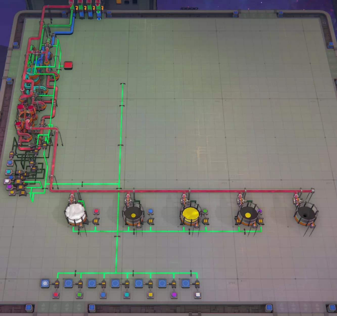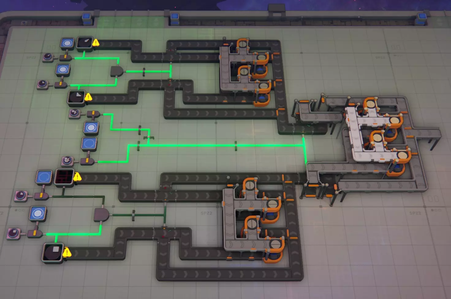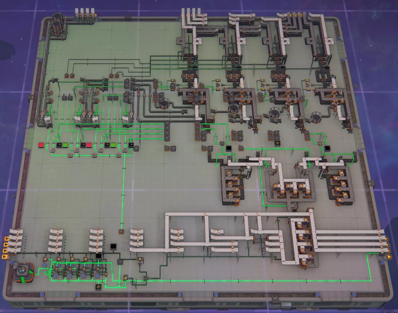 当你查看平台右上角时,那里就是我的图形进入的地方。我只提取图形右上角的部分并将它们输送给MaM。它们可以按任意顺序排列,但要确保每一层都是同一图形角落的4条通道,否则无法正常工作。不过顺序可以随意,左上角的涂料也是如此,无论顺序如何都能正确过滤。 我相当确定没有遗漏任何内容,但以我的性格,很可能在某个地方没有完成传送带的连接。如果发现问题,请告诉我,我会更新蓝图。 【层级电路】包含在上述蓝图中,但如果你只需要这部分,这里有该蓝图的链接。