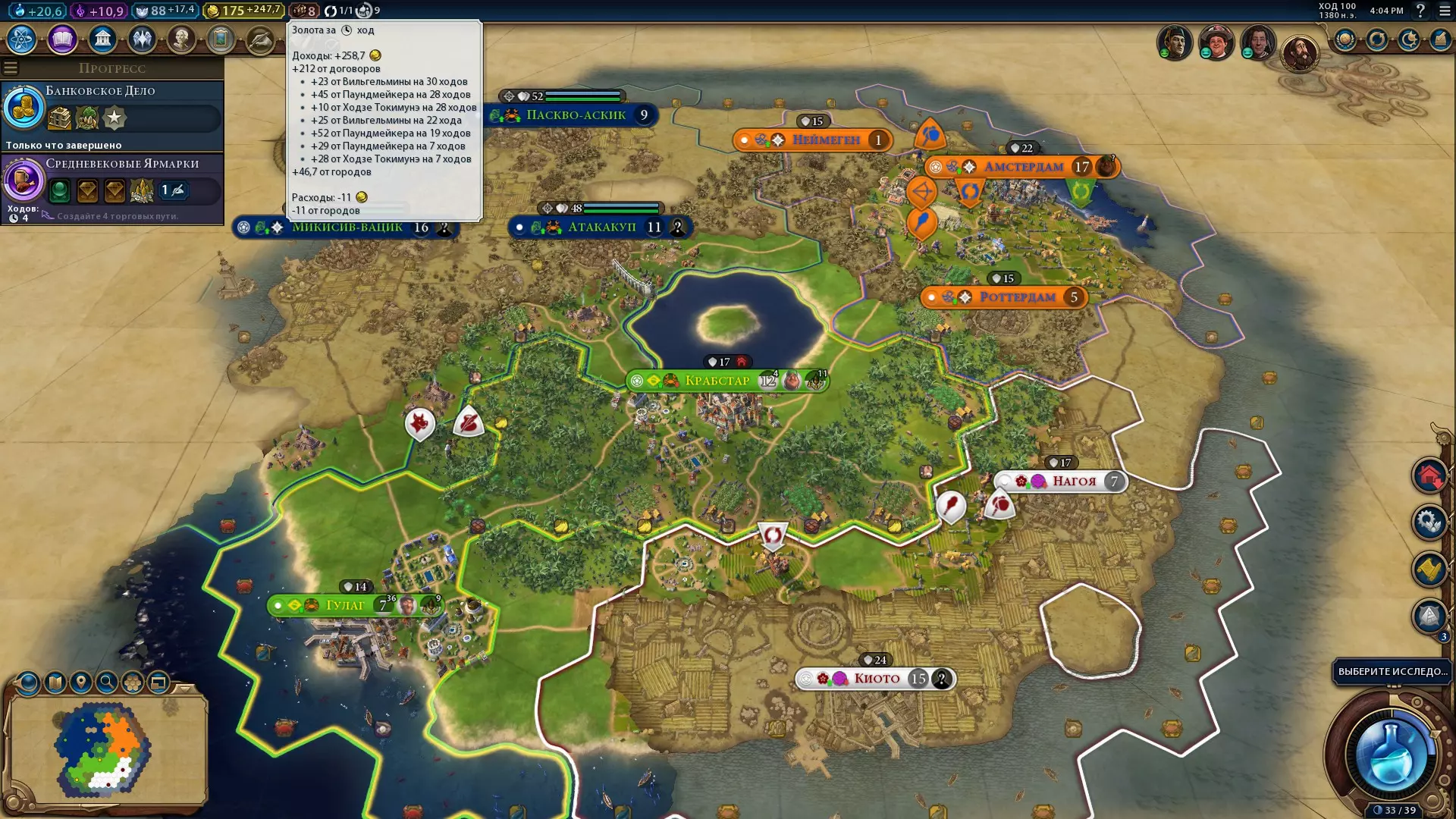 今天我们要让世界陷入债务奴役……顺便再建些神庙 引言 我第一次想到这个策略是在一张决斗地图上,以“神级”难度对抗电脑。当时的设置是除了军事胜利外,其他所有胜利条件都已关闭,这样就不会有什么登月、协议、外交之类的玩意儿:只有纯粹的激战。我选了克利奥帕特拉,专注发展科技。对手是个中东文化大佬,简直强得离谱,他在四面八方都建起了世界奇观,疯狂发展文化,同时还在扩充军队。结果他比我领先两个时代,经济收入更是高得吓人。我对这种局面很不满意,没有军队,通过科技和拨款来升级也毫无用处,因为这个卑鄙的作弊者简直是用魔法给自己变出了一个超级大国,还对着我这个第三世界国家大喊大叫。我给了他贷款:每支付14金币,他就给我1金币,但要持续30回合。过了一段时间,他在军队和债务的重压下变得身无分文,而我则从他那里获取了技术,并用他的财富雇佣了军队,在两个回合内对他实施了灭绝令。 这时我才意识到,金钱就是力量,有了钱就能买到胜利,剩下的只是去夺取它。 收藏家之路 新一轮游戏我选择了巴西,地图为四国地图,难度调低了一些,但已经取消了胜利条件限制。我当时还没搞懂这个策略的厉害之处,所以就发展科技和宗教(宗教是用来提升生产能力的),计划着军事胜利。 快到游戏结束时,我不知怎么开始建造工业区和商业区,这些其实完全没必要,尤其是商业区。 游戏一开始,我就开始强行放贷,利率大概在80%-120%,就像是“你借我1谢克尔,借30回合,我直接还你17谢克尔”。因此,我开始让日本陷入债务奴役,随着时间的推移,我掌握了它的全部收入(我觉得他甚至会为了一定的报酬而出卖自己的母亲)。