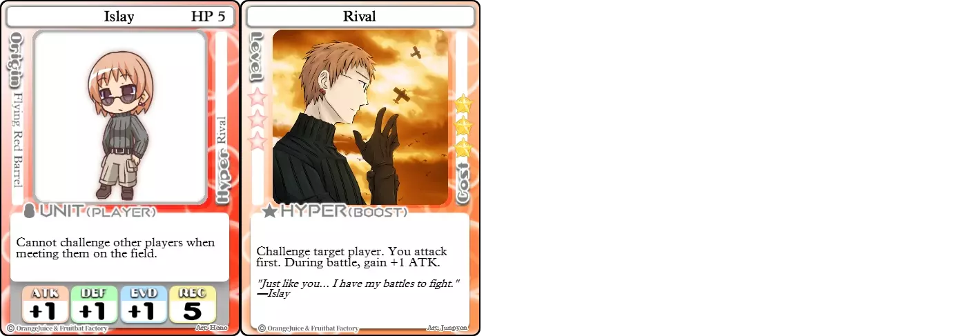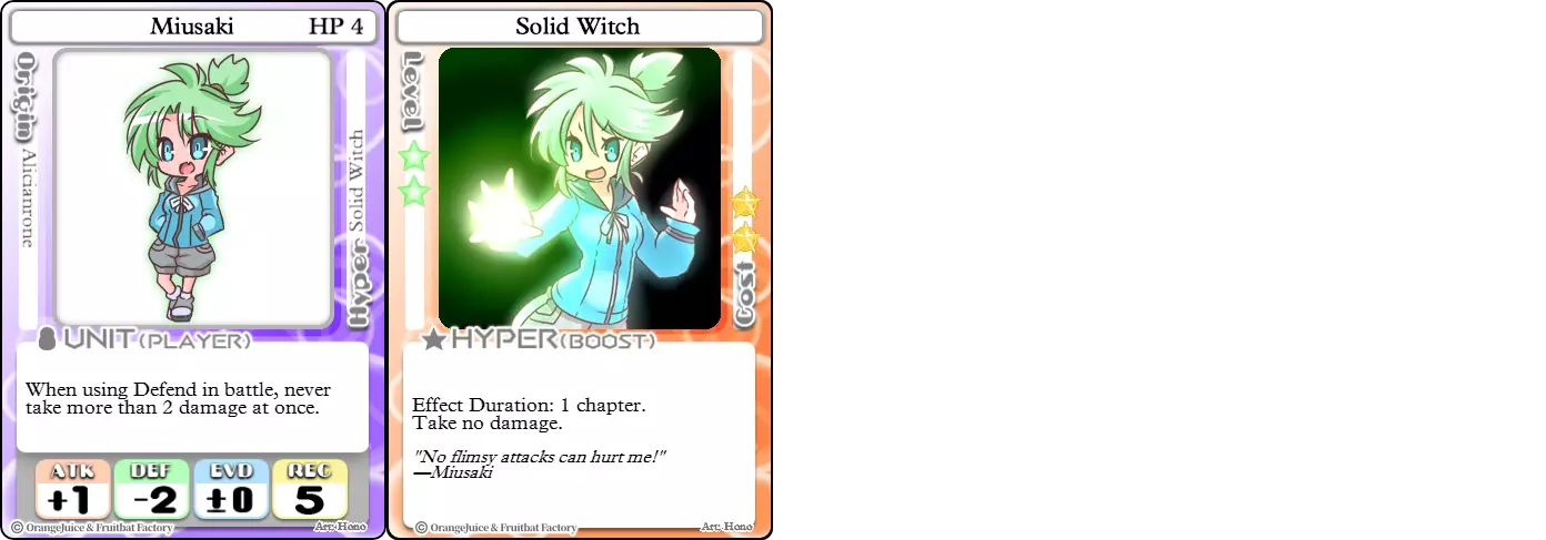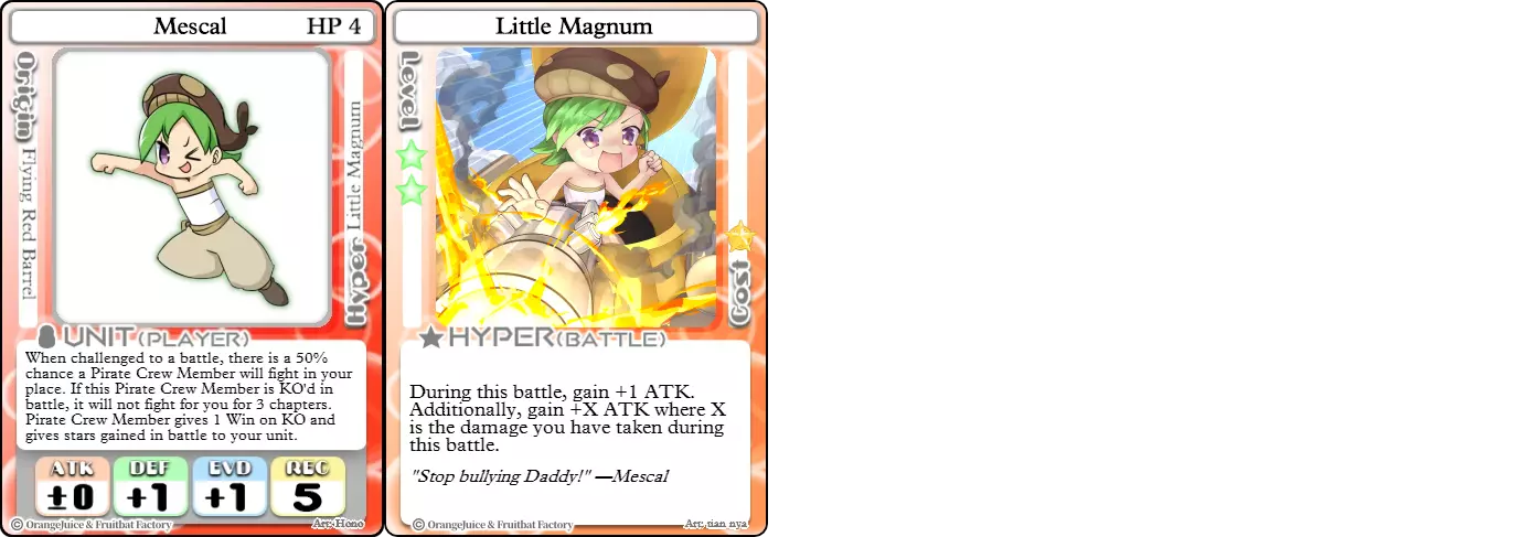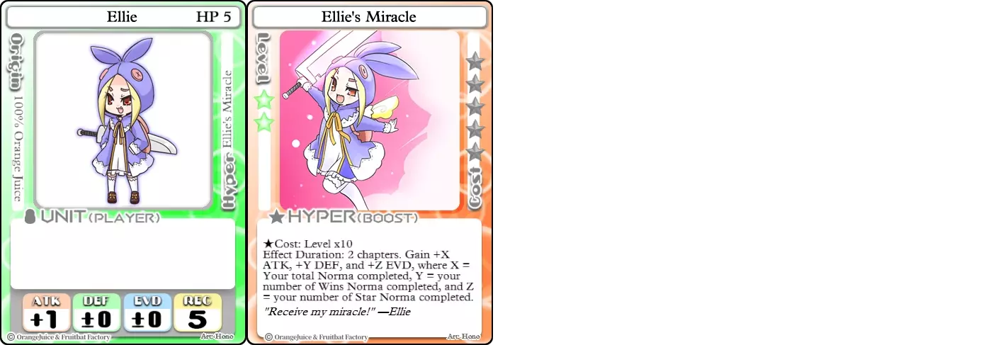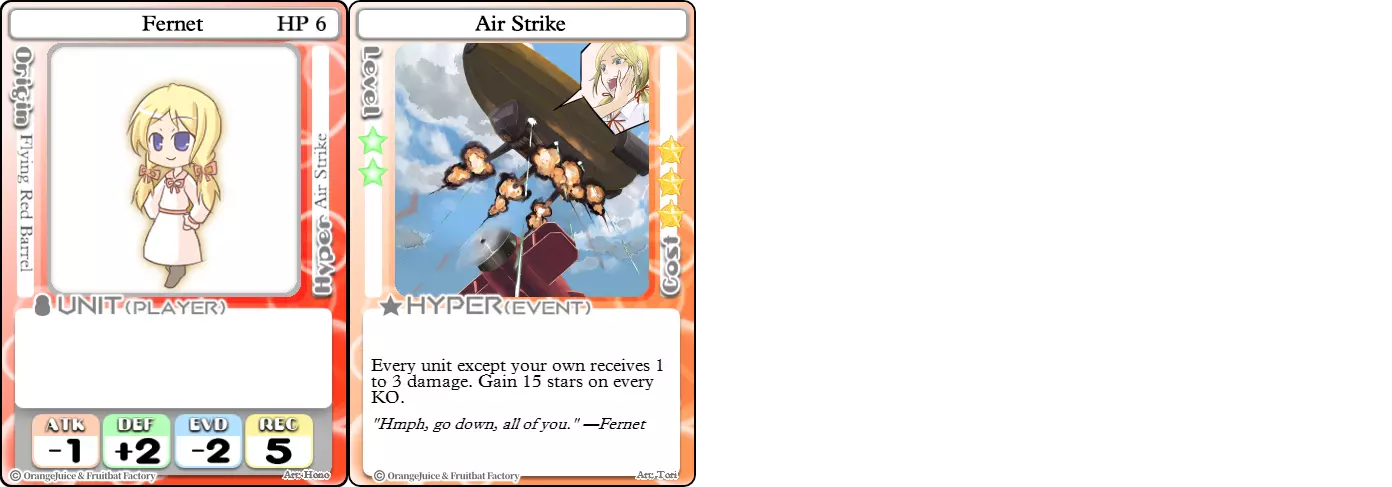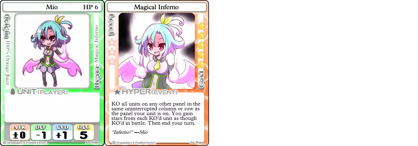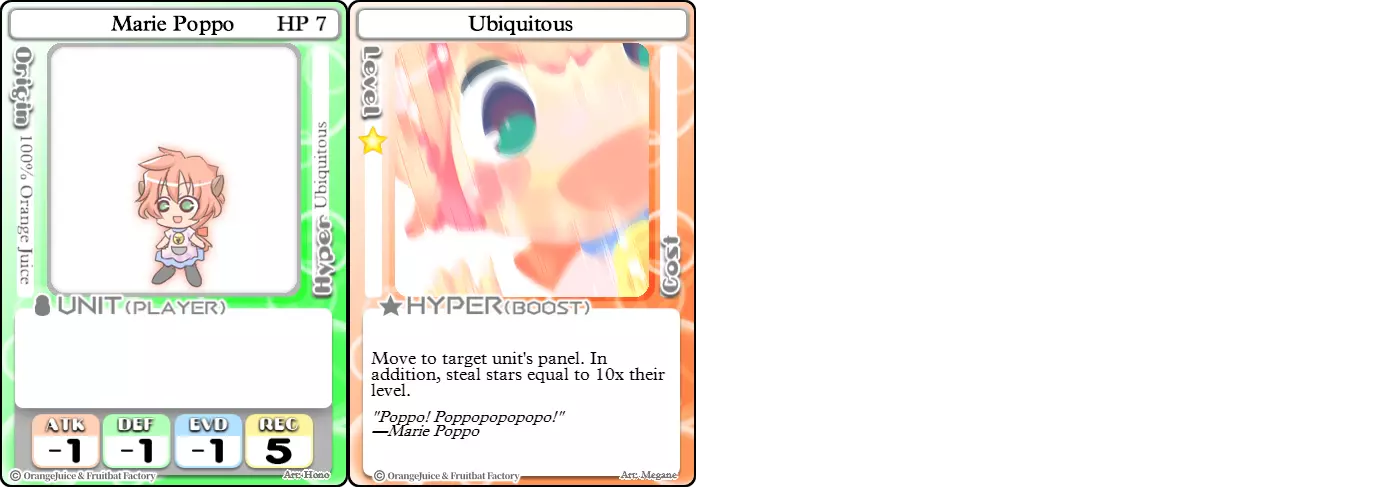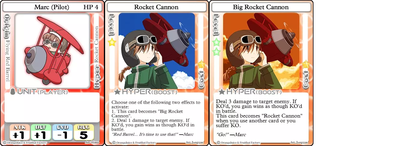 "Red Barrel is ready to fly!" Difficulty: ★★☆☆☆ Class: Bruiser Tags: Artillery Pros: Marc, but with a cheaper hyper Cons: Hyper is telegraphed and has lower max damage Marc (Pilot) sacrifices a bit of damage and reaction speed in order to better manage how many stars she spends on her hyper. Rocket Canon only deals 1 damage uncharged. The turn spent charging it gives opponents a chance to heal or KO your target. Even so, a lot of the good points of Marc also carry over to Marc (Pilot) due to them having the same unit card and similar hypers. Over all, she's a just as good, if not better, alternative for players who think x16 Big Rocket is too expensive late game. Conclusion Thanks for reading! Let me know if you have any suggestions or if you felt this guide was missing something. Images: 100% Orange Juice Wiki[100orangejuice.gamepedia.com] Special thanks to the 100% Orange Juice R&D discord[discord.gg] for discussing characters with me and providing feedback! Click here for more OJ guides! Everything from here onward is just some sorted lists for people who want to view the characters grouped by tags or difficulty, so feel free to skip it. Grouped by Tag BurstSuguri Sora Peat Shifu Robot Syura Nanako Kae Nath Tomato & Mimyuu Kiriko Tequila Tsih Ellie Arnelle Maynie Merchant Mescal Hime (Moonlight) Sora (Military) CollectorAru Marie Poppo Mio Chicken Saki Kiriko Tequila Natsumi Nico Arthur Cuties Yuuki Lulu Teotoratta Cook Halena Merchant Fernet (Noble) Hoshino Reika Marie Poppo (Mixed) Aru (Scrambled) SurvivalKai Robo Ball Flying Castle Krila Kyoko NoName Miusaki Tsih Natsumi Lulu Halena Merchant Mescal Suguri (Ver.2) ControlHime Tomomo Chicken Store Manager Flying Castle Krila Sham Sweet Breaker Tomato & Mimyuu Ceoreparque Yuki (Dangerous) Mira Cuties Yuuki Fernet (Noble) Malt Suguri (Ver.2) SetupShifu Robot Alte Sweet Breaker Nath Tomato & Mimyuu Tsih Mei Lulu Maynie Lone Rider Fernet (Noble) QP (Dangerous) PickSeagull Sherry Islay Malt MobilitySuguri Sora Marie Poppo Seagull Mira Suguri (46 Billion Years) Alicianrone Cook Lone Rider Marie Poppo (Mixed) Sora (Military) TrapperChicken Saki Krila Star Breaker Yuki (Dangerous) Tequila Arthur Mira Malt Shifu ArtilleryMarc Fernet Tomomo (Casual & Sweet Eater) Mei Iru Suguri (46 Billion Years) Alicianrone Marc (Pilot) Card AdvantageAru Tomato & Mimyuu Yuki (Dangerous) Nico Suguri (46 Billion Years) Sumika Lulu Arnelle Merchant Marie Poppo (Mixed) SupportAru Natsumi Arthur Yuuki Aru (Scramble) DenialQP Yuki Store Manager Alte Kyoko NoName Kiriko MasterNoName Tequila Teotorata Mescal Shifu StarburnMarc Star Breaker Nath Suguri (46BY) Alicianrone Malt TransformerKyousuke Tomato & Mimyuu Tomomo (Casual & Sweet Eater) Yuuki Hime (Moonlight) Sorted by Difficulty ★☆☆☆☆Kai Peat Marie Poppo Syura Krila ★★☆☆☆Suguri Marc Yuki Aru Hime Sora Fernet Tomomo Mio Nanako Saki Kyousuke Kae Kyoko Arthur Mira Islay Ellie Teotoratta Halena Fernet (Noble) Mescal Marc (Pilot) ★★★☆☆QP Robo Ball Seagull Sham Sherry Ceoreparque Yuki (Dangerous) Tomomo (Casual) Tequila Tsih Mei Cuties Lulu Alicianrone Arnelle Maynie Cook Merchant Lone Rider Shifu Hoshino Reika QP (Dangerous) Marie Poppo (Mixed) Sora (Military) Aru (Scramble) Suguri (Ver.2) ★★★★☆Chicken Store Manager Shifu Robot Flying Castle Star Breaker Alte Sweet Breaker Nath NoName Miusaki Natsumi Iru Suguri (46 Billion Years) Malt ★★★★★Kiriko Tomato & Mimyuu Nico Yuuki Sumika