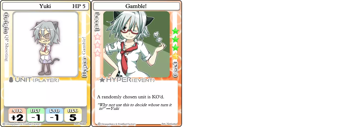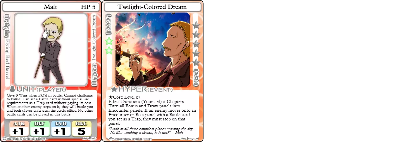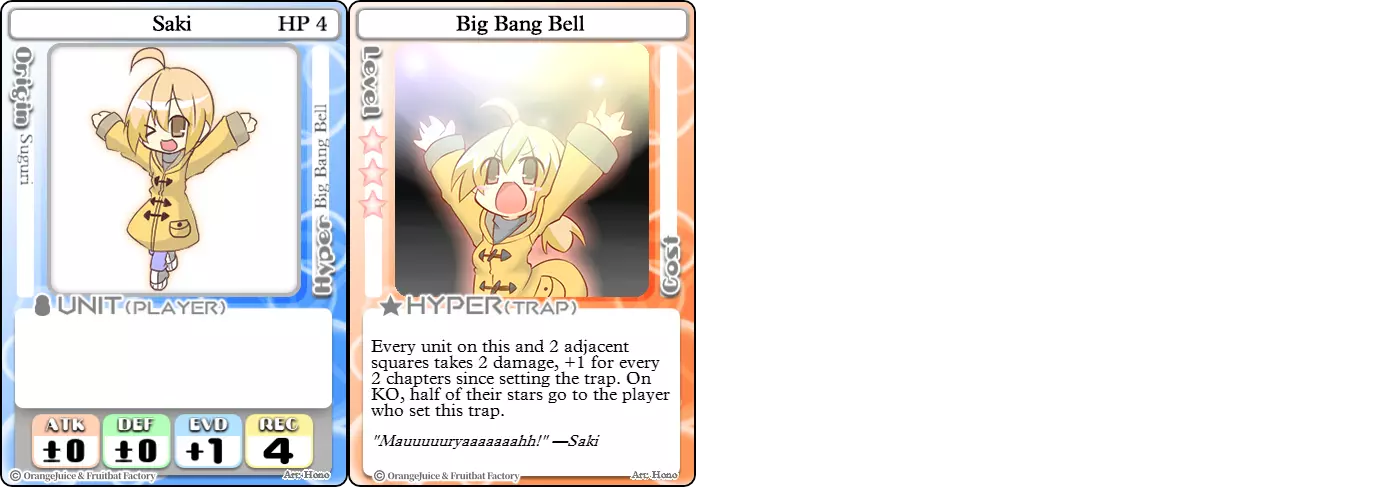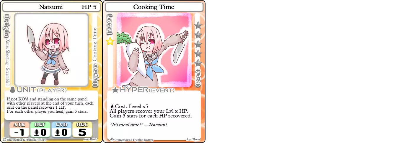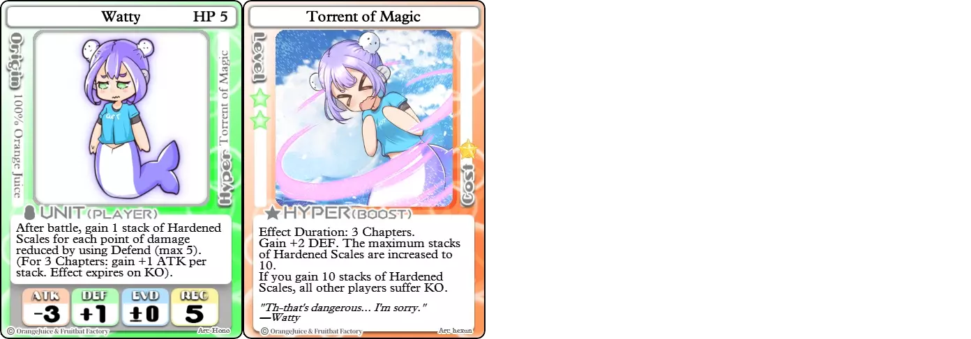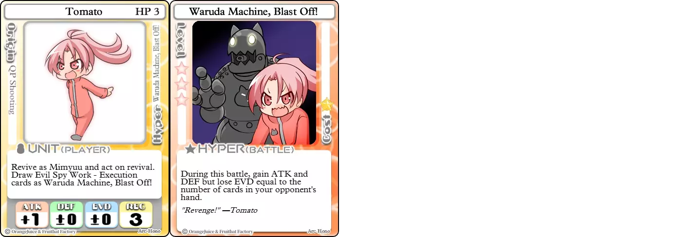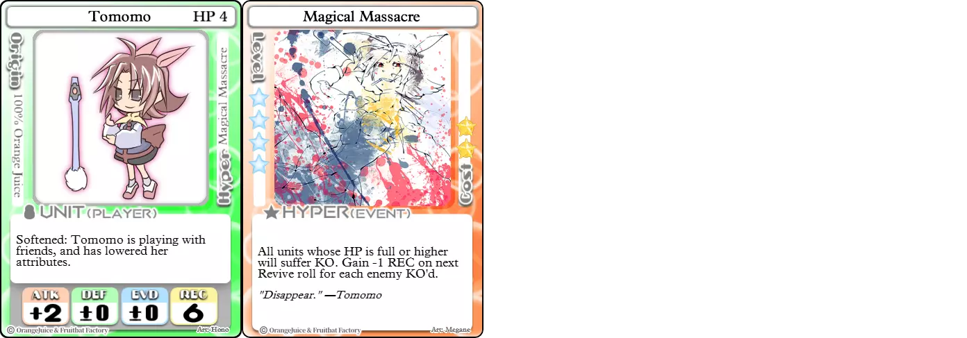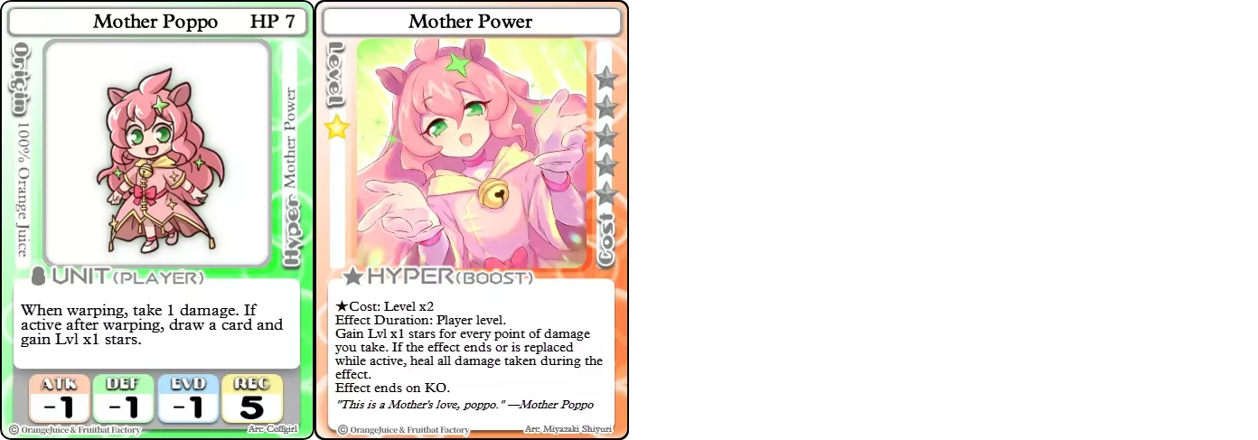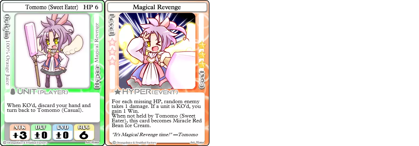 "Red Barrel is ready to fly!" Difficulty: ★★☆☆☆ Class: Bruiser Tags: Artillery Pros: Marc, but with a cheaper hyper Cons: Hyper is telegraphed and has lower max damage Marc (Pilot) sacrifices a bit of damage and reaction speed in order to better manage how many stars she spends on her hyper. Rocket Canon only deals 1 damage uncharged. The turn spent charging it gives opponents a chance to heal or KO your target. Even so, a lot of the good points of Marc also carry over to Marc (Pilot) due to them having the same unit card and similar hypers. Over all, she's a just as good, if not better, alternative for players who think x16 Big Rocket is too expensive late game. Conclusion Thanks for reading! Let me know if you have any suggestions or if you felt this guide was missing something. Images: 100% Orange Juice Wiki[100orangejuice.gamepedia.com] Special thanks to the 100% Orange Juice R&D discord[discord.gg] for discussing characters with me and providing feedback! Click here for more OJ guides! Everything from here onward is just some sorted lists for people who want to view the characters grouped by tags or difficulty, so feel free to skip it. Grouped by Tag BurstSuguri Sora Peat Shifu Robot Syura Nanako Kae Nath Tomato & Mimyuu Kiriko Tequila Tsih Ellie Arnelle Maynie Merchant Mescal Hime (Moonlight) Sora (Military) CollectorAru Marie Poppo Mio Chicken Saki Kiriko Tequila Natsumi Nico Arthur Cuties Yuuki Lulu Teotoratta Cook Halena Merchant Fernet (Noble) Hoshino Reika Marie Poppo (Mixed) Aru (Scrambled) SurvivalKai Robo Ball Flying Castle Krila Kyoko NoName Miusaki Tsih Natsumi Lulu Halena Merchant Mescal Suguri (Ver.2) ControlHime Tomomo Chicken Store Manager Flying Castle Krila Sham Sweet Breaker Tomato & Mimyuu Ceoreparque Yuki (Dangerous) Mira Cuties Yuuki Fernet (Noble) Malt Suguri (Ver.2) SetupShifu Robot Alte Sweet Breaker Nath Tomato & Mimyuu Tsih Mei Lulu Maynie Lone Rider Fernet (Noble) QP (Dangerous) PickSeagull Sherry Islay Malt MobilitySuguri Sora Marie Poppo Seagull Mira Suguri (46 Billion Years) Alicianrone Cook Lone Rider Marie Poppo (Mixed) Sora (Military) TrapperChicken Saki Krila Star Breaker Yuki (Dangerous) Tequila Arthur Mira Malt Shifu ArtilleryMarc Fernet Tomomo (Casual & Sweet Eater) Mei Iru Suguri (46 Billion Years) Alicianrone Marc (Pilot) Card AdvantageAru Tomato & Mimyuu Yuki (Dangerous) Nico Suguri (46 Billion Years) Sumika Lulu Arnelle Merchant Marie Poppo (Mixed) SupportAru Natsumi Arthur Yuuki Aru (Scramble) DenialQP Yuki Store Manager Alte Kyoko NoName Kiriko MasterNoName Tequila Teotorata Mescal Shifu StarburnMarc Star Breaker Nath Suguri (46BY) Alicianrone Malt TransformerKyousuke Tomato & Mimyuu Tomomo (Casual & Sweet Eater) Yuuki Hime (Moonlight) Sorted by Difficulty ★☆☆☆☆Kai Peat Marie Poppo Syura Krila ★★☆☆☆Suguri Marc Yuki Aru Hime Sora Fernet Tomomo Mio Nanako Saki Kyousuke Kae Kyoko Arthur Mira Islay Ellie Teotoratta Halena Fernet (Noble) Mescal Marc (Pilot) ★★★☆☆QP Robo Ball Seagull Sham Sherry Ceoreparque Yuki (Dangerous) Tomomo (Casual) Tequila Tsih Mei Cuties Lulu Alicianrone Arnelle Maynie Cook Merchant Lone Rider Shifu Hoshino Reika QP (Dangerous) Marie Poppo (Mixed) Sora (Military) Aru (Scramble) Suguri (Ver.2) ★★★★☆Chicken Store Manager Shifu Robot Flying Castle Star Breaker Alte Sweet Breaker Nath NoName Miusaki Natsumi Iru Suguri (46 Billion Years) Malt ★★★★★Kiriko Tomato & Mimyuu Nico Yuuki Sumika