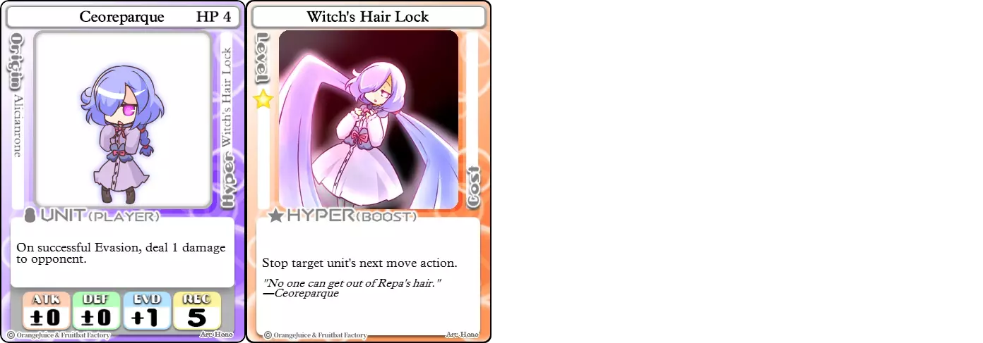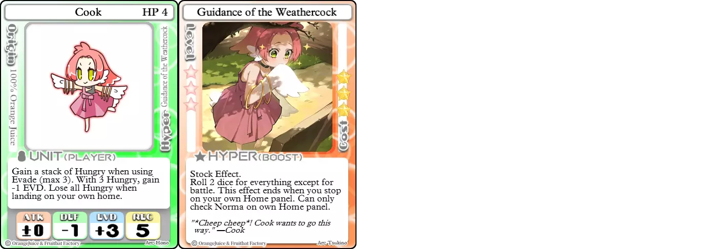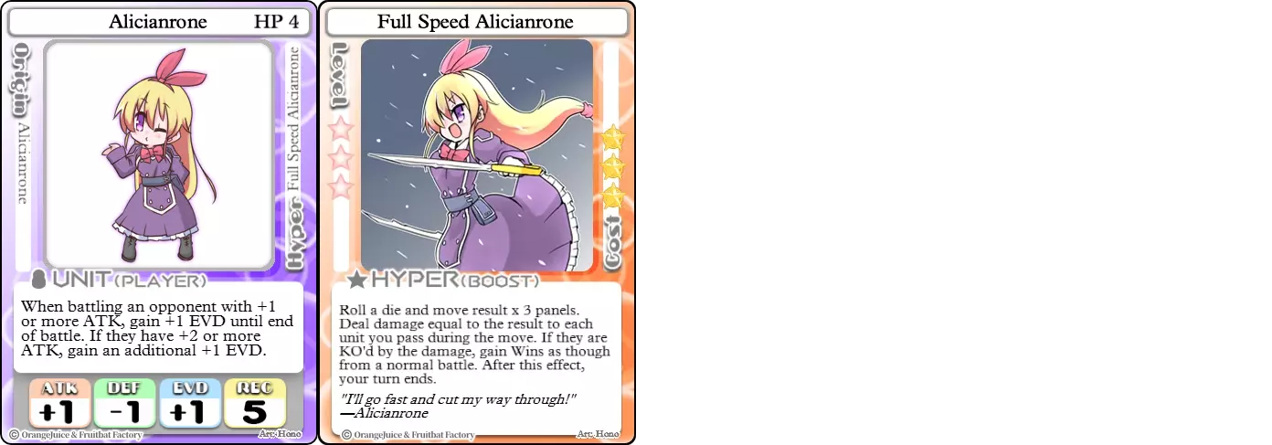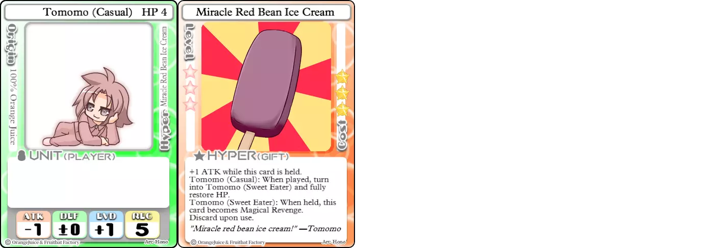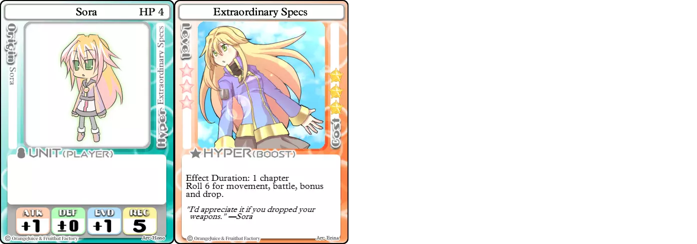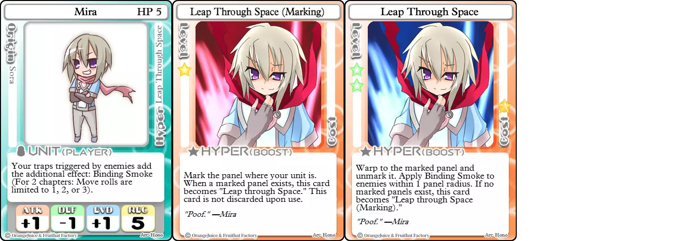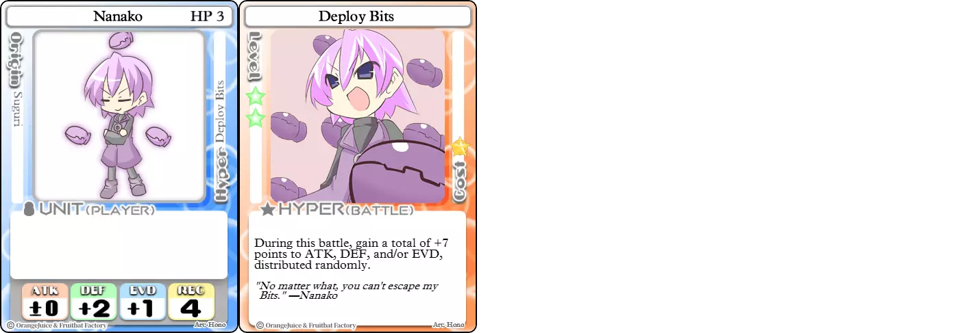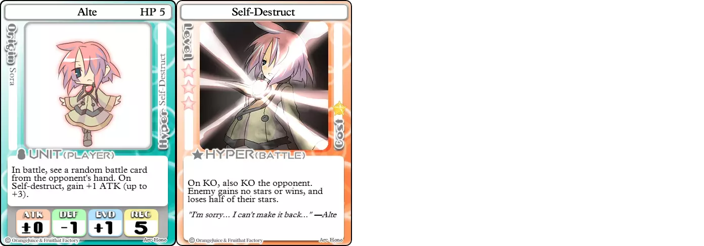 "Red Barrel is ready to fly!" Difficulty: ★★☆☆☆ Class: Bruiser Tags: Artillery Pros: Marc, but with a cheaper hyper Cons: Hyper is telegraphed and has lower max damage Marc (Pilot) sacrifices a bit of damage and reaction speed in order to better manage how many stars she spends on her hyper. Rocket Canon only deals 1 damage uncharged. The turn spent charging it gives opponents a chance to heal or KO your target. Even so, a lot of the good points of Marc also carry over to Marc (Pilot) due to them having the same unit card and similar hypers. Over all, she's a just as good, if not better, alternative for players who think x16 Big Rocket is too expensive late game. Conclusion Thanks for reading! Let me know if you have any suggestions or if you felt this guide was missing something. Images: 100% Orange Juice Wiki[100orangejuice.gamepedia.com] Special thanks to the 100% Orange Juice R&D discord[discord.gg] for discussing characters with me and providing feedback! Click here for more OJ guides! Everything from here onward is just some sorted lists for people who want to view the characters grouped by tags or difficulty, so feel free to skip it. Grouped by Tag BurstSuguri Sora Peat Shifu Robot Syura Nanako Kae Nath Tomato & Mimyuu Kiriko Tequila Tsih Ellie Arnelle Maynie Merchant Mescal Hime (Moonlight) Sora (Military) CollectorAru Marie Poppo Mio Chicken Saki Kiriko Tequila Natsumi Nico Arthur Cuties Yuuki Lulu Teotoratta Cook Halena Merchant Fernet (Noble) Hoshino Reika Marie Poppo (Mixed) Aru (Scrambled) SurvivalKai Robo Ball Flying Castle Krila Kyoko NoName Miusaki Tsih Natsumi Lulu Halena Merchant Mescal Suguri (Ver.2) ControlHime Tomomo Chicken Store Manager Flying Castle Krila Sham Sweet Breaker Tomato & Mimyuu Ceoreparque Yuki (Dangerous) Mira Cuties Yuuki Fernet (Noble) Malt Suguri (Ver.2) SetupShifu Robot Alte Sweet Breaker Nath Tomato & Mimyuu Tsih Mei Lulu Maynie Lone Rider Fernet (Noble) QP (Dangerous) PickSeagull Sherry Islay Malt MobilitySuguri Sora Marie Poppo Seagull Mira Suguri (46 Billion Years) Alicianrone Cook Lone Rider Marie Poppo (Mixed) Sora (Military) TrapperChicken Saki Krila Star Breaker Yuki (Dangerous) Tequila Arthur Mira Malt Shifu ArtilleryMarc Fernet Tomomo (Casual & Sweet Eater) Mei Iru Suguri (46 Billion Years) Alicianrone Marc (Pilot) Card AdvantageAru Tomato & Mimyuu Yuki (Dangerous) Nico Suguri (46 Billion Years) Sumika Lulu Arnelle Merchant Marie Poppo (Mixed) SupportAru Natsumi Arthur Yuuki Aru (Scramble) DenialQP Yuki Store Manager Alte Kyoko NoName Kiriko MasterNoName Tequila Teotorata Mescal Shifu StarburnMarc Star Breaker Nath Suguri (46BY) Alicianrone Malt TransformerKyousuke Tomato & Mimyuu Tomomo (Casual & Sweet Eater) Yuuki Hime (Moonlight) Sorted by Difficulty ★☆☆☆☆Kai Peat Marie Poppo Syura Krila ★★☆☆☆Suguri Marc Yuki Aru Hime Sora Fernet Tomomo Mio Nanako Saki Kyousuke Kae Kyoko Arthur Mira Islay Ellie Teotoratta Halena Fernet (Noble) Mescal Marc (Pilot) ★★★☆☆QP Robo Ball Seagull Sham Sherry Ceoreparque Yuki (Dangerous) Tomomo (Casual) Tequila Tsih Mei Cuties Lulu Alicianrone Arnelle Maynie Cook Merchant Lone Rider Shifu Hoshino Reika QP (Dangerous) Marie Poppo (Mixed) Sora (Military) Aru (Scramble) Suguri (Ver.2) ★★★★☆Chicken Store Manager Shifu Robot Flying Castle Star Breaker Alte Sweet Breaker Nath NoName Miusaki Natsumi Iru Suguri (46 Billion Years) Malt ★★★★★Kiriko Tomato & Mimyuu Nico Yuuki Sumika