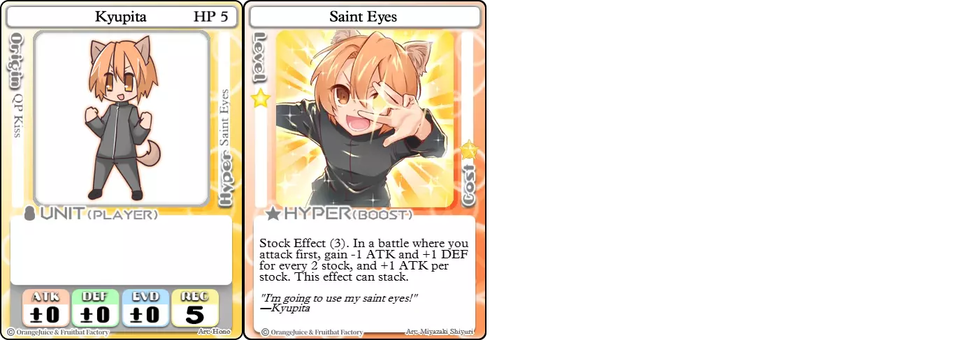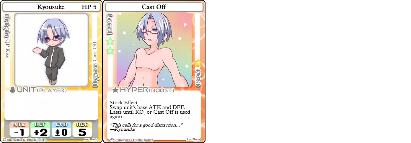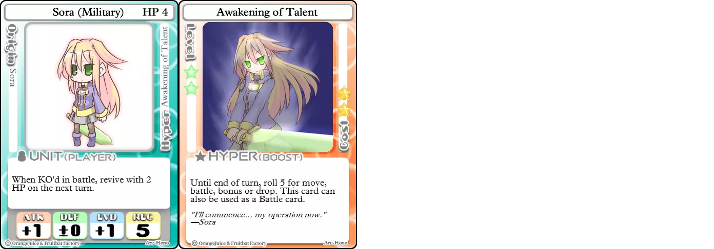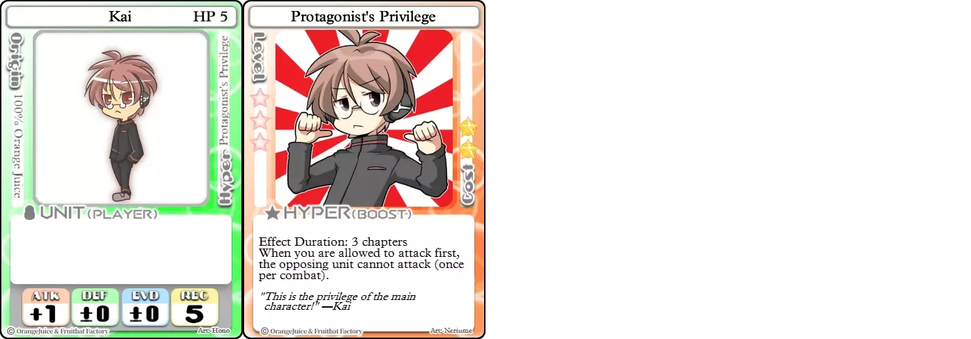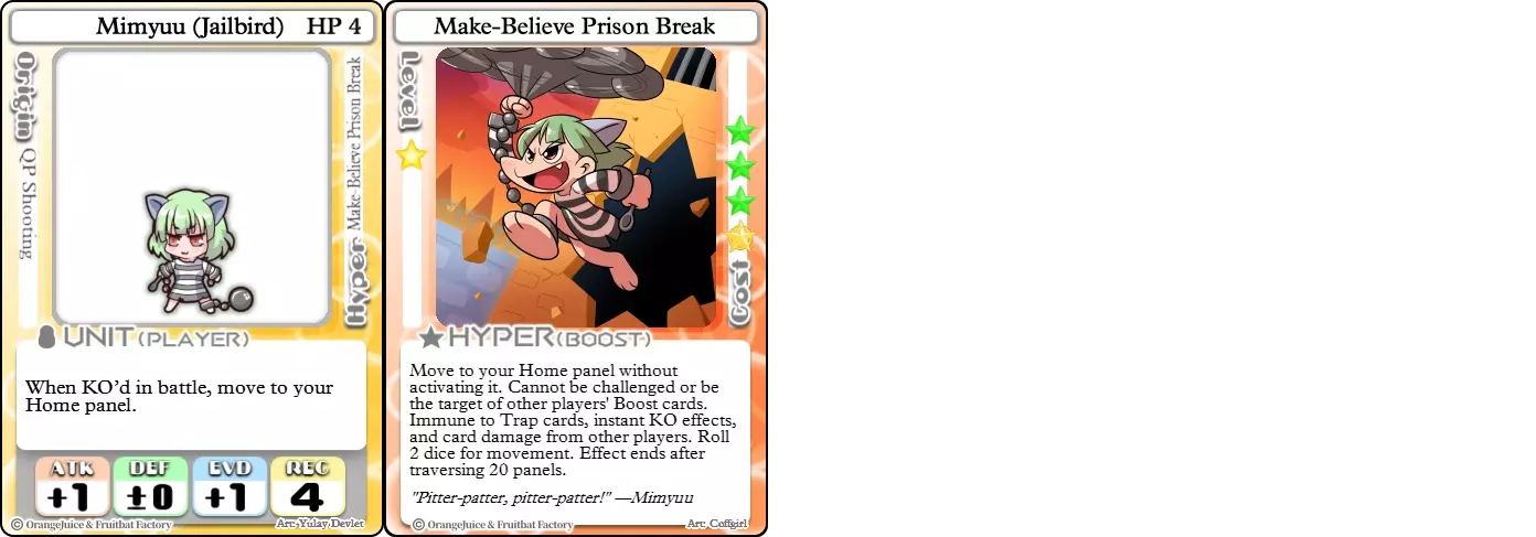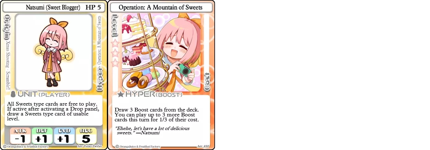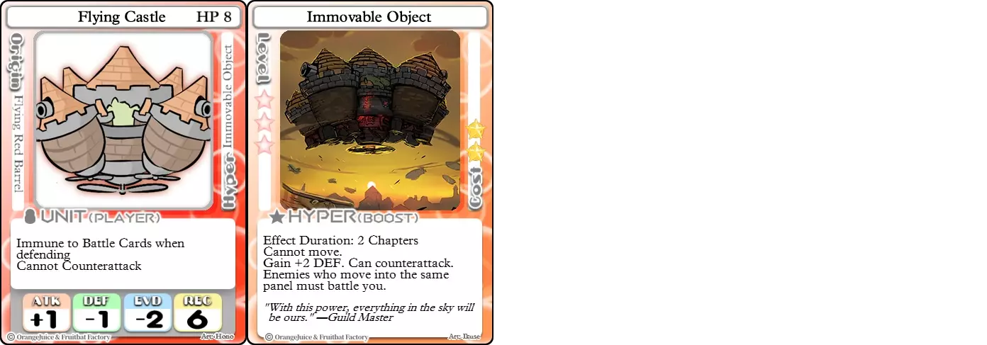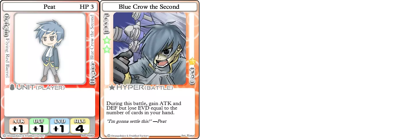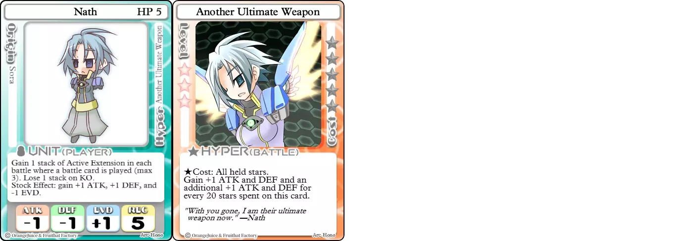 "Red Barrel is ready to fly!" Difficulty: ★★☆☆☆ Class: Bruiser Tags: Artillery Pros: Marc, but with a cheaper hyper Cons: Hyper is telegraphed and has lower max damage Marc (Pilot) sacrifices a bit of damage and reaction speed in order to better manage how many stars she spends on her hyper. Rocket Canon only deals 1 damage uncharged. The turn spent charging it gives opponents a chance to heal or KO your target. Even so, a lot of the good points of Marc also carry over to Marc (Pilot) due to them having the same unit card and similar hypers. Over all, she's a just as good, if not better, alternative for players who think x16 Big Rocket is too expensive late game. Conclusion Thanks for reading! Let me know if you have any suggestions or if you felt this guide was missing something. Images: 100% Orange Juice Wiki[100orangejuice.gamepedia.com] Special thanks to the 100% Orange Juice R&D discord[discord.gg] for discussing characters with me and providing feedback! Click here for more OJ guides! Everything from here onward is just some sorted lists for people who want to view the characters grouped by tags or difficulty, so feel free to skip it. Grouped by Tag BurstSuguri Sora Peat Shifu Robot Syura Nanako Kae Nath Tomato & Mimyuu Kiriko Tequila Tsih Ellie Arnelle Maynie Merchant Mescal Hime (Moonlight) Sora (Military) CollectorAru Marie Poppo Mio Chicken Saki Kiriko Tequila Natsumi Nico Arthur Cuties Yuuki Lulu Teotoratta Cook Halena Merchant Fernet (Noble) Hoshino Reika Marie Poppo (Mixed) Aru (Scrambled) SurvivalKai Robo Ball Flying Castle Krila Kyoko NoName Miusaki Tsih Natsumi Lulu Halena Merchant Mescal Suguri (Ver.2) ControlHime Tomomo Chicken Store Manager Flying Castle Krila Sham Sweet Breaker Tomato & Mimyuu Ceoreparque Yuki (Dangerous) Mira Cuties Yuuki Fernet (Noble) Malt Suguri (Ver.2) SetupShifu Robot Alte Sweet Breaker Nath Tomato & Mimyuu Tsih Mei Lulu Maynie Lone Rider Fernet (Noble) QP (Dangerous) PickSeagull Sherry Islay Malt MobilitySuguri Sora Marie Poppo Seagull Mira Suguri (46 Billion Years) Alicianrone Cook Lone Rider Marie Poppo (Mixed) Sora (Military) TrapperChicken Saki Krila Star Breaker Yuki (Dangerous) Tequila Arthur Mira Malt Shifu ArtilleryMarc Fernet Tomomo (Casual & Sweet Eater) Mei Iru Suguri (46 Billion Years) Alicianrone Marc (Pilot) Card AdvantageAru Tomato & Mimyuu Yuki (Dangerous) Nico Suguri (46 Billion Years) Sumika Lulu Arnelle Merchant Marie Poppo (Mixed) SupportAru Natsumi Arthur Yuuki Aru (Scramble) DenialQP Yuki Store Manager Alte Kyoko NoName Kiriko MasterNoName Tequila Teotorata Mescal Shifu StarburnMarc Star Breaker Nath Suguri (46BY) Alicianrone Malt TransformerKyousuke Tomato & Mimyuu Tomomo (Casual & Sweet Eater) Yuuki Hime (Moonlight) Sorted by Difficulty ★☆☆☆☆Kai Peat Marie Poppo Syura Krila ★★☆☆☆Suguri Marc Yuki Aru Hime Sora Fernet Tomomo Mio Nanako Saki Kyousuke Kae Kyoko Arthur Mira Islay Ellie Teotoratta Halena Fernet (Noble) Mescal Marc (Pilot) ★★★☆☆QP Robo Ball Seagull Sham Sherry Ceoreparque Yuki (Dangerous) Tomomo (Casual) Tequila Tsih Mei Cuties Lulu Alicianrone Arnelle Maynie Cook Merchant Lone Rider Shifu Hoshino Reika QP (Dangerous) Marie Poppo (Mixed) Sora (Military) Aru (Scramble) Suguri (Ver.2) ★★★★☆Chicken Store Manager Shifu Robot Flying Castle Star Breaker Alte Sweet Breaker Nath NoName Miusaki Natsumi Iru Suguri (46 Billion Years) Malt ★★★★★Kiriko Tomato & Mimyuu Nico Yuuki Sumika