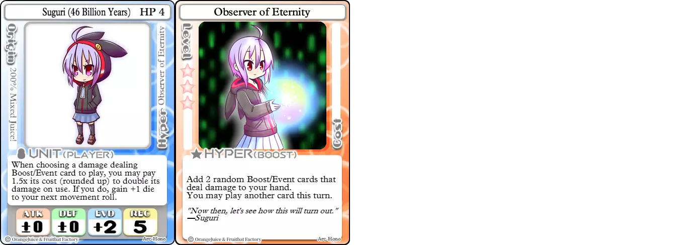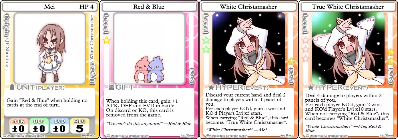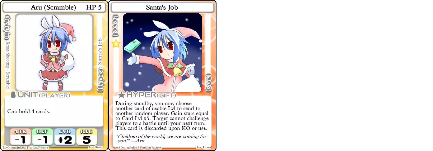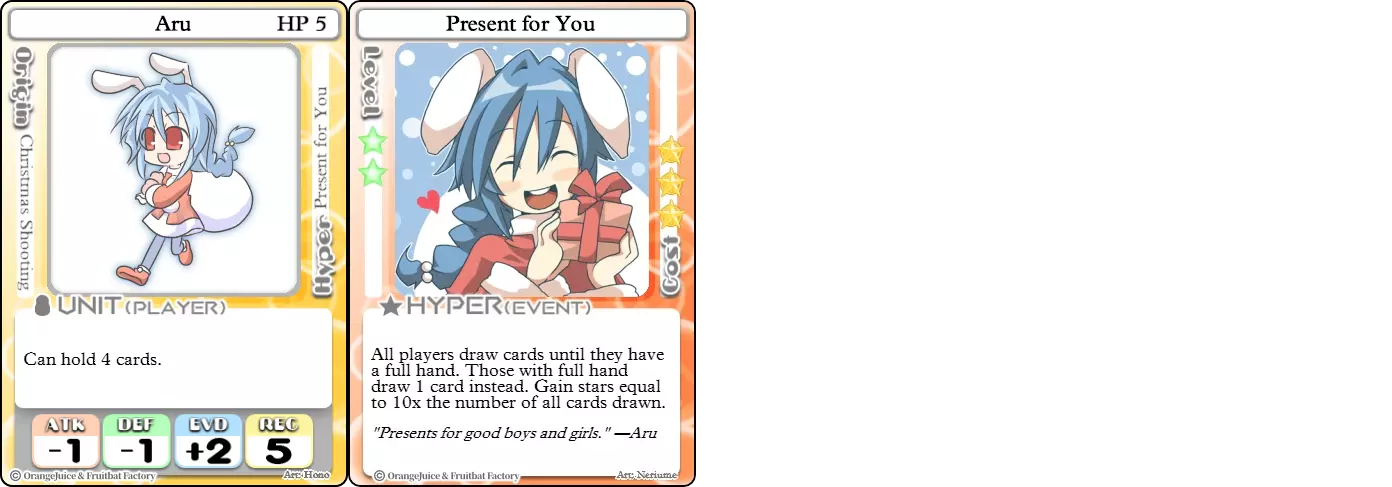 “我要让你见识一下我的圣诞魔法!” 难度:★★★☆☆ 职业:和平主义者 标签:辅助/收集者/生存 优势:随时间提升星星收集效率,闪避率出色 劣势:承受大量伤害,必须牺牲卡牌来生成星星,一次击倒可能导致游戏失败 阿鲁(混乱)的Hyper【圣诞任务】相比普通阿鲁的爆发式收集,提供了更稳定的选择——她通过每次赠送一张卡牌来换取星星。这使她成为一名速度慢得多的收集者,但也让她有可能随时间积累更多星星,并且可以阻止对手攻击她。这也意味着与原版阿鲁相比,她的翻盘潜力要低得多。KO时,Santa's Gift会丢失,因此她不仅需要找到另一个副本才能继续收集星星,而且由于对手已结束游戏,她之后通常也没有时间再收集星星。 Suguri(Ver.2)