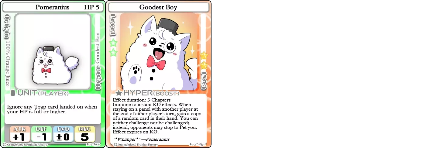 索拉:“呜,我不确定自己能不能表现得可爱。” 沙姆:“你当然可以!你超级可爱的!” 难度:★★★☆☆ 职业:和平主义者 标签:收集者/控制 优势:增强星星收集能力,超必杀技可保护星星不被窃取 劣势:超必杀技可被躲避,属性值不稳定 小可爱们可以使用索拉或沙姆的基础属性进行战斗,但这使得战斗不可靠且带有一定危险性。相反,她们应专注于另一个被动技能,该技能会奖励使用大量不同事件卡的行为。这样做能在游戏过程中永久提升她们的星星获取量,使她们成为强大的星星收集者。她们的超必杀技【特别舞台】是另一个星星收集工具,同时也能起到威慑攻击的作用。在数回合内,小可爱无法被攻击或选为目标,任何靠近它们的对手都将被迫向其支付星星。玩家在与小可爱交战时必须非常小心,因为它们可能随时发动【hyper】来保护自己,同时吸取攻击者的星星。由Yuuki提供