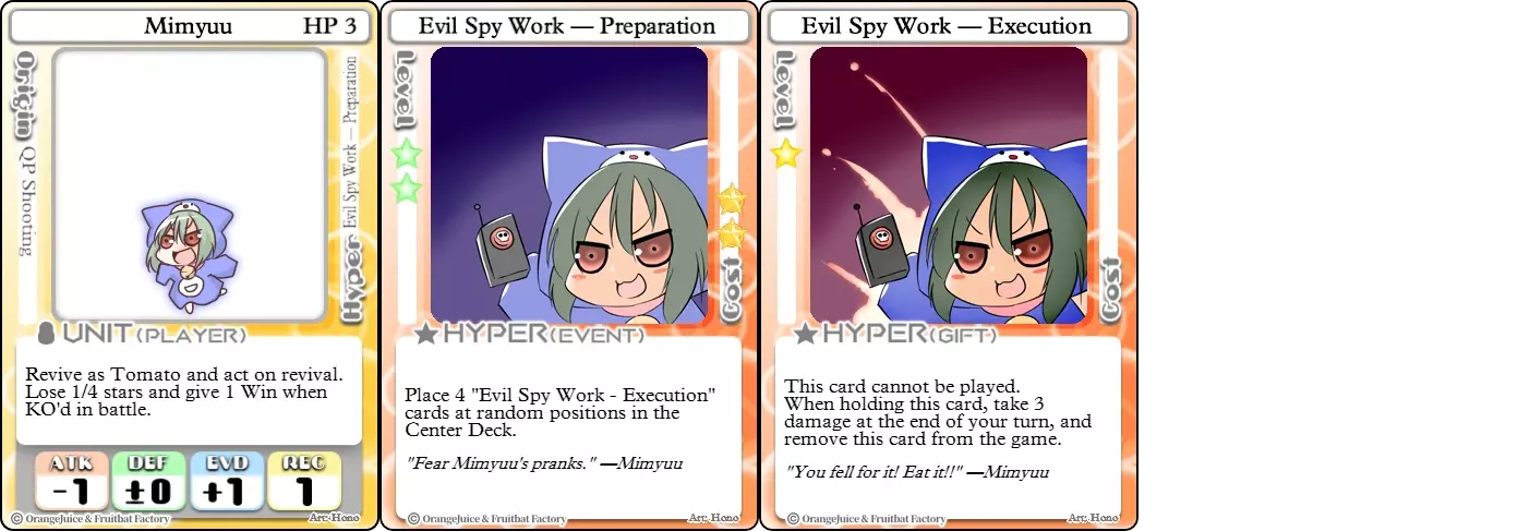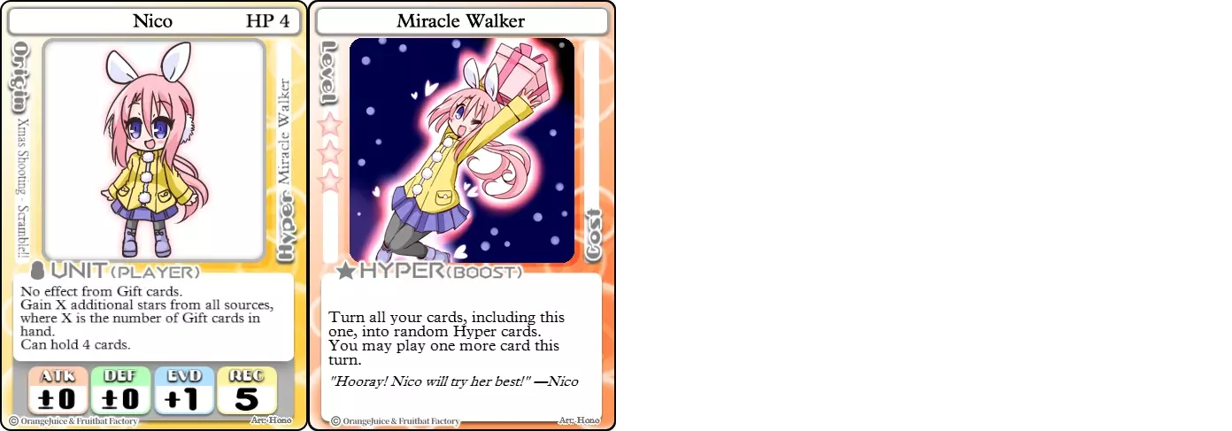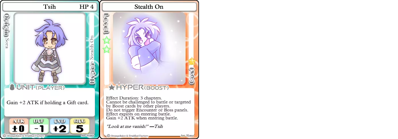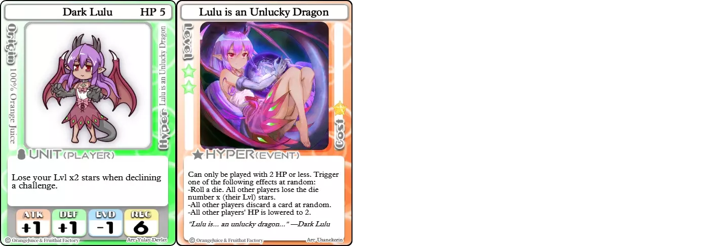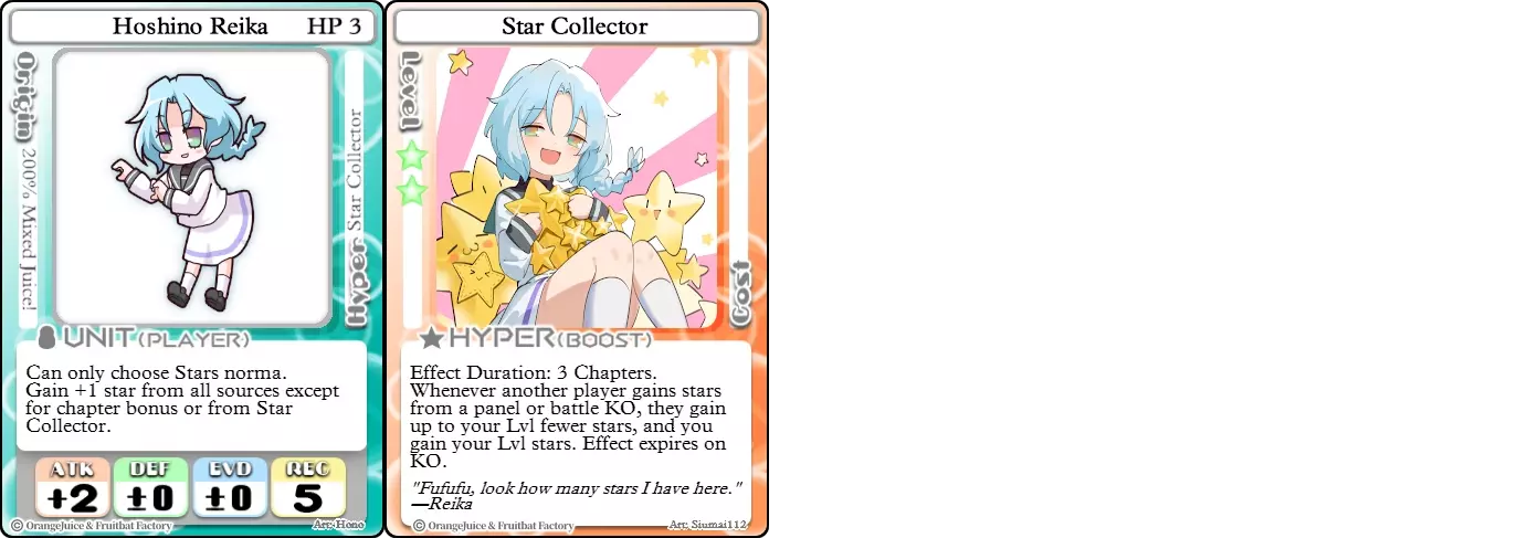 “所以这款游戏是关于收集星星的,对吧。” 难度:★★★☆☆ 职业:刺客 标签:收集者 优点:兼具星星生成能力和进攻能力的角色 缺点:生存能力极差 玲华是一个不能鲁莽行事的角色,因为她的生命值极低且缺乏内置防御手段。尽管生存能力较弱,但她是少数能将强化星星收集与强大进攻能力结合,从而快速达成星星胜利条件的角色之一。她的+2攻击力可以用来威慑对手,让她能在友方单位中周旋,直到找到机会将他们击败。然而,其他攻击性单位是她的克星,因为它们能在她有机会攻击前迅速将其击败并获取大量星星奖励,尤其是在战斗卡或间接伤害的帮助下。幸运的是,对于玲华来说,她的【超能力】让她即使在无人可见的地方游荡时,也能保持星星数量的领先。