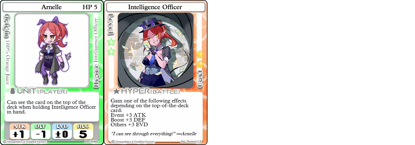 "寻宝之旅就此展开!" 难度:★★★☆☆ 职业:刺客 标签:爆发/卡牌优势 优点:可查看牌组顶端卡牌,使用【超能力】后能获得强大的属性加成 缺点:承受大量伤害,【超能力】依赖牌组构成 阿内尔是一名机会主义者,她会利用从牌组中侦察到的信息,通过自己的【超能力】做出经过计算的选择。尽管【情报官】是一张战斗卡牌,但其最强大的特性在于与阿内尔被动技能的联动。持有该卡牌时,阿内尔可以查看牌组顶端的卡牌,从而洞察对手的计划,并能从牌组中抽取重要卡牌。一旦获得机会,【情报官】便会成为消灭目标或保护阿内尔星星的强大工具。然而,对手单纯抽卡就可能改变其提供的增益效果,导致不理想的结果。卡组构筑对于提高HYPER技能获得正确卡牌类型的概率尤为重要,因为事件卡、强化卡和其他卡牌的比例不当,会使阿内尔难以获得合适的选择。梅妮