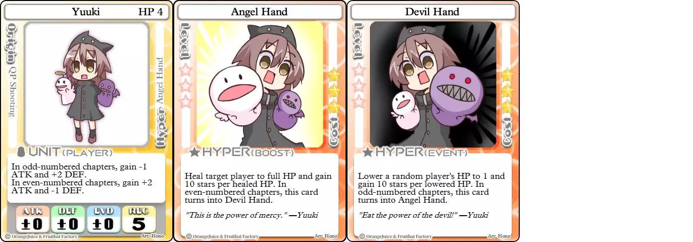 “中间那个是主体吗?” “你看到我们没注意到的东西了吗?” 难度:★★★★★ 职业:专家 标签:变形者/控制/收集者/支援/生存 优点:可攻可坦,超必杀技用途多样 缺点:被动技能令人困惑,对手可利用模式切换,恶魔之手不稳定 结城是一个难以驾驭的角色。每隔一个章节,结城就会在进攻型刺客和防御型坦克之间切换。同时管理这两种模式以及她超必杀技的两种形态可能会很棘手。天使之手适合通过治疗目标(甚至在紧急情况下治疗自己)来阻止对手。恶魔之手则让玩家进行一场俄罗斯轮盘赌,输家会被降至1点生命值。两张卡牌都会为她提供等同于生命值变化量的星星,因此将它们用于高生命值的单位或使用【总统特权】会为她带来大量星星。使用优纪需要有很强的前瞻性,因为你不仅要根据她的形态来规划行动,还得预测对手会如何针对她进行操作。