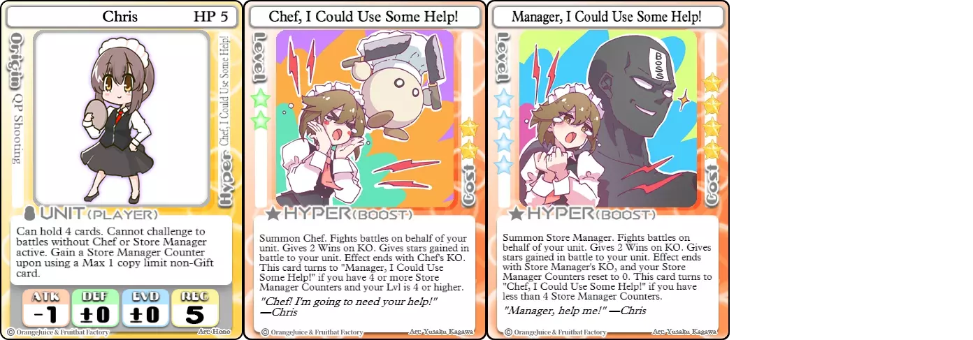 生命值:4 | 攻击力:+3 | 防御力:+2 | 闪避:-1 | 恢复:— “我警告你:他相当强!” 难度:★★★☆☆ 职业:专家 标签:大师/变形者/部署/生存 优势:随从为你战斗并保护星星 劣势:基础属性较弱,无随从时无法发起战斗,随从无法使用战斗卡牌 克里斯是一名独特的角色,她可以让随从长时间代其作战。厨师是一个相对廉价的选择,能保护克里斯的星星并发起进攻。商店经理成本更高且需要更多部署,但也能提供更大的属性加成。克里斯的两个召唤物仅在击倒敌人时获得胜利,因此它们非常擅长保护她的星星,甚至能让她与对手争夺位置,否则这将是自杀式的行为。然而,如果没有厨师或经理的配合,克里斯就是一个表现平平的单位,其最大缺点是无法主动对其他玩家发起战斗。不要低估一个攻击力-1的单位通过战斗来调整位置或消灭受伤对手的频率。此外,召唤物由AI控制,克里斯无法使用战斗或治疗卡牌来帮助它们。这使得召唤物只能自生自灭,生死完全由AI掌控。 哈莱娜