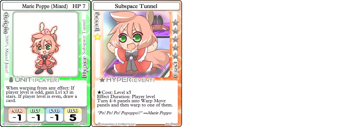 “噗啾噗啾噗噗~” 难度:★★★☆☆ 职业:和平主义者 标签:机动性/收集者/卡牌优势 优点:高生命值和机动性,通过传送获得加成 缺点:依赖地图,承受大量伤害,翻盘能力低 混合型玛丽·波普是常规波普的传送特化版本。每次传送时,她会根据自身等级获得星星或抽一张卡牌。在拥有大量传送面板的地图上,混合型玛丽·波普很难被追上,因为她能快速获取星星和卡牌。即使地图对她不利,她的Hyper【亚空间隧道】也能用来创造属于自己的传送移动面板,以便逃脱并从中获益。 军事型空