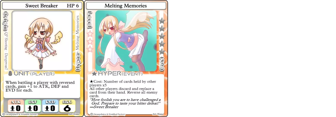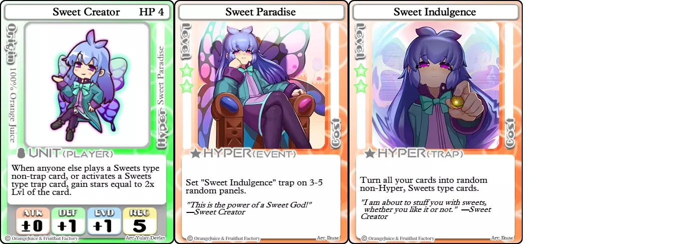 “如巧克力般融化。” 难度:★★★★☆ 职业:全才 标签:控制/布局 优势:属性均衡,超必杀能大幅削减对手手牌,反转卡牌可提供巨额战斗加成 劣势:依赖卡牌,超必杀消耗高,REC值高 甜蜜破坏者的中性属性让她能像QP一样使用各种卡牌。但与QP不同的是,甜蜜破坏者的超必杀特性使其更专注于控制对手。【融化记忆】会反转所有对手的卡牌,让你知晓他们的手牌,同时阻止他们查看自己的卡牌。由于甜蜜破坏者会根据对手拥有的每张反转卡牌获得+1的所有战斗属性,这会让对手陷入要么清空手牌,要么冒着被愤怒的甜蜜之神击溃的境地。