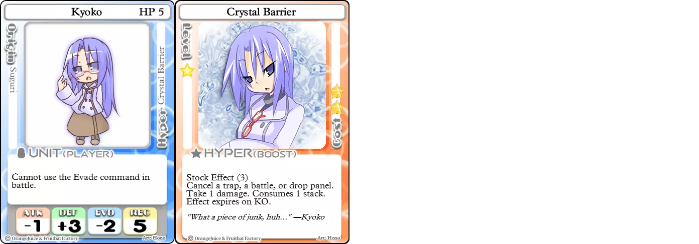 来试试你能否打破我的屏障。 难度:★★☆☆☆ 职业:坦克 标签:生存/防御 优势:游戏内最高防御力,可强力破坏陷阱,能自我击倒 劣势:无法闪避,翻盘能力弱 京子无疑是游戏中防御能力最强的角色。她较低的攻击力和完全无法闪避的特性,使得她在没有治疗卡牌的情况下,既难以造成伤害,也难以比对手更持久。由于反向属性领域会对她造成严重克制,她甚至无法利用该技能发动突袭。不过,她拥有游戏内最高的防御属性,这使她在减伤能力方面无人能及。将其与【水晶屏障】结合使用,该技能能保护她免受陷阱伤害,还可用于自我击倒。因此,一旦京子取得优势,就会成为极难被击败的角色。