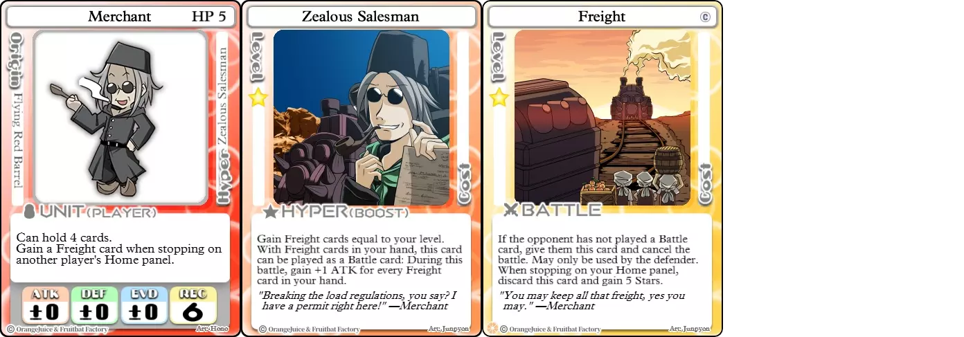 “要是你觉得我的列车容易得手,那你可就大错特错了!” 难度:★★★☆☆ 职业:和平主义者 标签:收集者/生存/卡牌优势/爆发 优点:可多次回避战斗,额外星星收集,惊喜攻击力提升 缺点:属性平庸,对抗弃牌和大多数战斗卡牌时非常弱势 商人是个满脑子金钱的滑头家伙。除了较高的回复能力外,他的属性还算不错,但他有很多手段来阻止对手获取他的星星。这些手段全都是【货运】卡牌。这些战斗卡牌可用于阻挠攻击者,或者在自己的基地兑换少量星星。商人可通过他的Hyper【狂热推销员】或踩中其他玩家的基地来获得这些卡牌。虽然货运能力能有效牵制对手,但任何战斗卡牌都会抵消货运效果,使商人暴露在火力之下。此外,像【混乱夏娃】和【火焰喷射器】这类弃牌效果对他来说可能是灾难性的。孤胆骑手