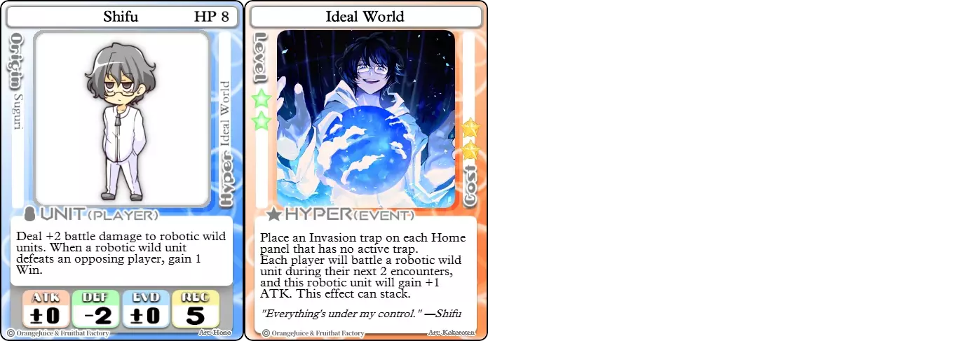 “打扰一下,我只是个普通的手无寸铁的人类。” 难度:★★★☆☆ 职业:和平主义者 标签:大师/陷阱师 优势:可从NPC机械球处被动获得胜利,可从任意位置在家中放置陷阱 劣势:战斗中承受大量伤害,会在自己家中设置超级陷阱 尽管师父拥有大量生命值,但他极差的防御力使其成为游戏中最容易被欺负的角色之一。即使是中立角色,如果他在战斗中运气不佳,也能对他造成大量伤害。避开其他玩家收集星星应该是他的首要任务,不过对于那些想要冒险的勇敢玩家来说,他的技能组合确实为获取胜利留下了空间。 师父可以利用他的机械球大军来获取胜利,并给对手制造麻烦。像【叽叽游行】和【入侵】这样的卡片,再加上他的超必杀技【理想乡】,创造了许多与机械球交战的机会。他对NPC机械球有+2的伤害加成,这使得任何命中的攻击都能造成即时KO,即便是在宠物零食的加成下也是如此。不过,他对自己的【入侵】陷阱没有免疫力,这意味着如果他踩到自己的【入侵】陷阱,机械球会优先发动攻击,然后他才有机会反击。他也可能会打偏,因为他0点的攻击力本身对他造成致命一击并没有太大帮助。 星野礼香