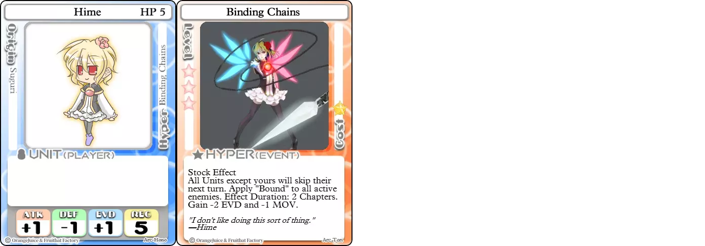 “那么,我们来好好享受一下吧?” 难度:★★☆☆☆ 职业:游击手 标签:控制 优点:拥有不错的生命值和攻击力,超必杀技可反制闪避并消耗对手时间 缺点:承受伤害较高 姬是一名反游击手型游击手。尽管生存能力稍弱,但她是一位操作简单的进攻型角色,擅长利用超必杀技牵制对手。束缚之链是一张限制玩家移动的优秀卡牌,能有效克制依赖闪避的单位。再加上她+1的攻击力,足以击杀和平主义者以及其他依靠闪避来弥补自身生命值和防御力不足的游击手。束缚之链还能很好地消耗对手时间,迫使他们错过事件,或为姬提供追赶的机会。 空