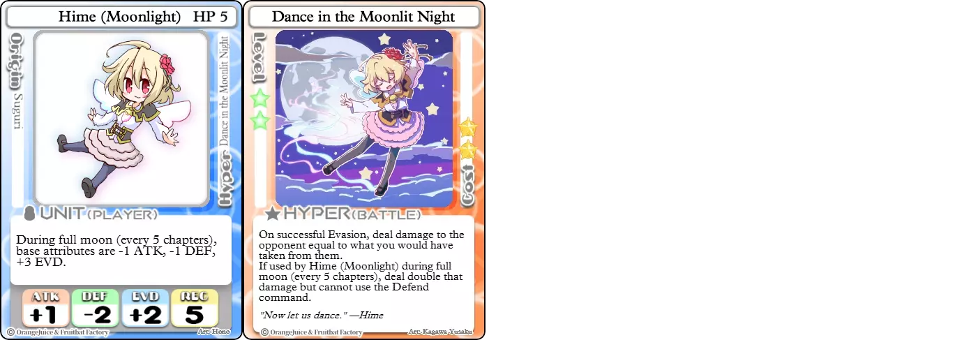 “我超擅长闪避,不是吗?” 难度:★★★☆☆ 职业:游击手 标签:爆发/变形者 优势:高闪避,超必杀能造成大量伤害 劣势:非常脆弱,满月技能有明显前摇 姬(月光)将“闪避或死亡”的+2闪避座右铭贯彻到底。由于-2防御,姬在选择战斗对象时需要非常谨慎。高攻击的角色会让她的闪避变得十分困难。【月夜之舞】是一个强大的战斗技巧,尤其在满月期间。只要能成功闪避,无视对手防御和闪避直接造成战斗伤害的效果非常强力。满月会为她提供更高的闪避值,同时使该技能伤害翻倍,但也会有明显的前摇。在满月期间与对手交战时,她容易受到【反转属性领域】、【欺诈缴械】或其他反击类战斗卡牌的压制。 菲内特(贵族)